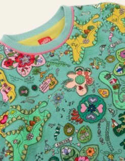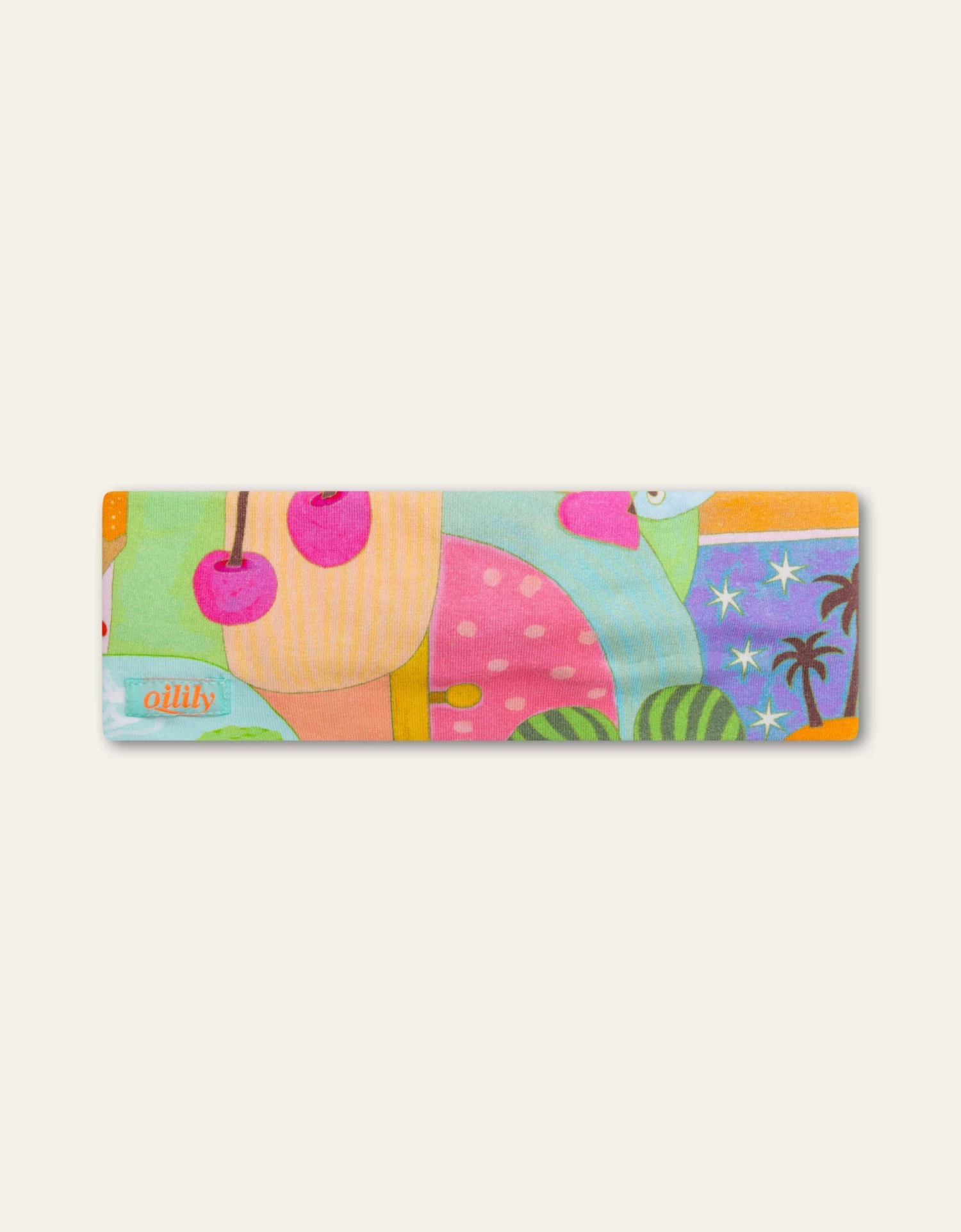 Op een colourblocked achtergrond tekenden we allerlei vrolijke dingen zoals fruit, zeemeerminnen en bloemen, dat staat vast heel gezellig samen in je haar. De haarband met dessin Fiesta heeft een gedraaide knot.