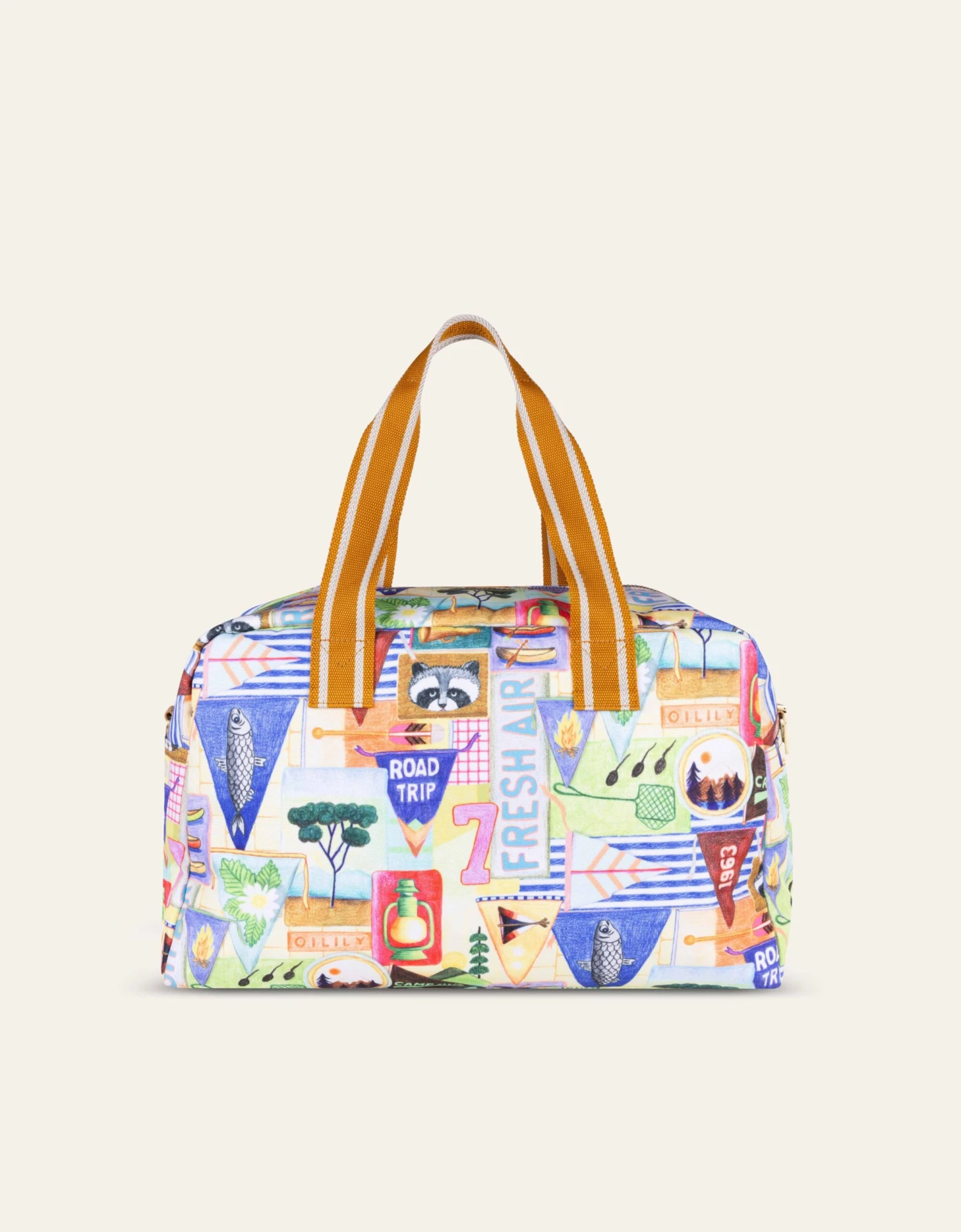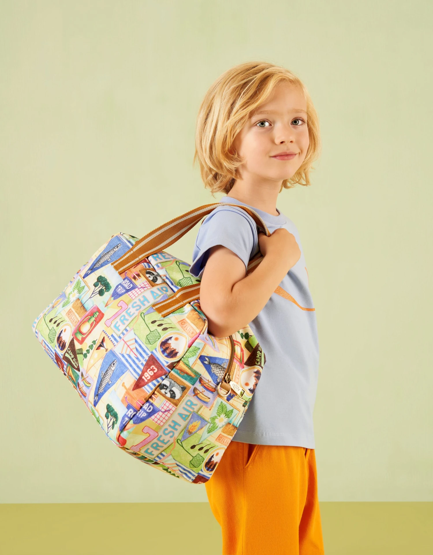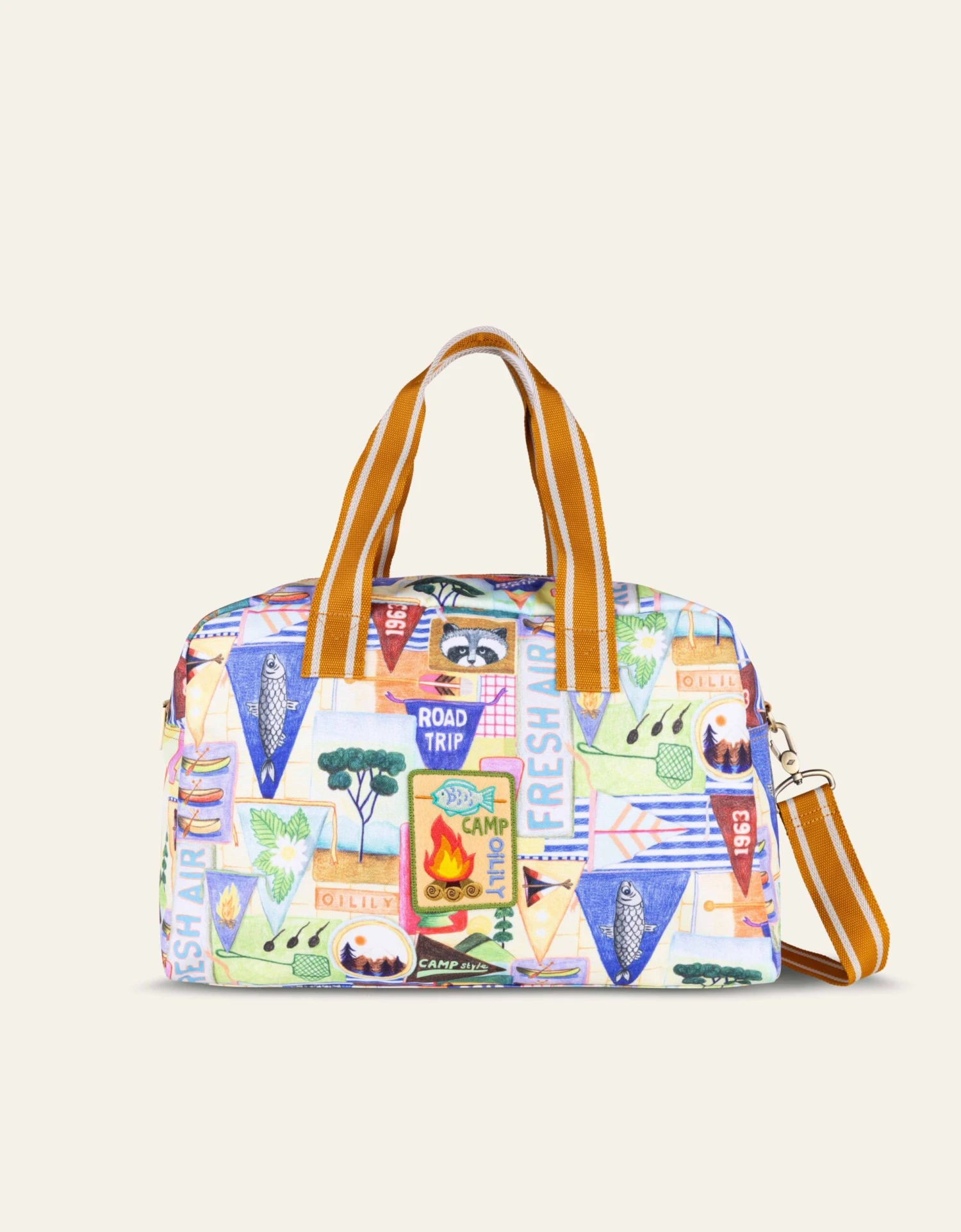Alle elementen van een echte scout zijn terug te vinden op deze tas! Hiking, camperen, vissen en kampvuren maken.