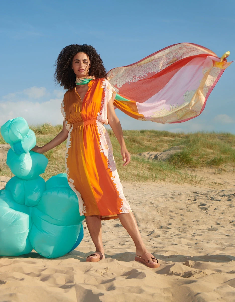 De zachtheid van de Lucia Flowers met de krachtige colourblocking zorgt voor een speelse combinatie op deze katoen met zijde sjaal.