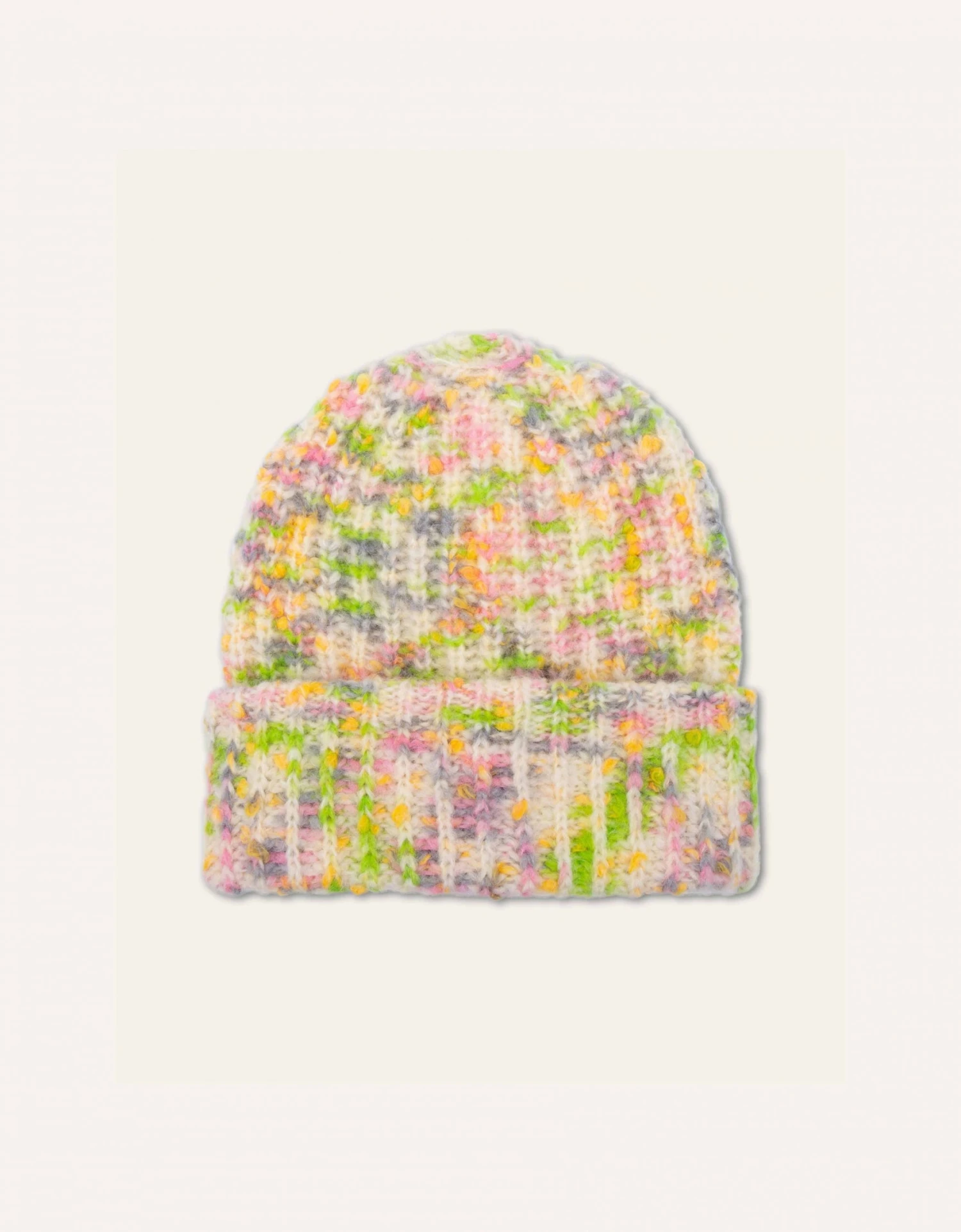 De speelse melange van kleuren en wolsoorten maken deze muts een gezellige, warme toevoeging aan je garderobe.