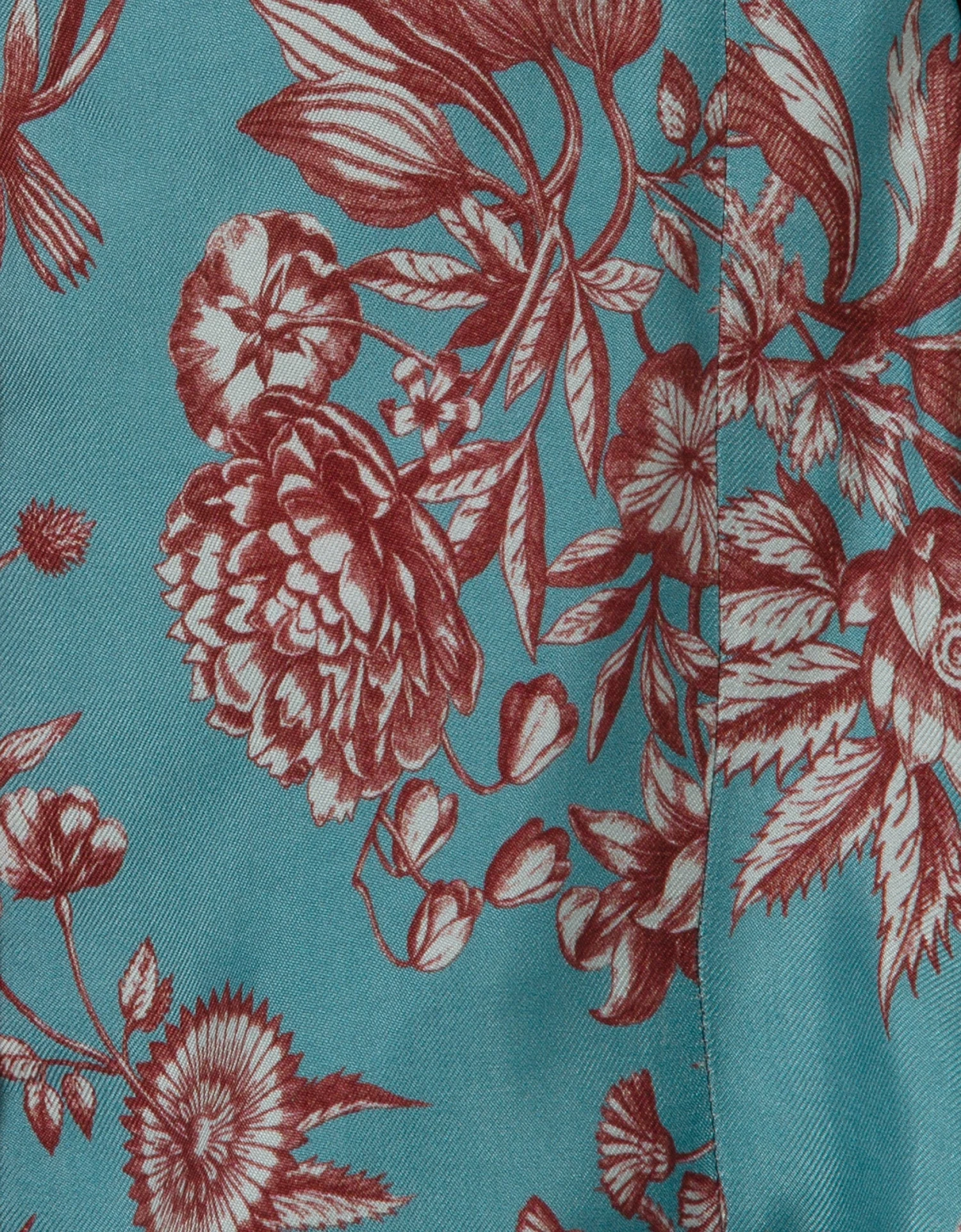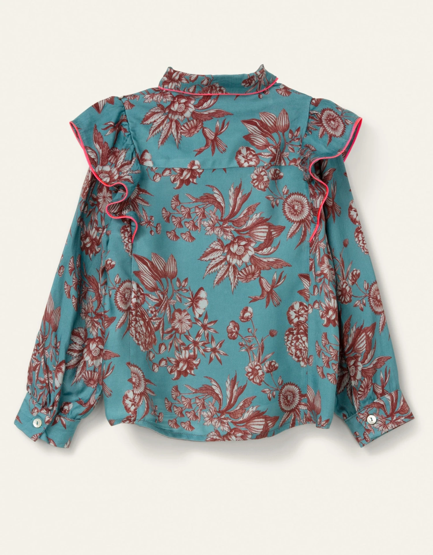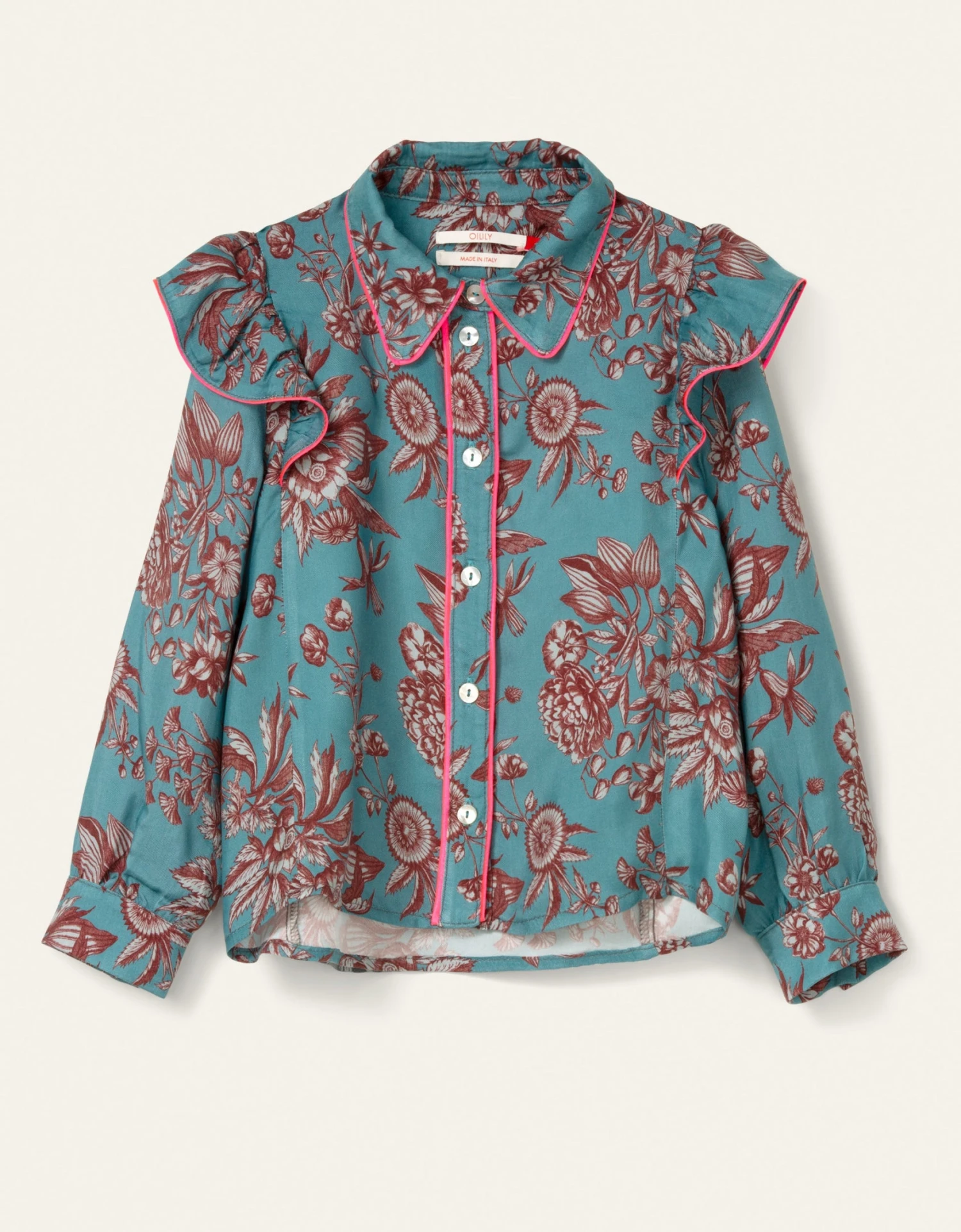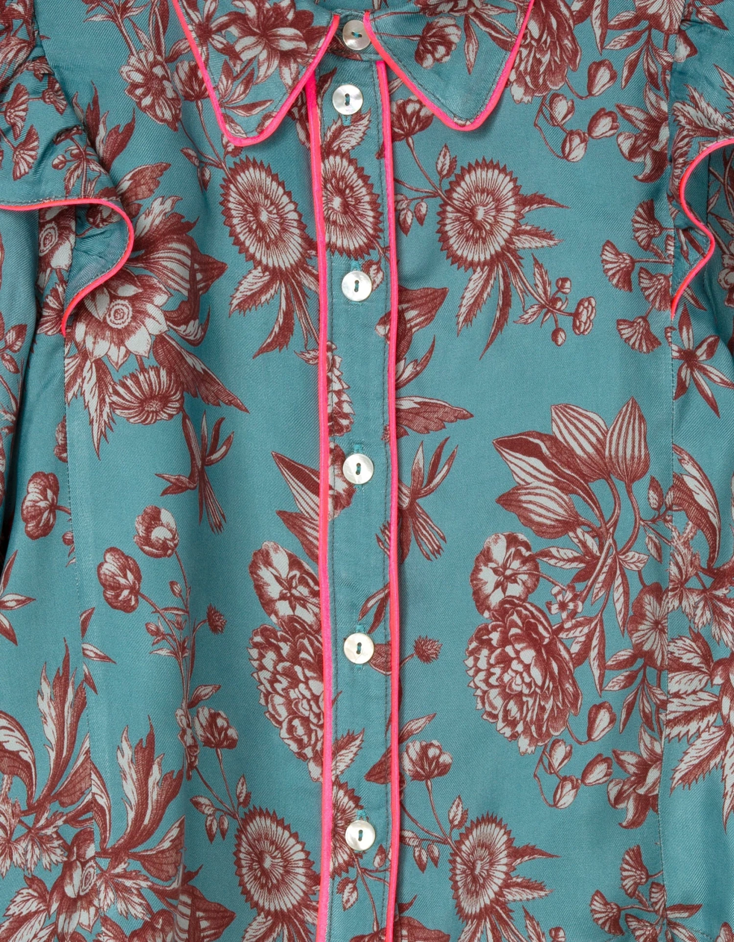 Deze mooie bloemenprint is handgemaakt door ons eigen designteam, geprint en gemaakt in Italië. Vind je ‘em niet bellisima? Het ruchewerk bij de schouders, de charmante knalroze belijning bij de kraag, plooien en om de rij Mother of Pearl-knopen, zorgen ervoor dat deze Bada blouse helemaal badaboom is!