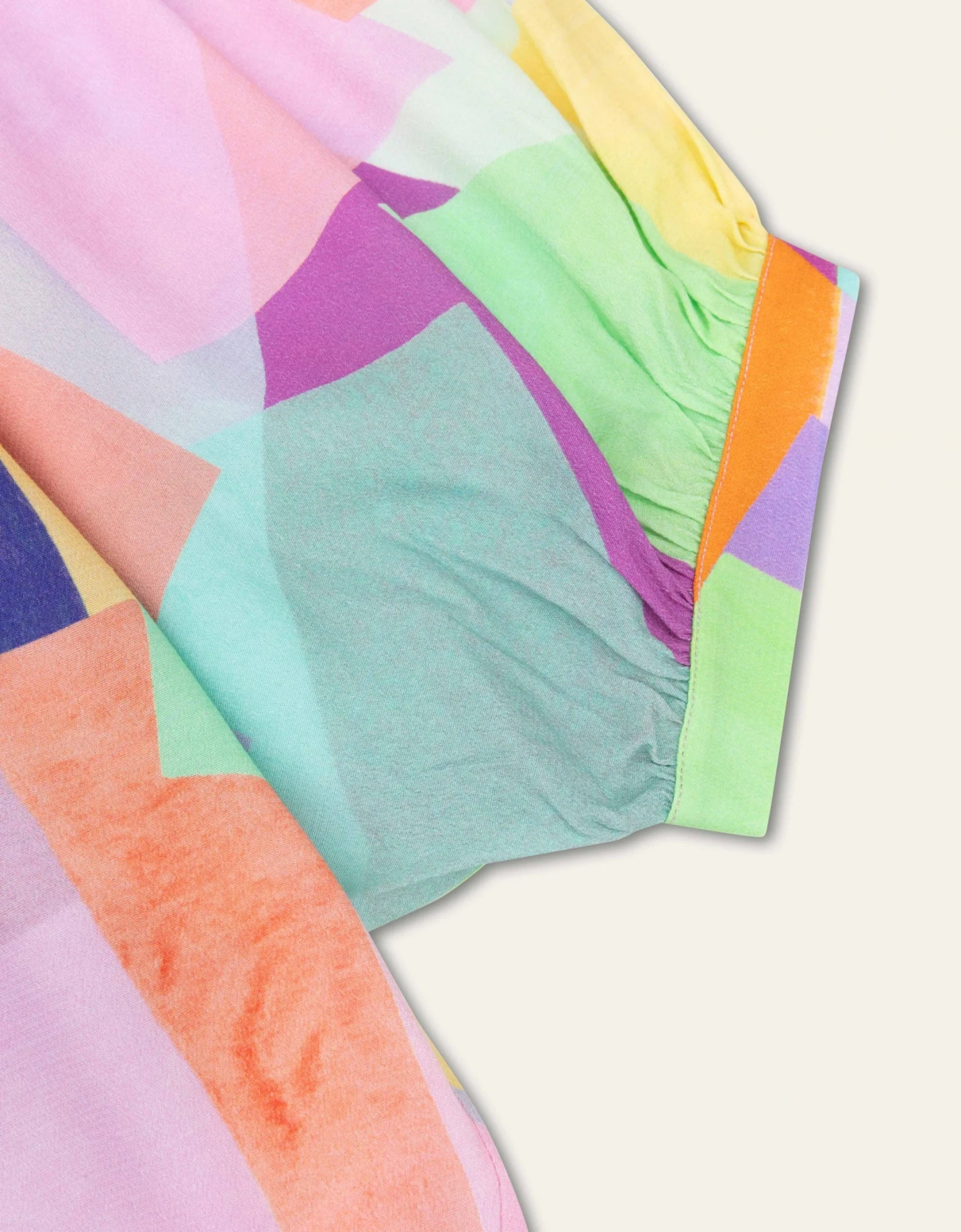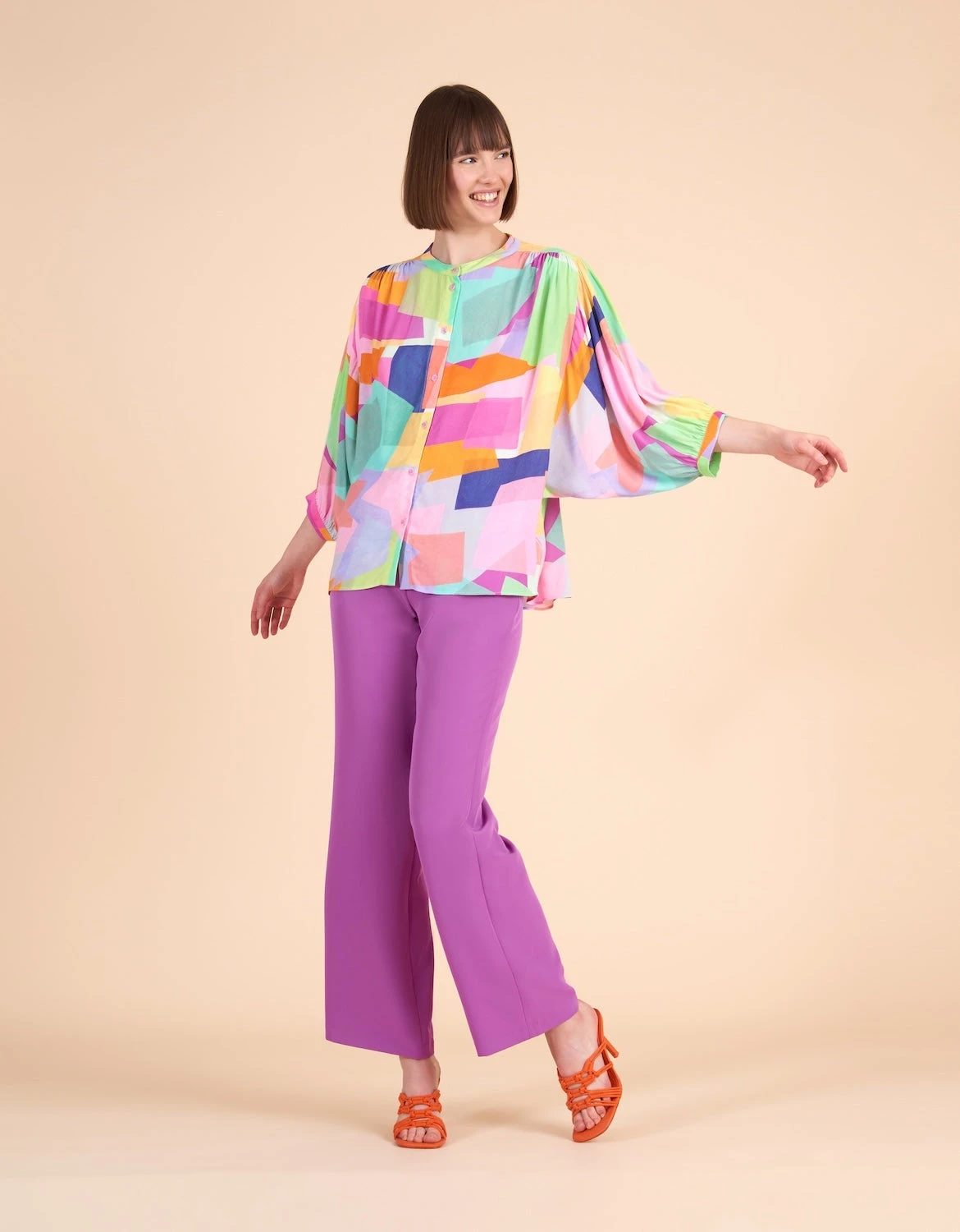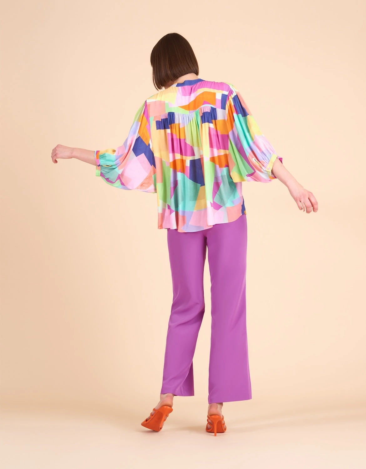 Het dessin Super Saturation is gemaakt van een collage van gekleurde vlakken. Dit geeft diepte aan deze blouse. De oversized fit met batwing mouwen en de gathering van plooien aan de achterkant en op de schouders zorgen voor vrouwelijke speelsheid.