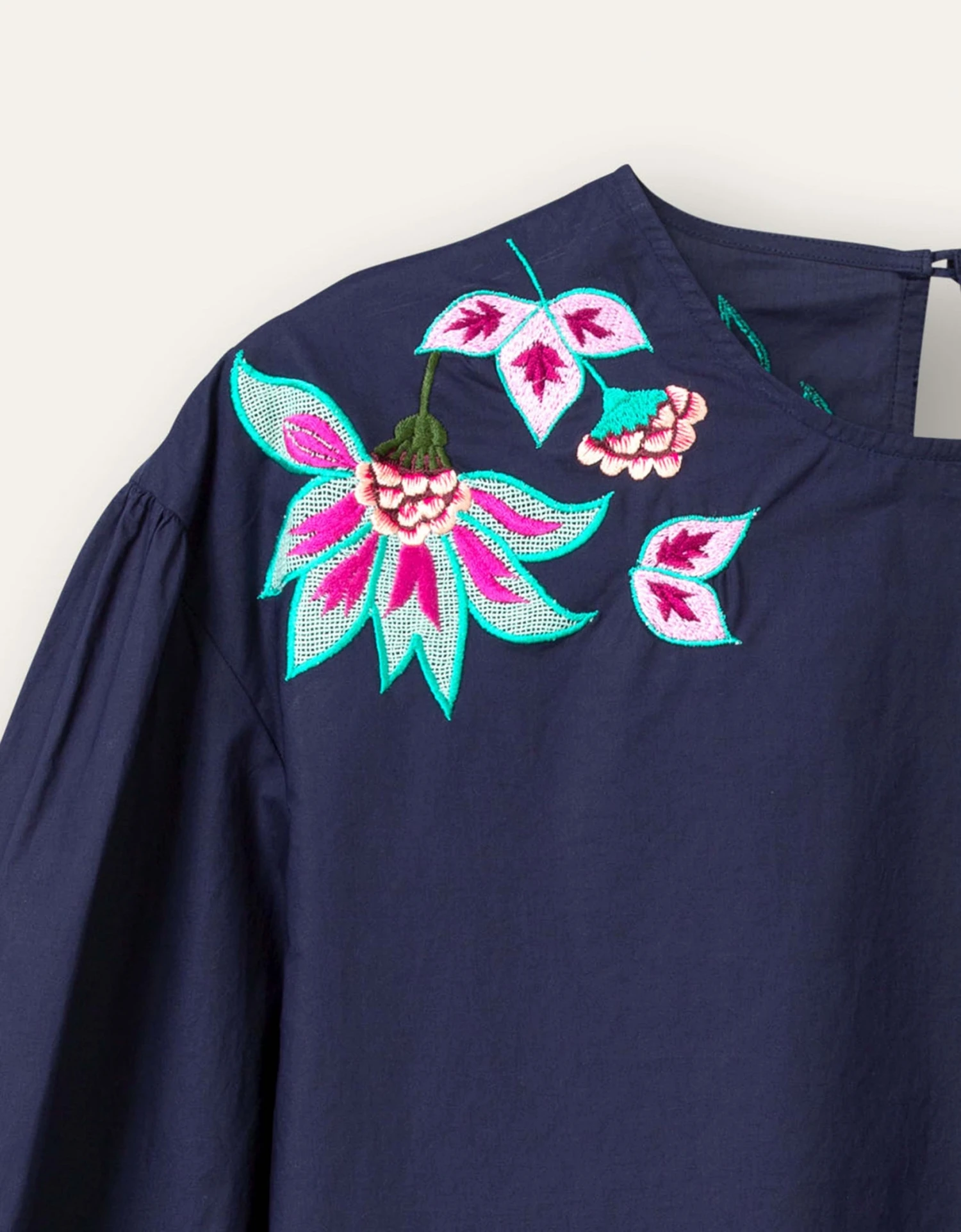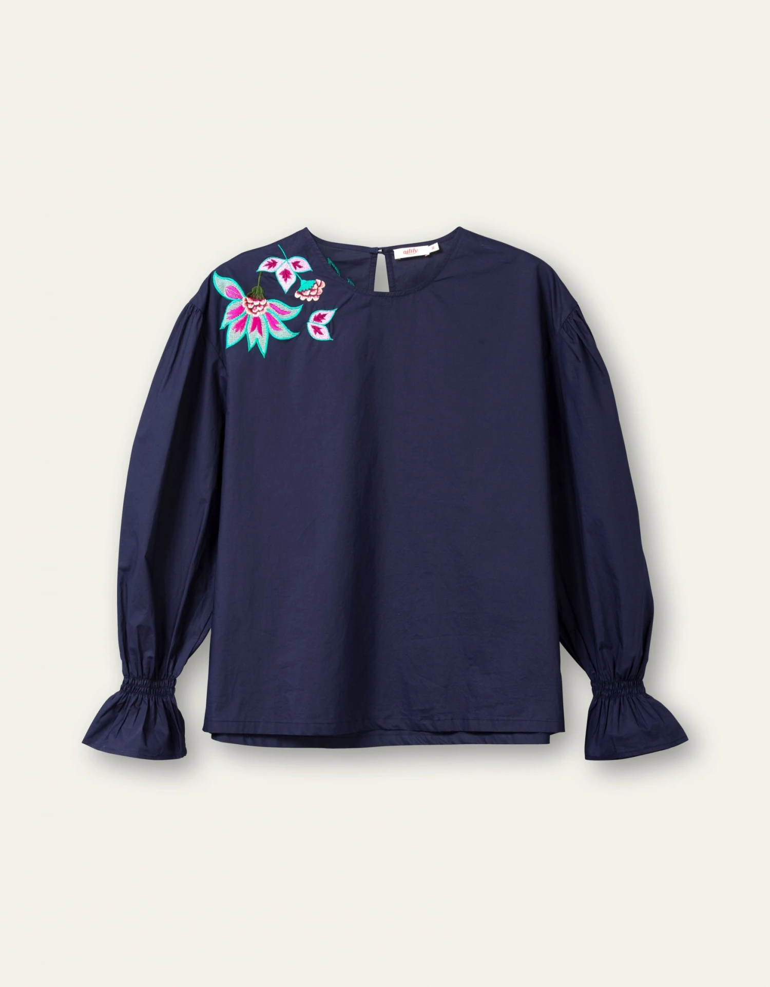 Van onze rijke Sonata print namen we een element en borduurde deze op de schouder die helemaal van voor naar achter doorloopt. Deze top is gemaakt van oh zo zacht katoen met elastiek in de manchetten voor een smock-effect. Met knoopsluiting in de nek.