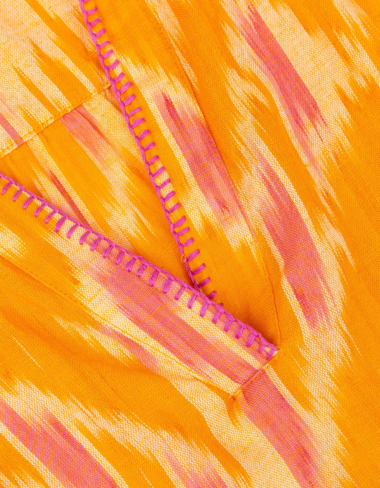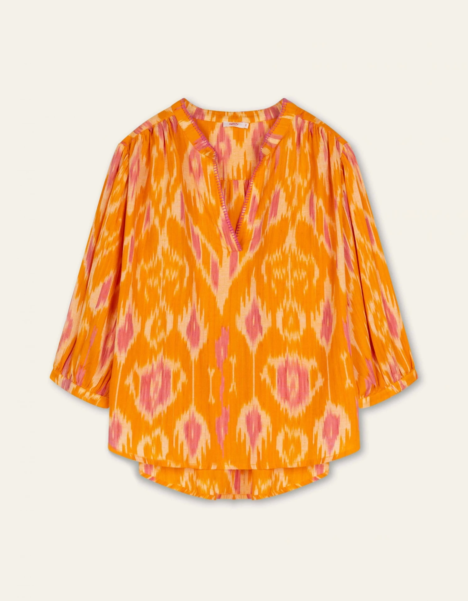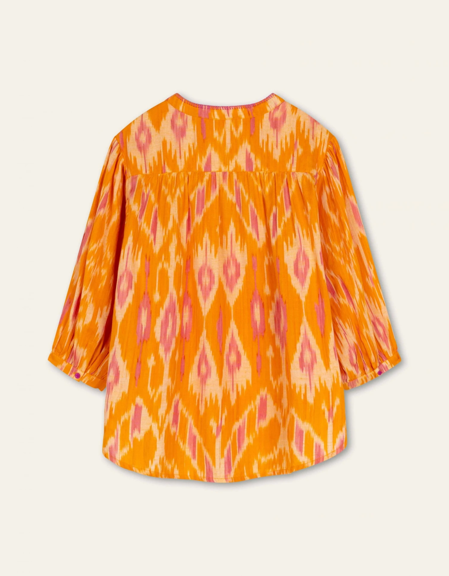Zonnige Ikat tuniek blouse met blanket stitches rondom knoopjes en boord – dat zijn zichtbare steken die een stoer accent geven.