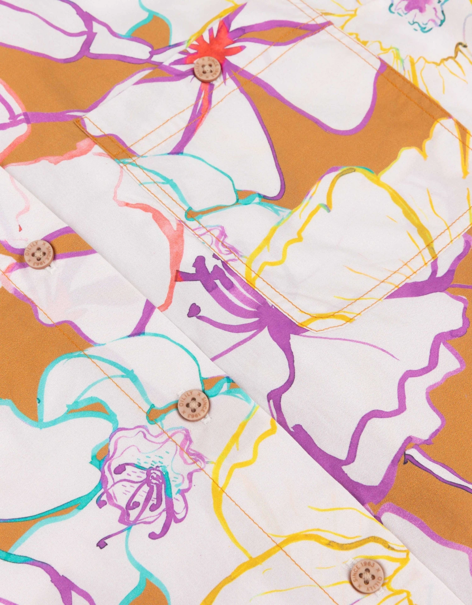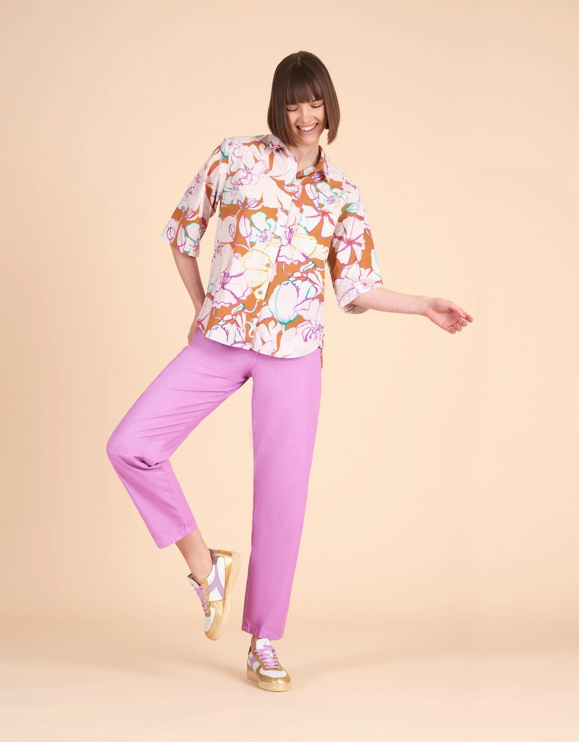 Dit dessin, Floral Hemera, is net even anders want de bloemen zijn wit, de rest is ingekleurd. De blouse heeft wat verlengde korte mouwen en recht model.