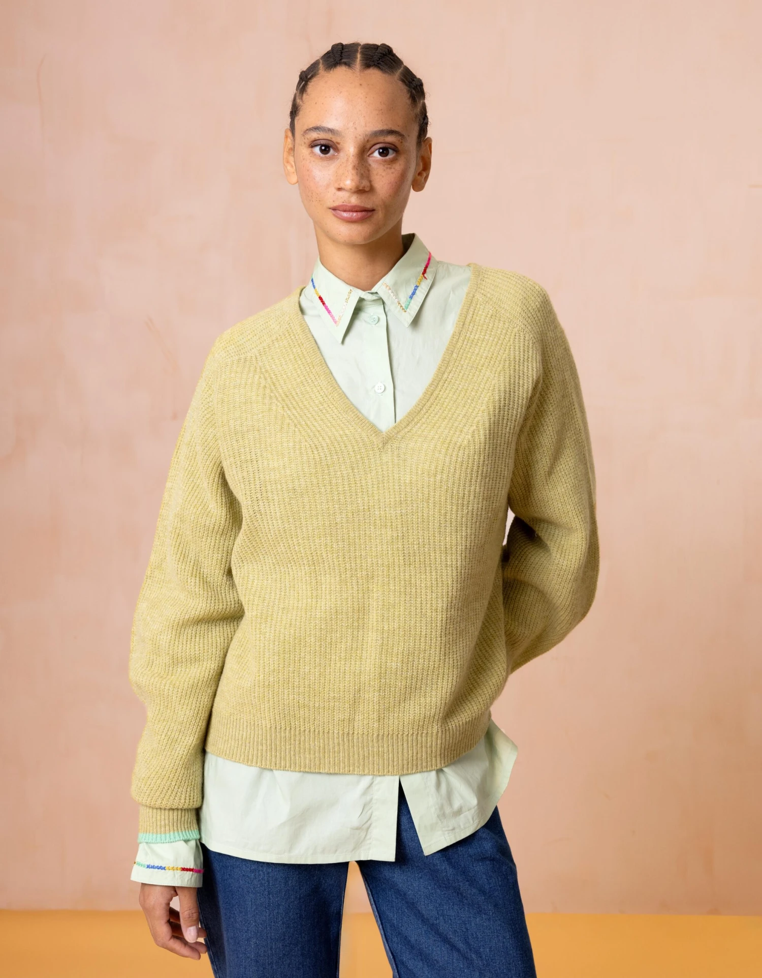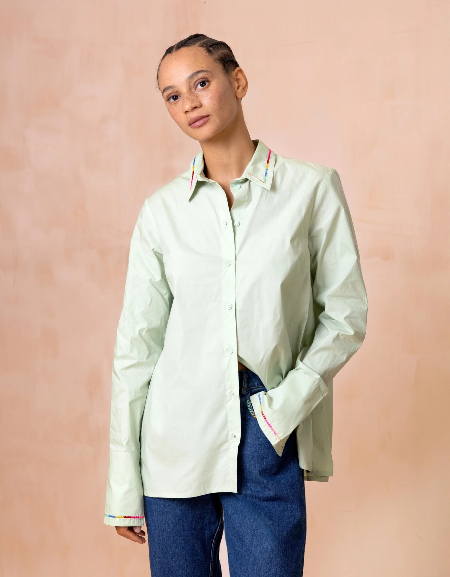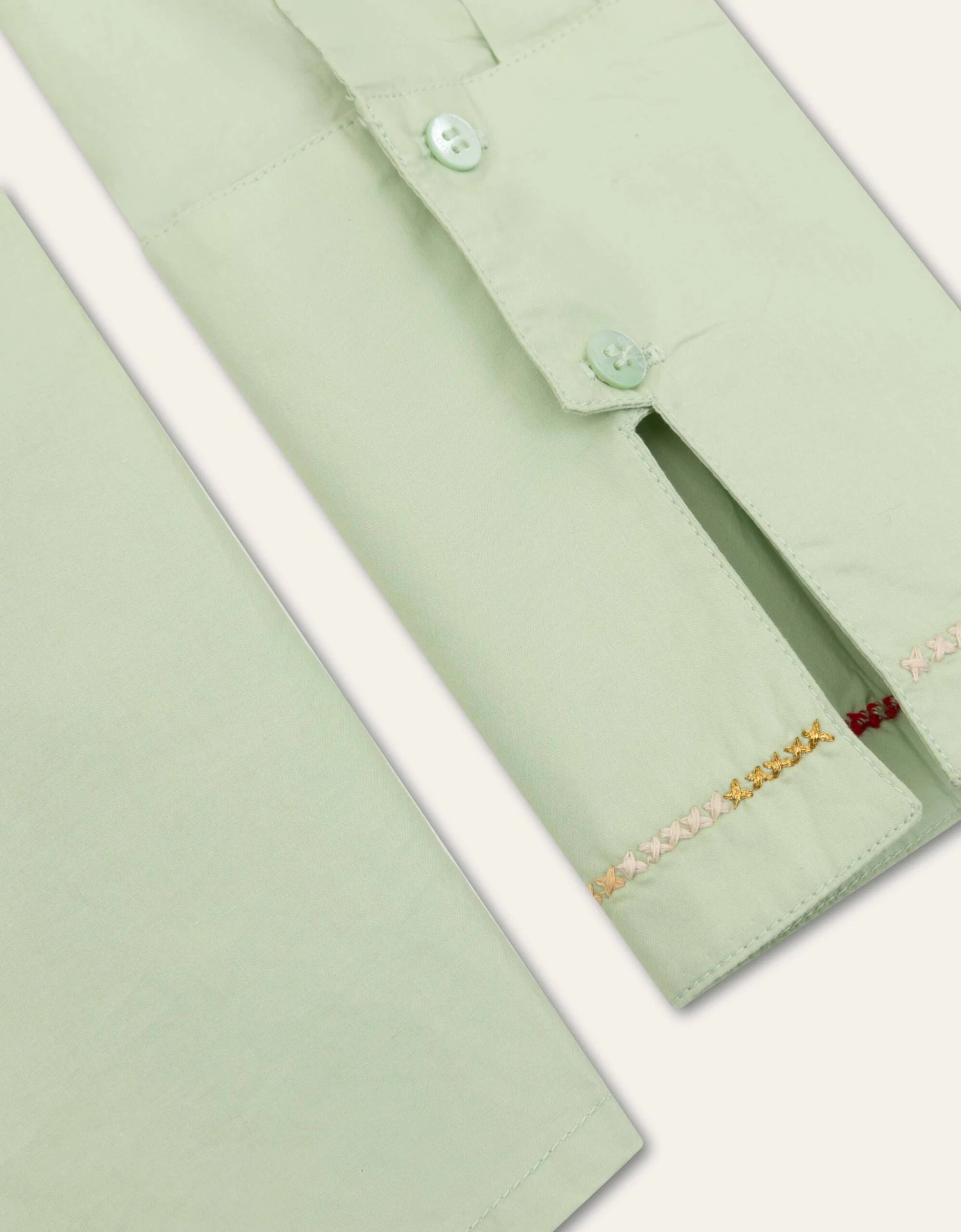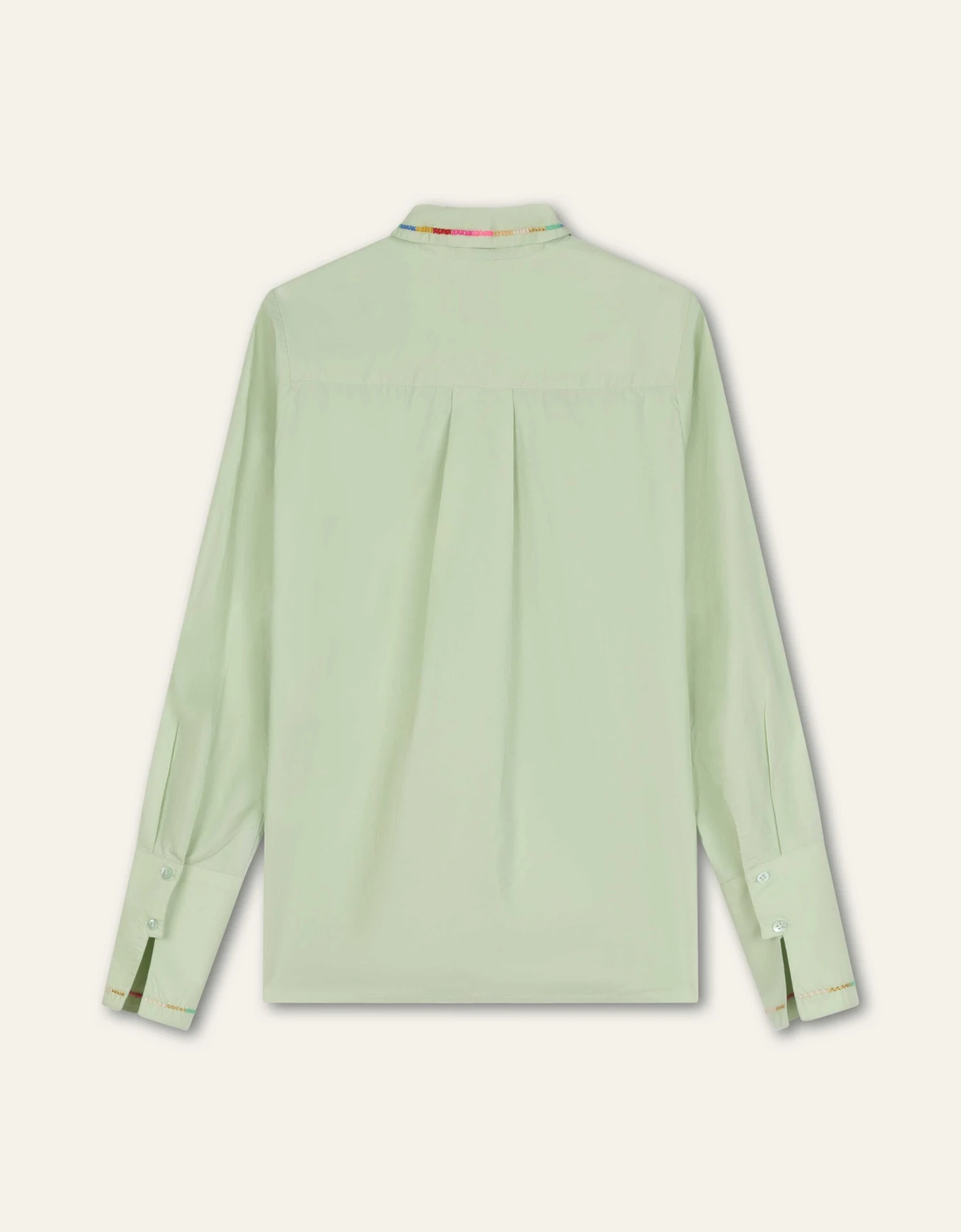 Smoked Green is de naam van de frisse kleur van deze getailleerde blouse. Je vindt prachtige geborduurde details op de puntkraag en lange manchetten met kleine splitten.