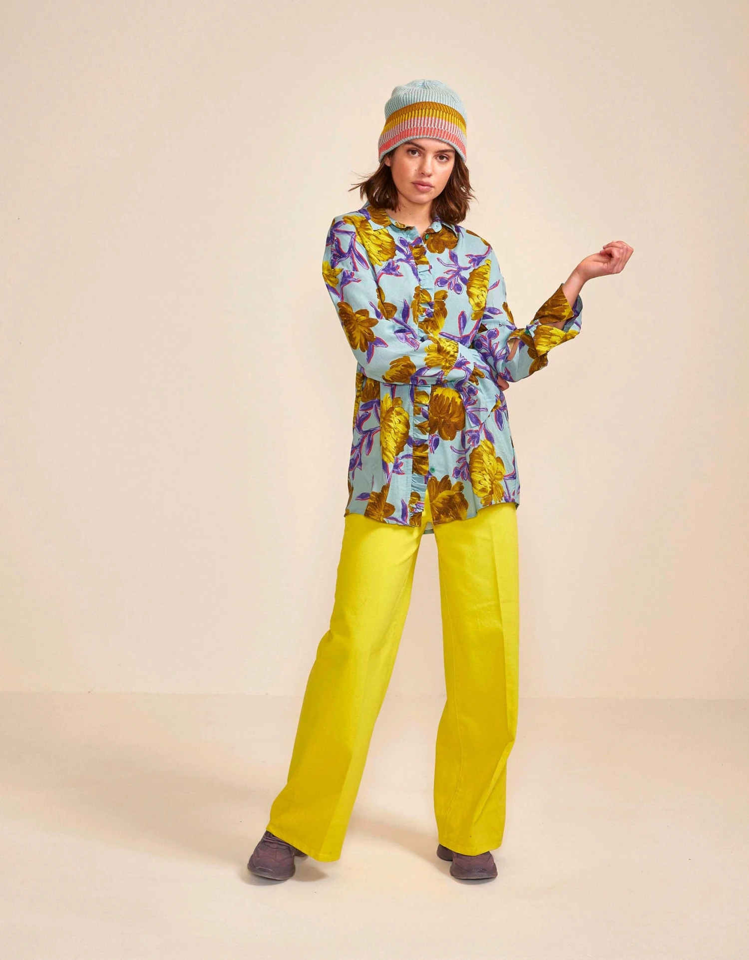 Onze liefde voor bloemen is oneindig. Met deze blouse vieren we de pioenroos en laten haar nog meer stralen met het gebruik van glitter lurex yarn. Deze blouse heeft ruches over de knoopjes, speelse mouwen met wijde manchetten en een loose fit. – Viscose – Loose fit – Gemaakt in Portugal