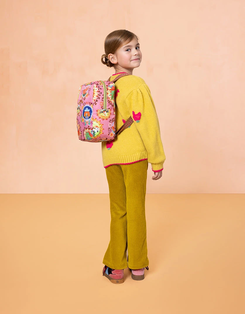 Op elke afbeelding van de print Maddy ontdek je iets nieuws. Het is een remake van een eerder ontwerp. Herken je het meisje lily, de eekhoorns, de smileys en de kleurrijke kippen?