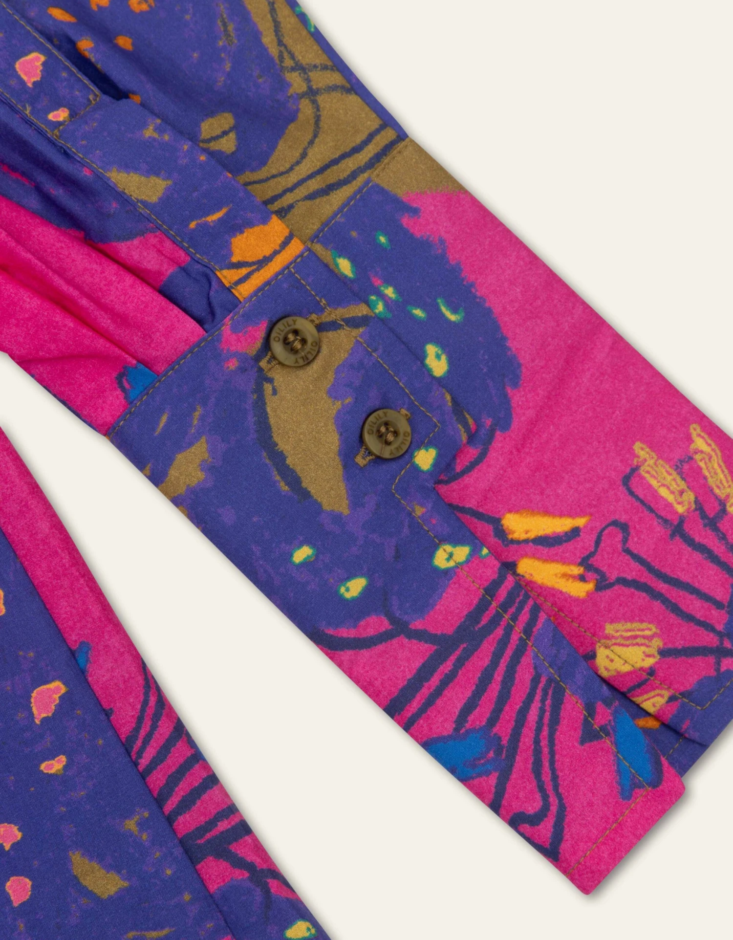 Giselle is een dessin van met krijt getekende bloemen op een achtergrond van grote kleurvlakken. Een speelse combinatie die mooi past bij deze kantoen-zijden blouse met lange manchetten met splitjes.