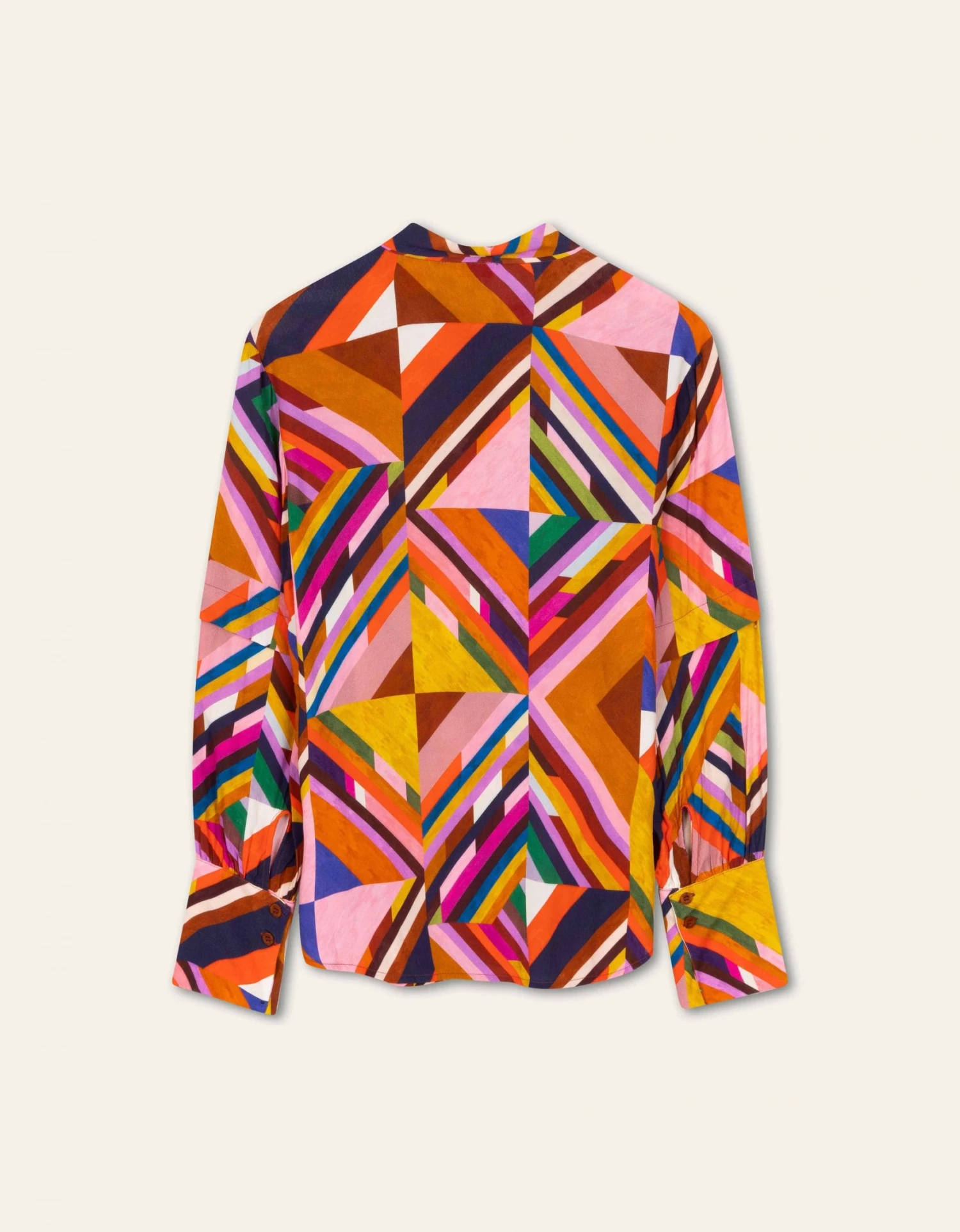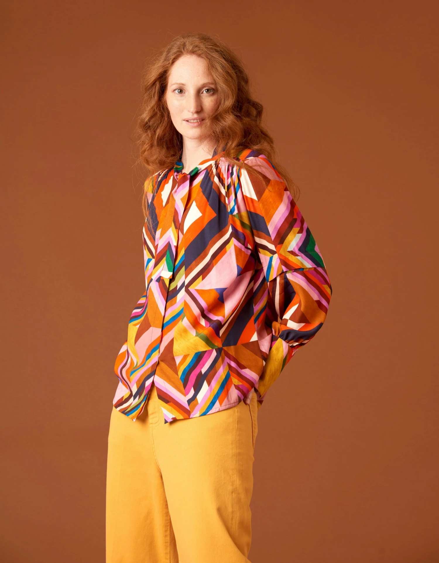 De creatie van het dessin A Happy Track kwam tot stand door de vormen met de hand te tekenen en in te kleuren. Het dessin is speels, heeft diepte en prikkelt de fantasie. En het komt helemaal tot zijn recht op deze blouse met striksluiting, gathering op de schouders en een extra aanzet op de mouwen. De knopen hebben een blinde sluiting en de mouwen lange manchetten voor een elegante look.