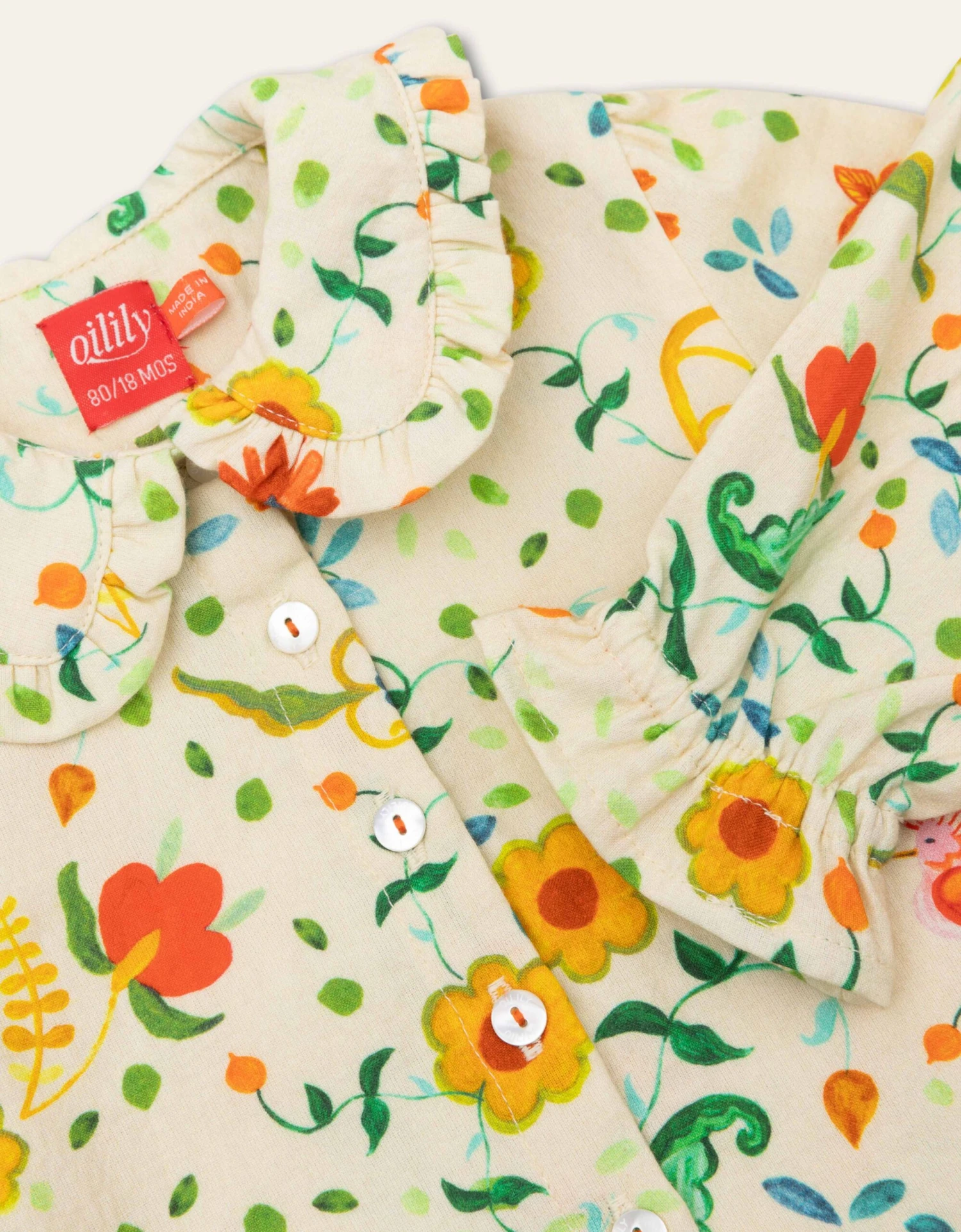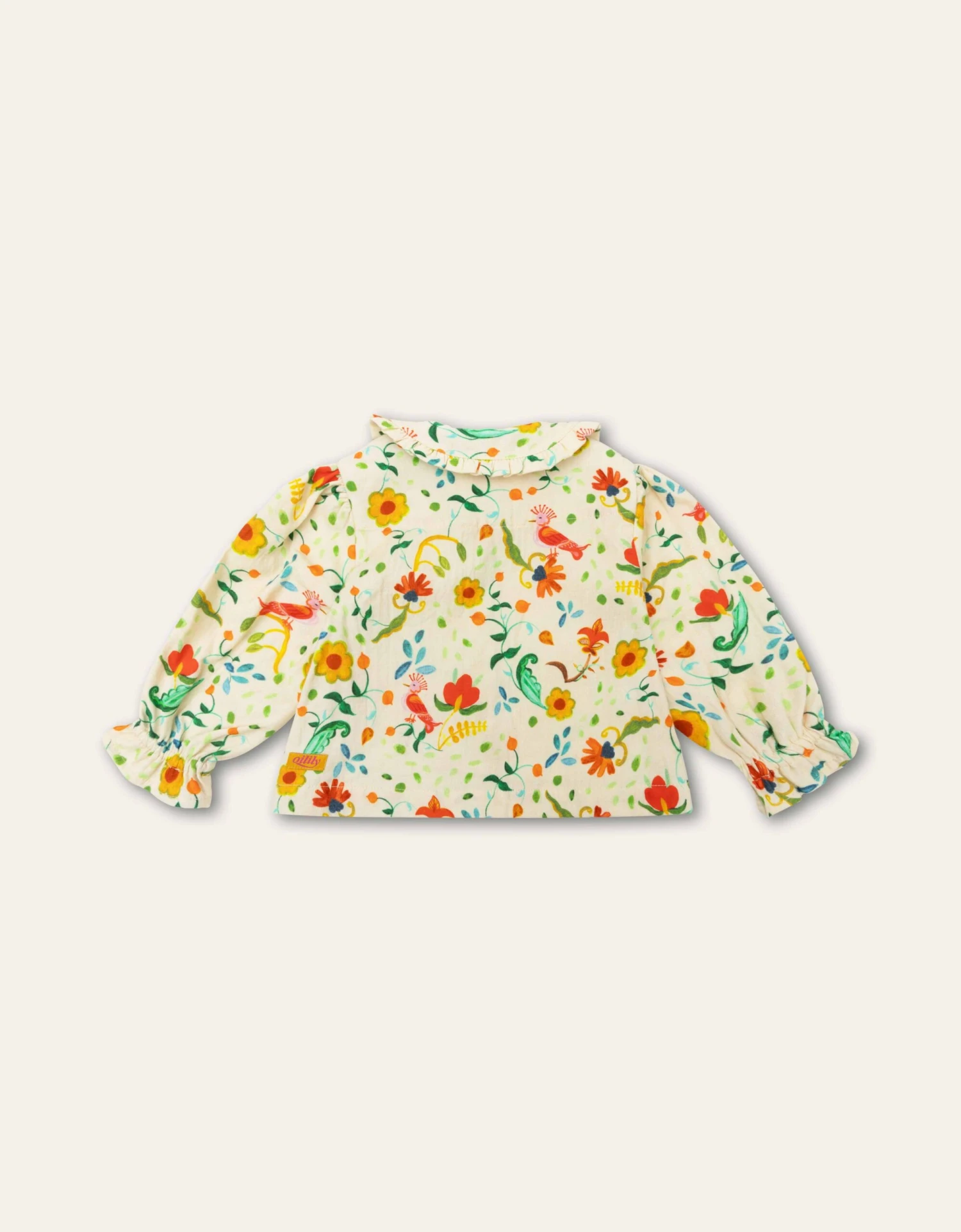 Wafelkatoen is de ideale stof voor deze snoezige blouse waarop onze print Animal Garden vol bloemen en paradijsvogels straalt. De blouse bestaat uit twee lagen, heeft een lieve kraag en kleine ruches langs de manchetten.