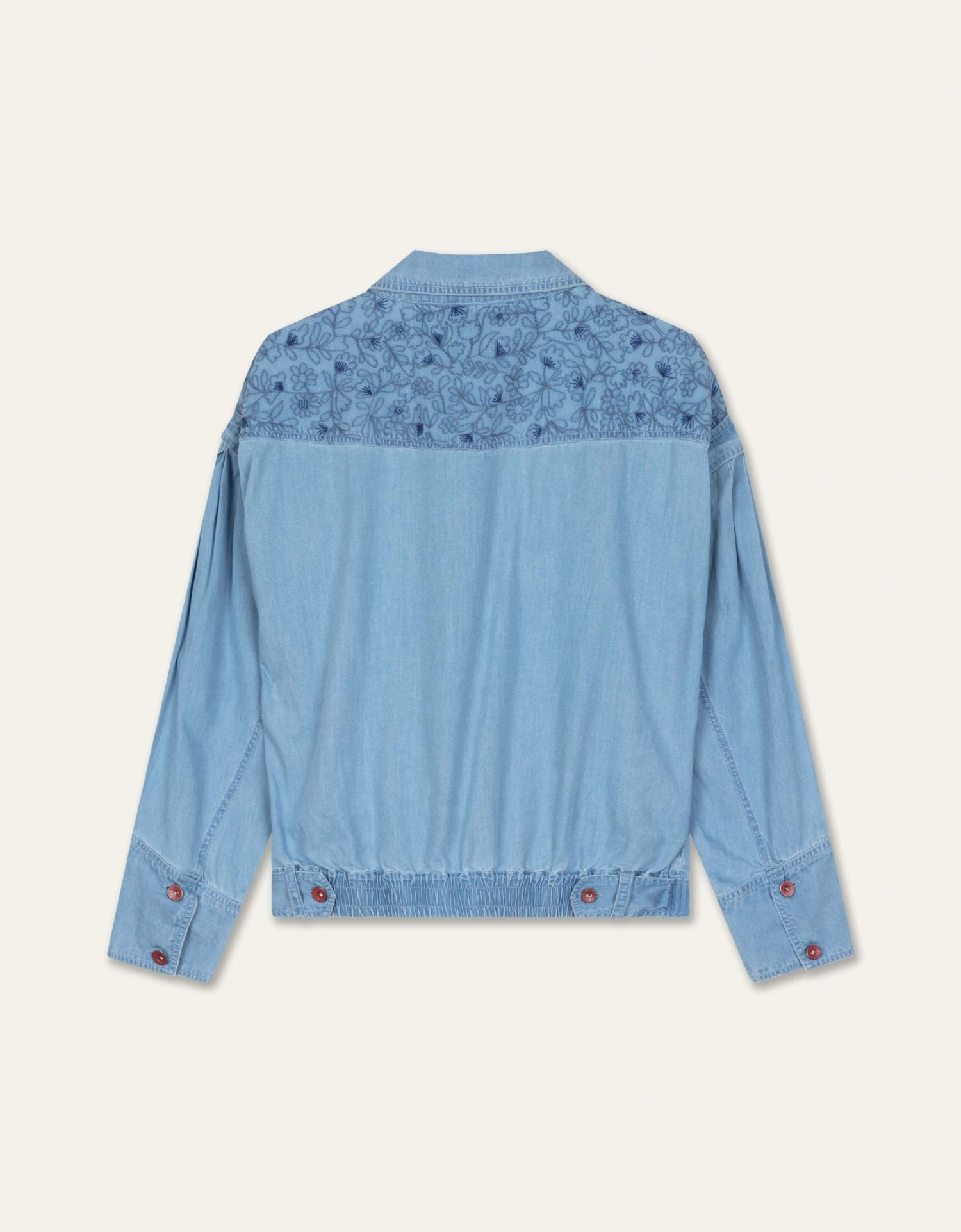 Heel zacht, soepelvallend jasje dat je outfit die extra fashionable touch geeft. Met sterke mouwen met details op je schouders en gedetailleerde geborduurde bloemen op de achterkant. – 100% Katoen – Superzachte denimlook – Gemaakt in India