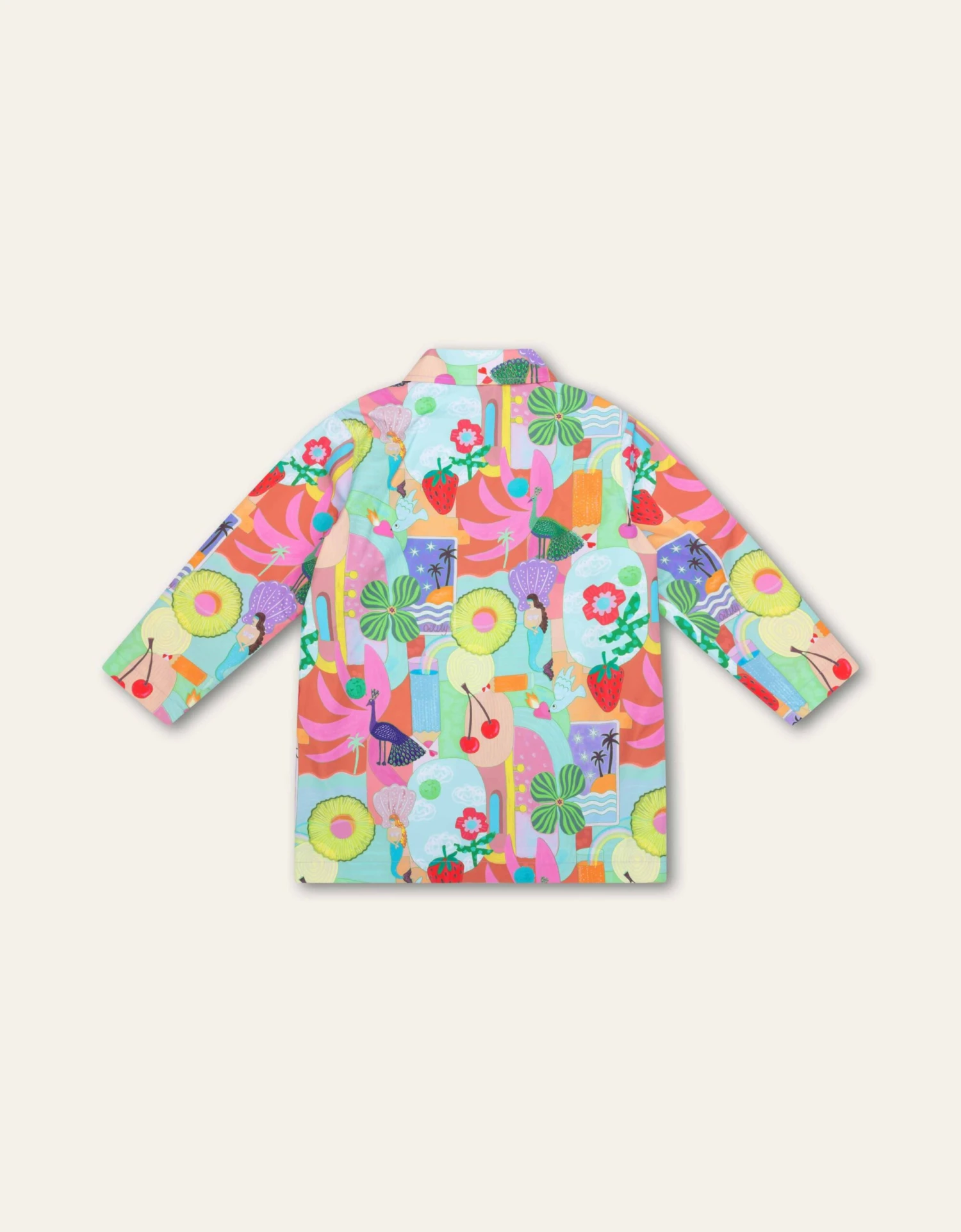 Dit met de hand getekende feestje van fruit en snoep vormt samen dessin Fiesta. Het is een vrolijk en kleurrijk geheel op deze heerlijke jas. We hebben de knoopjes ook in deze vrolijke stof bekleed, op de bovenste na.