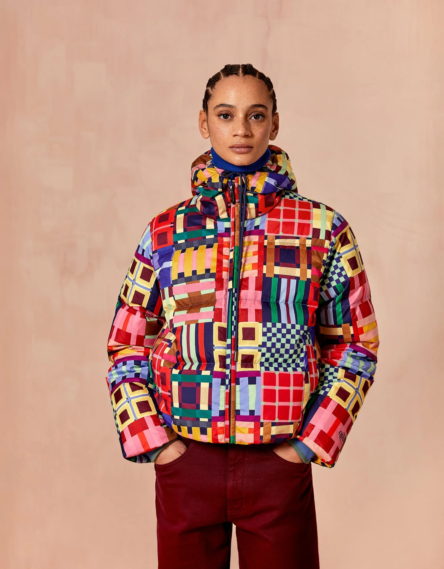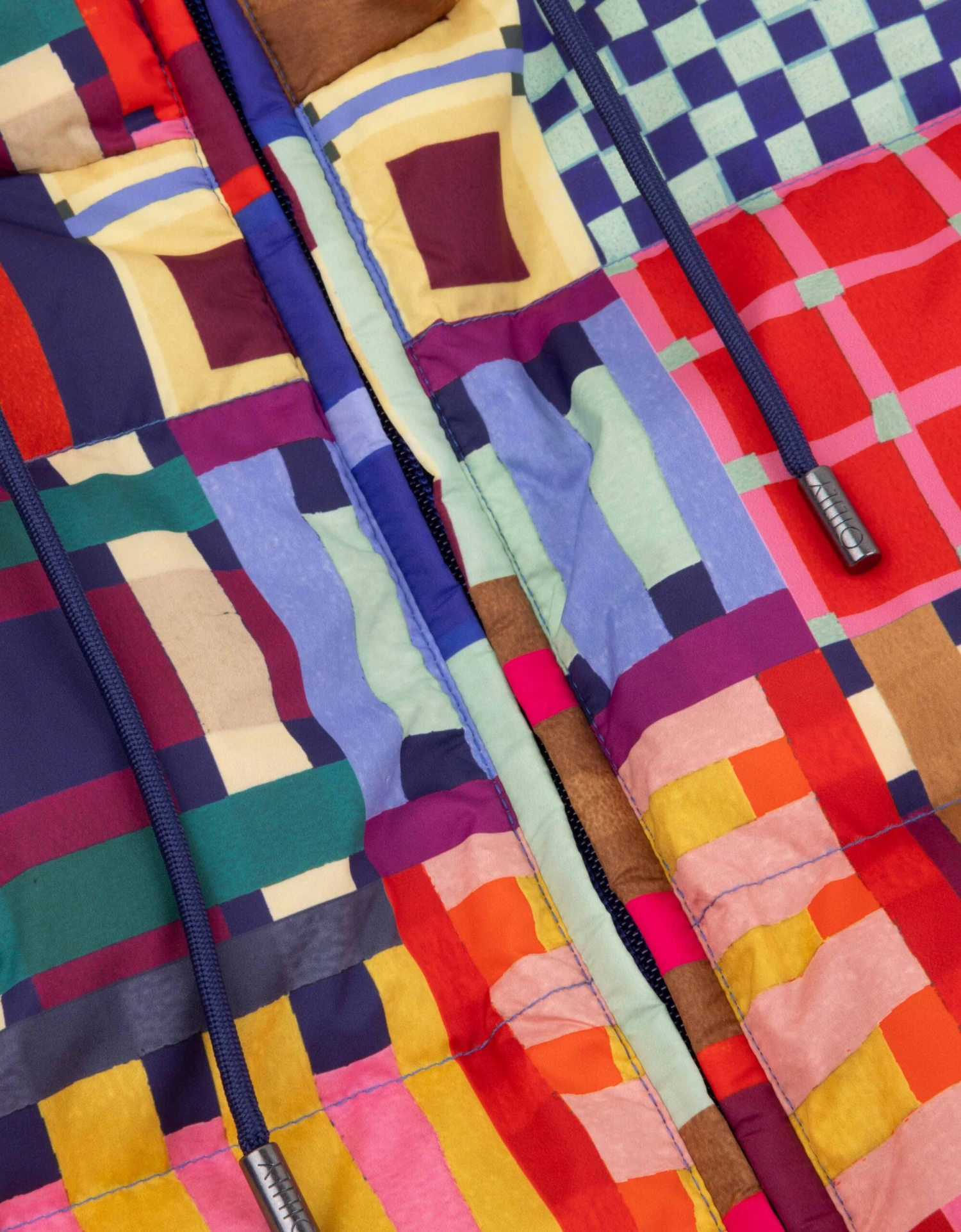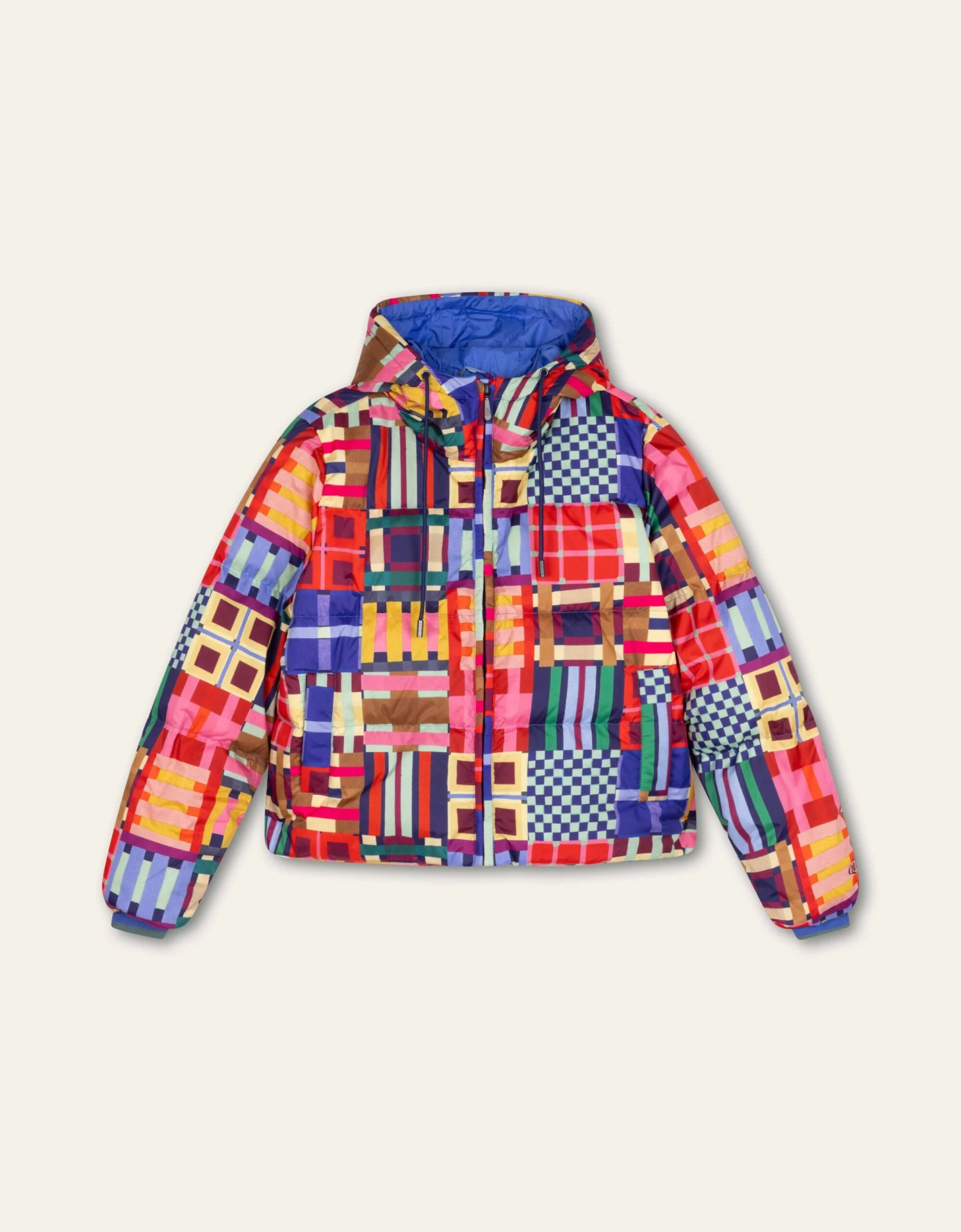 Het dessin Tartan tape is een print dat speelt met de vele kleurrijke tartans die Schotland rijk is. Het maakt van deze korte puffer jas een feestje om naar te kijken. De jas sluit met een blinde rits en je kan de onderkant aansnoeren om met het silhouet te spelen.