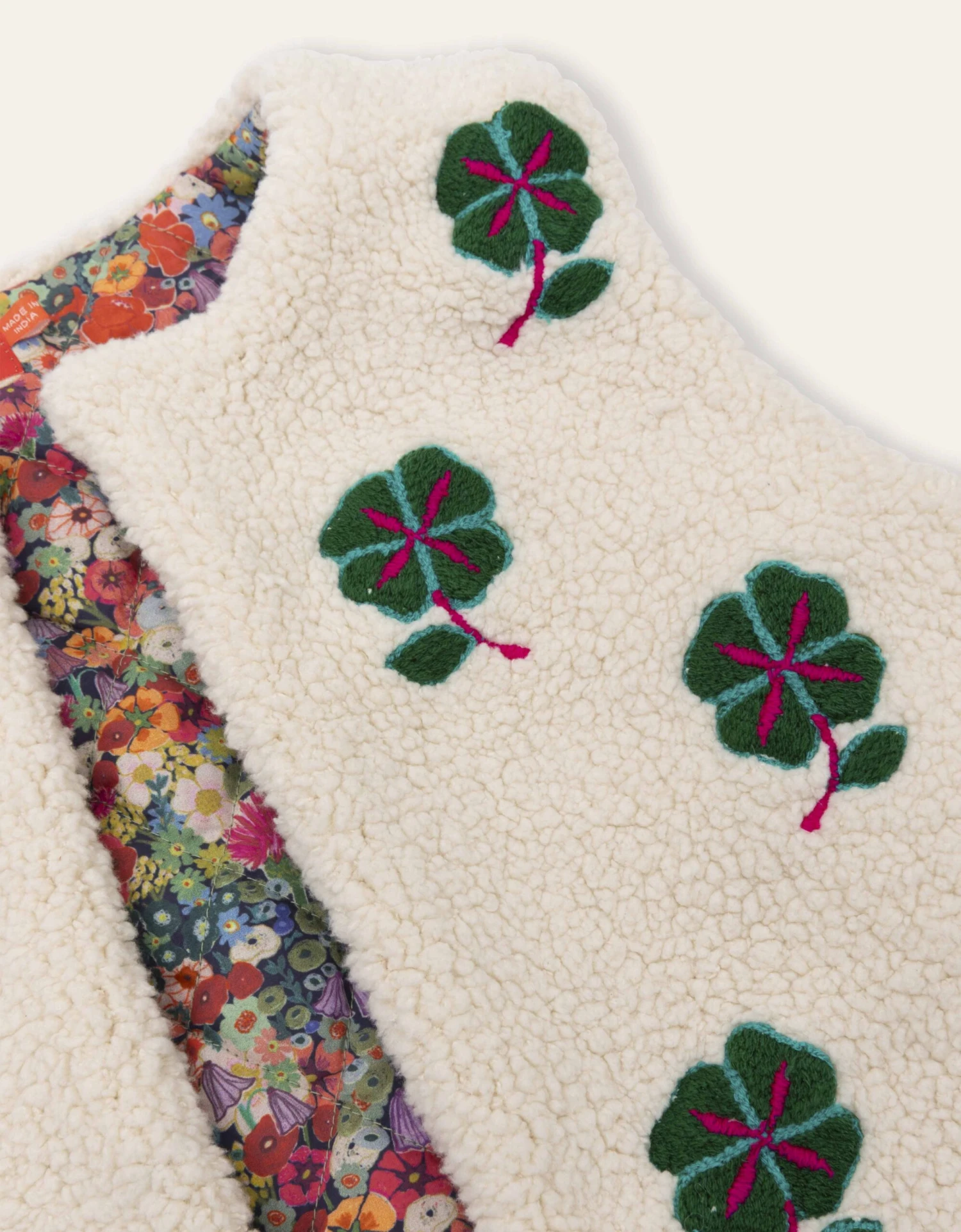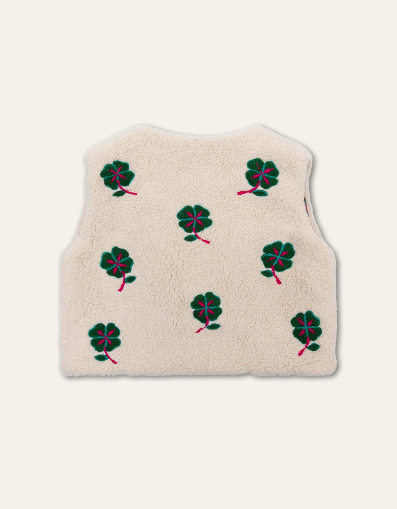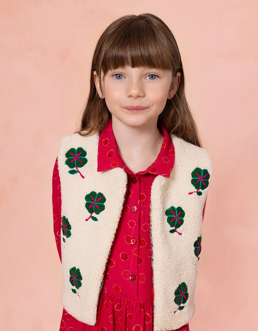 Zachte teddy bodywarmer vol met gelukbrengende klavertjes vier. De binnenkant is gevoerd met de print Scottish Garden, een digitaal getekende floral in vrolijke kleuren.