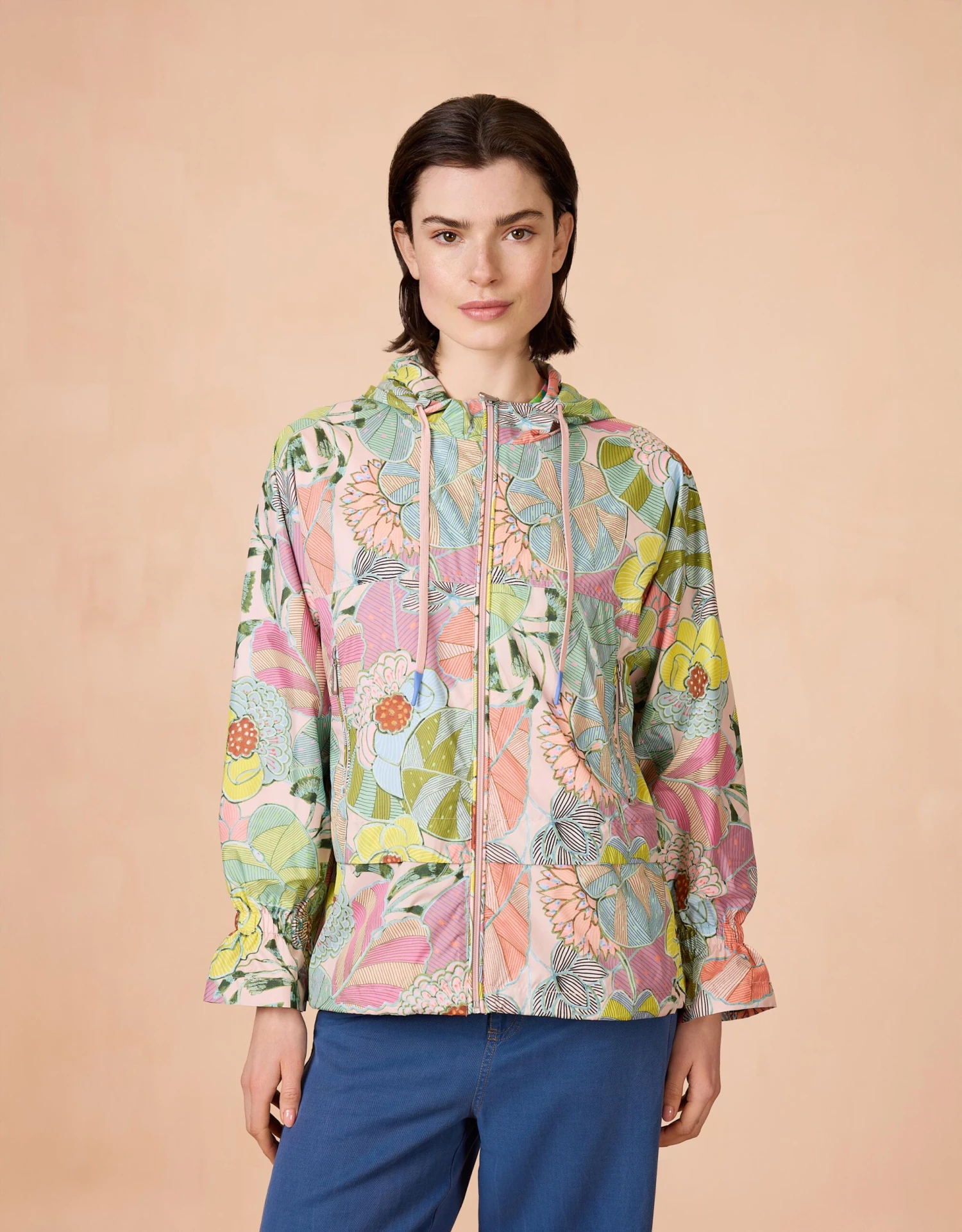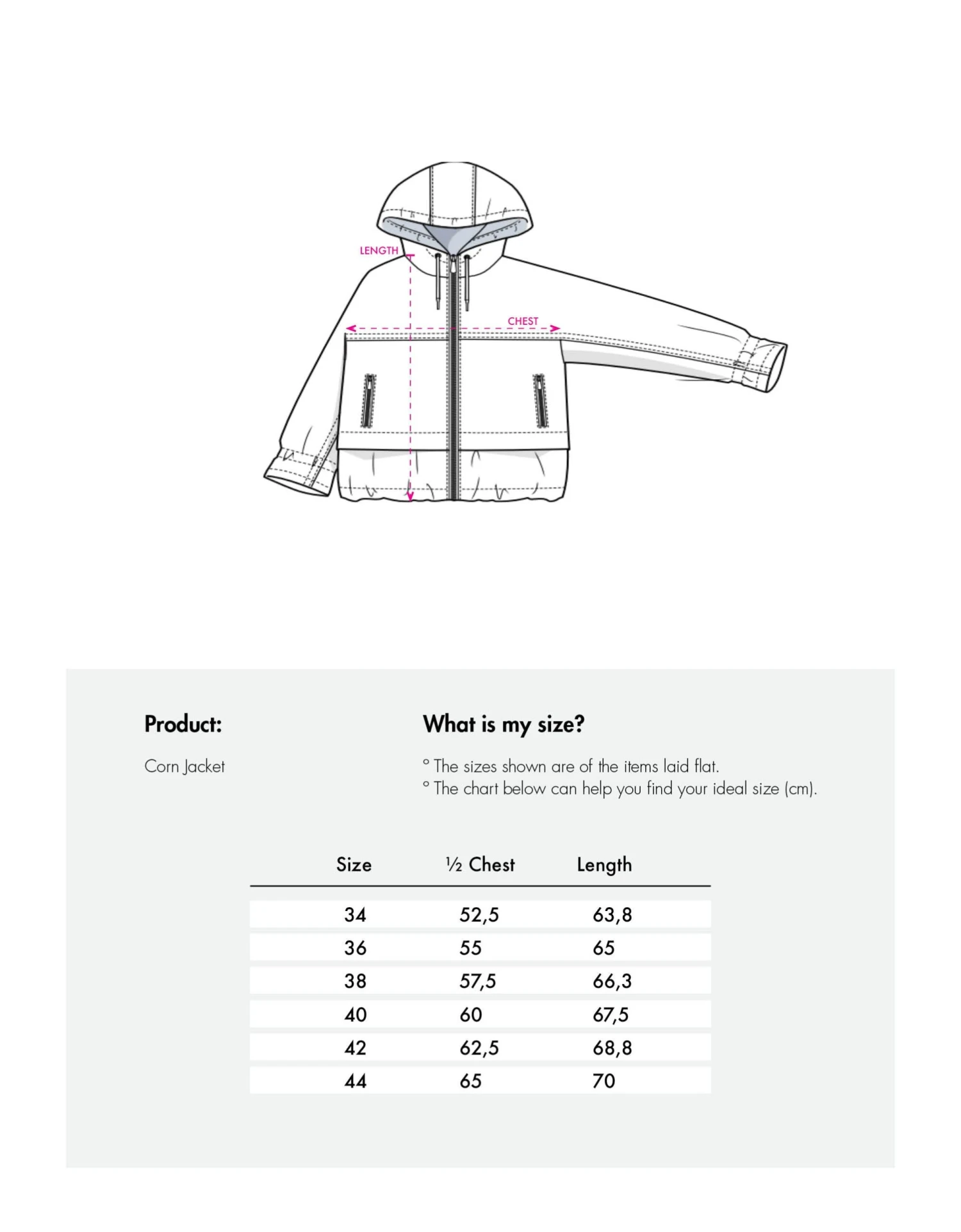De jas heeft elastiek bij de polsen, een capuchon met trekkoord en zijvakken met ritssluiting.