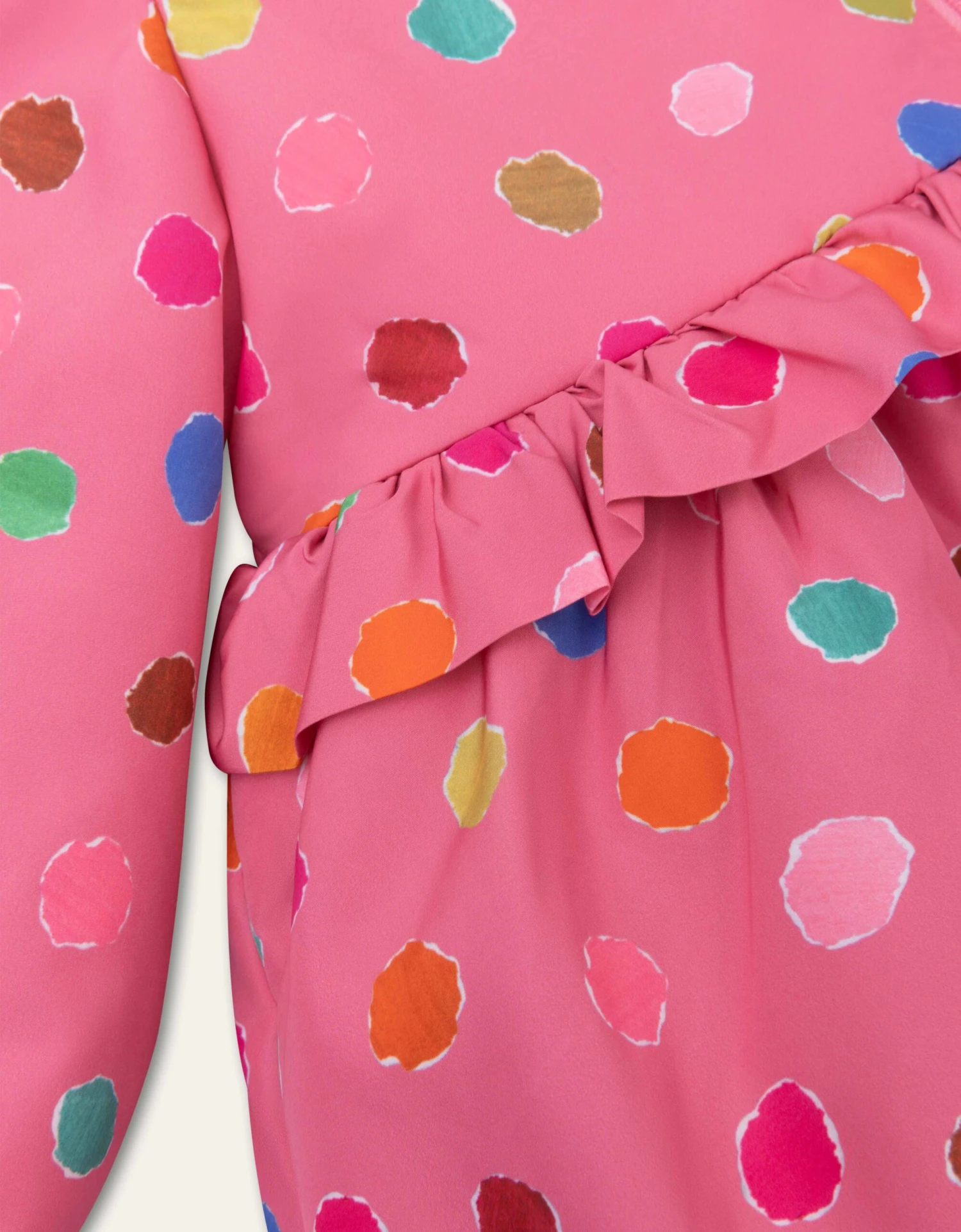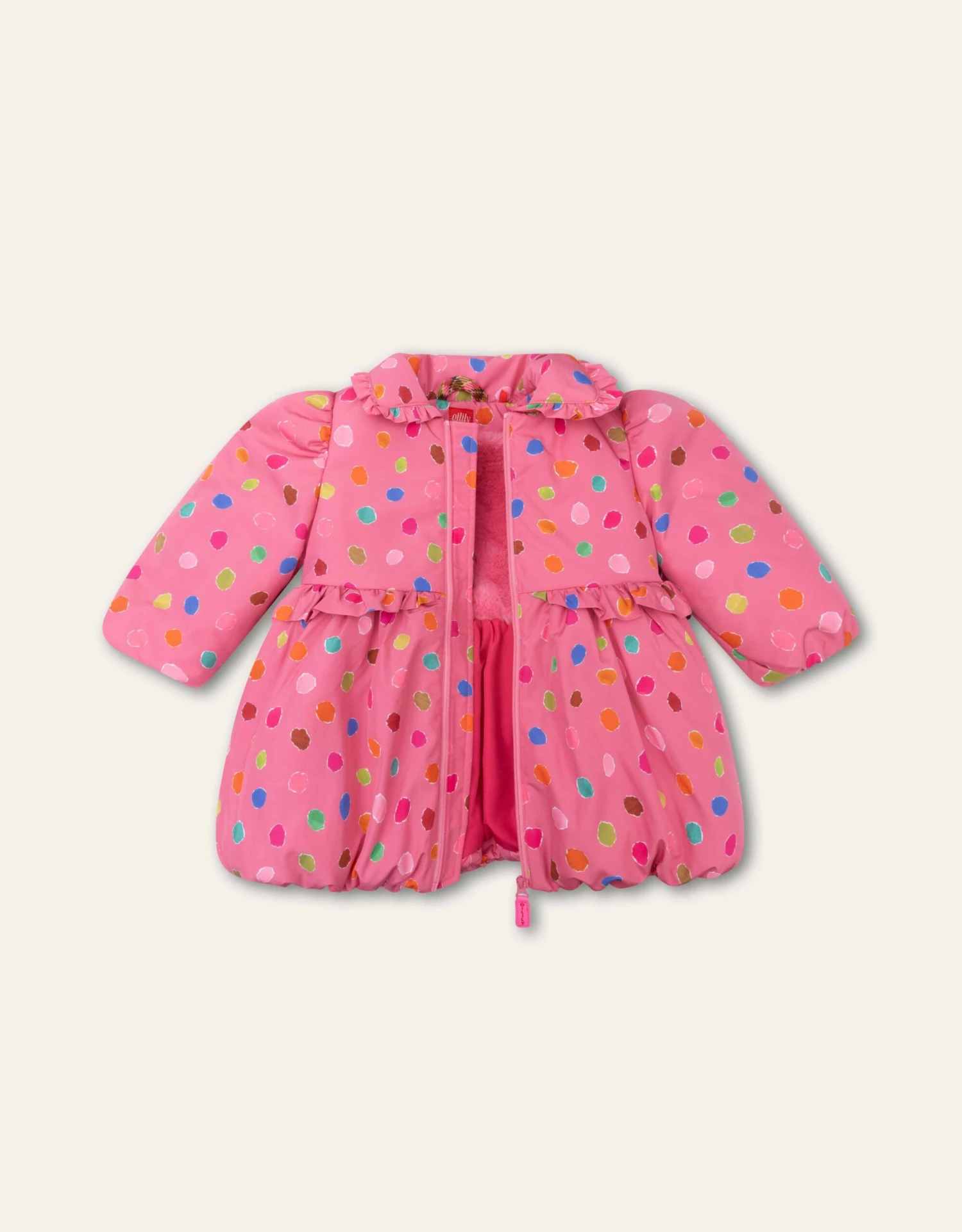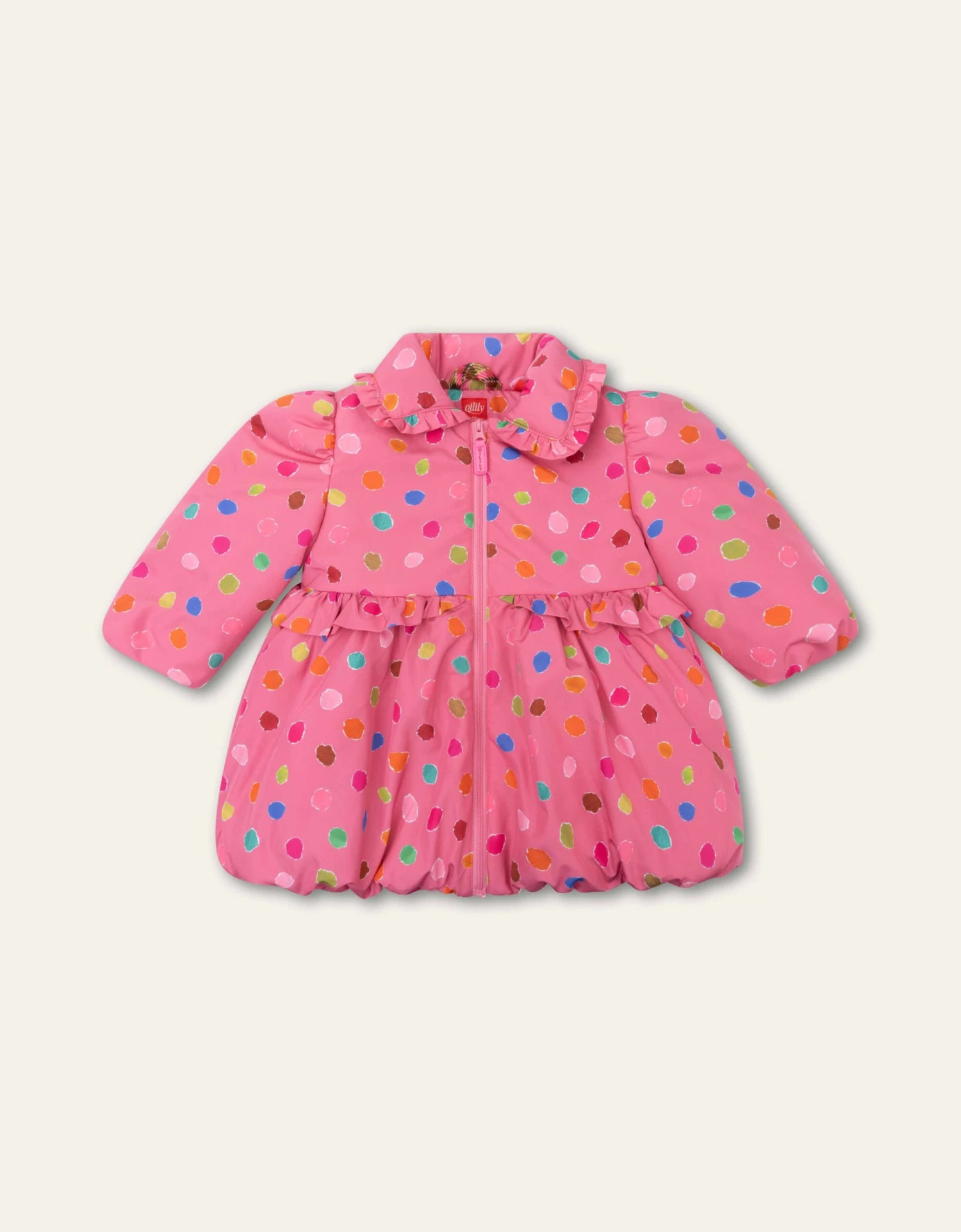 De print Nessy Dots is gemaakt van stukjes gescheurd gekleurd papier die we als grappige eitjes verspreid hebben. Het staat gezellig en vrolijk op deze heerlijke warme jas met A-lijn en lieve ruches.