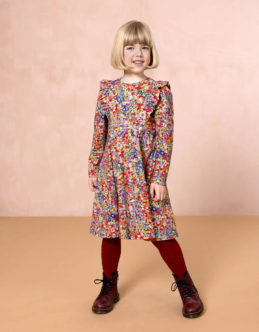 Kleine bloemen die we digitaal hebben getekend vormen samen print Scottish Garden. Op dit ruche-rijke jurkje staat het samen heel dromerig.