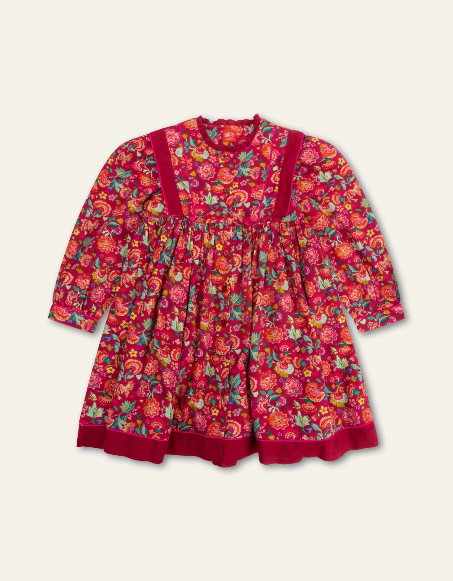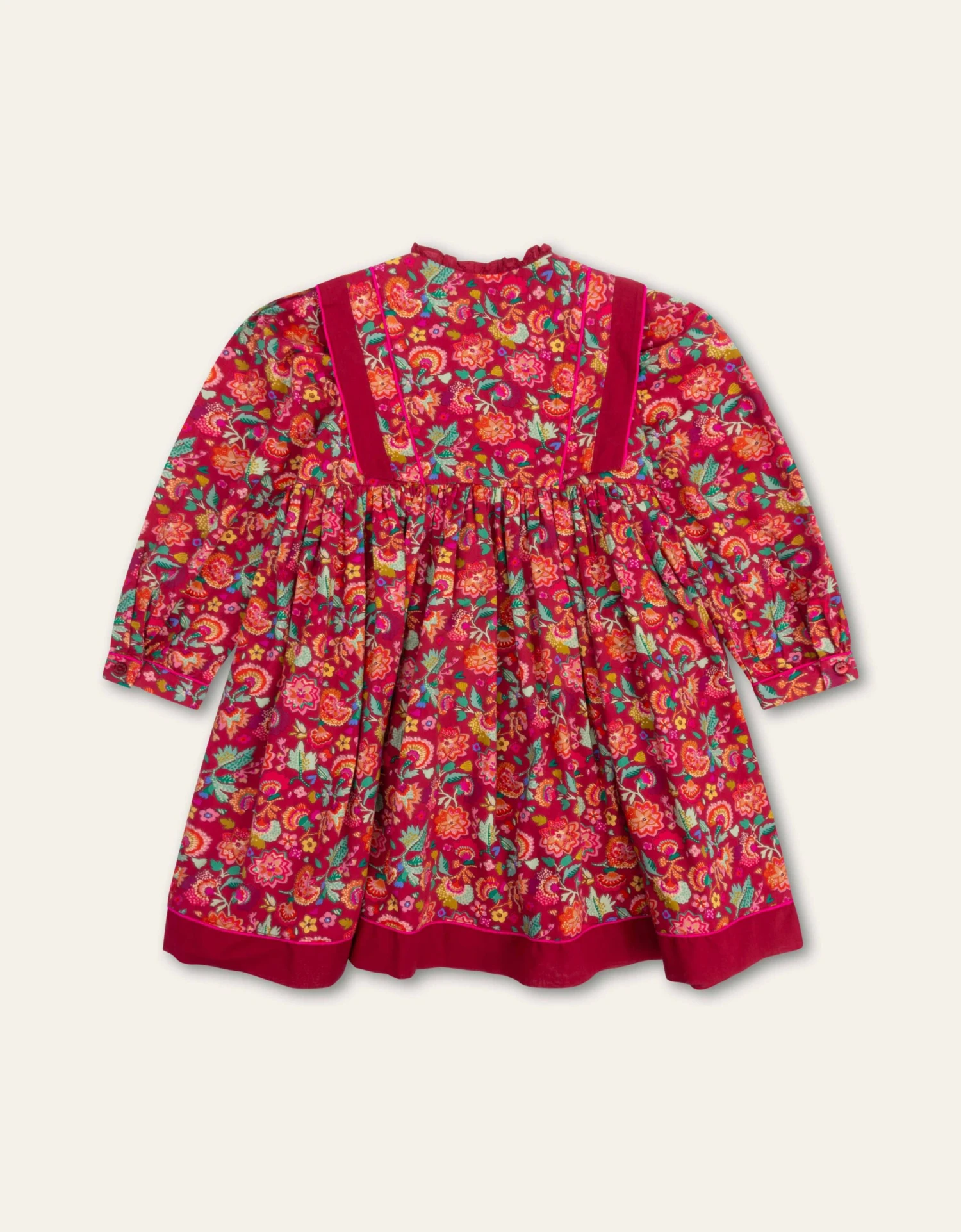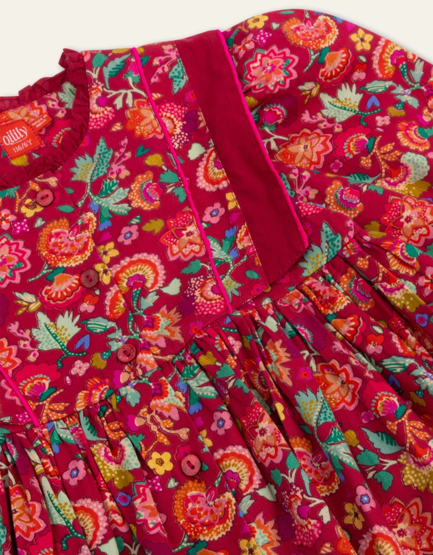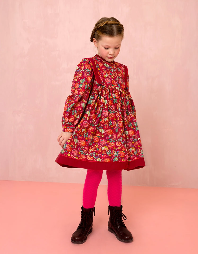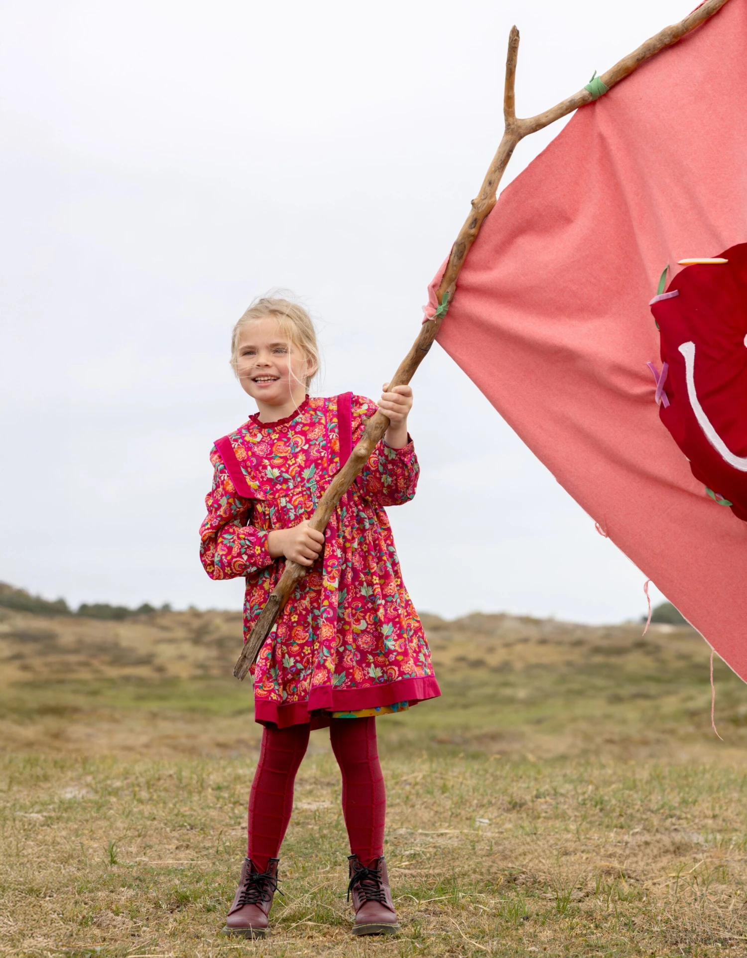 Elke dag voelt speciaal met deze jurk in de print Flashback Flowers, een remake van een floral dessin uit de jaren 90. De vele speelse details zoals de schulpjes, het schotje en de mooie gouden piping langs de rand, maken van dit jurkje, in fijn krakend katoen, een plaatje.