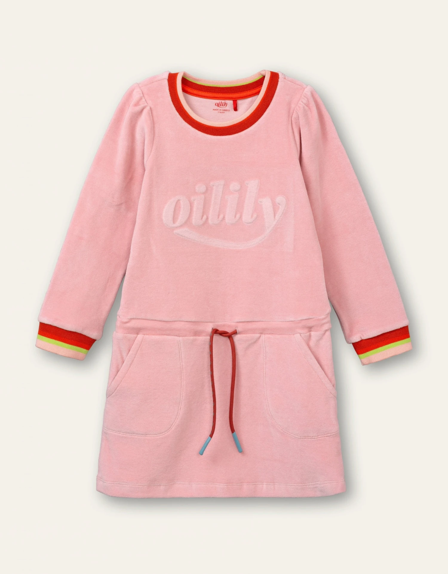 Wat een heerlijke jurk is dit om eindeloos te dragen. Heerlijk zacht velours, coole glitter crewneck, pofmouwen en ook nog een 3D-logo op je buik. – Gemaakt in Griekenland – Organic cotton – Drawstring en zakjes bij de taille – Vintage logo aan de achterkant