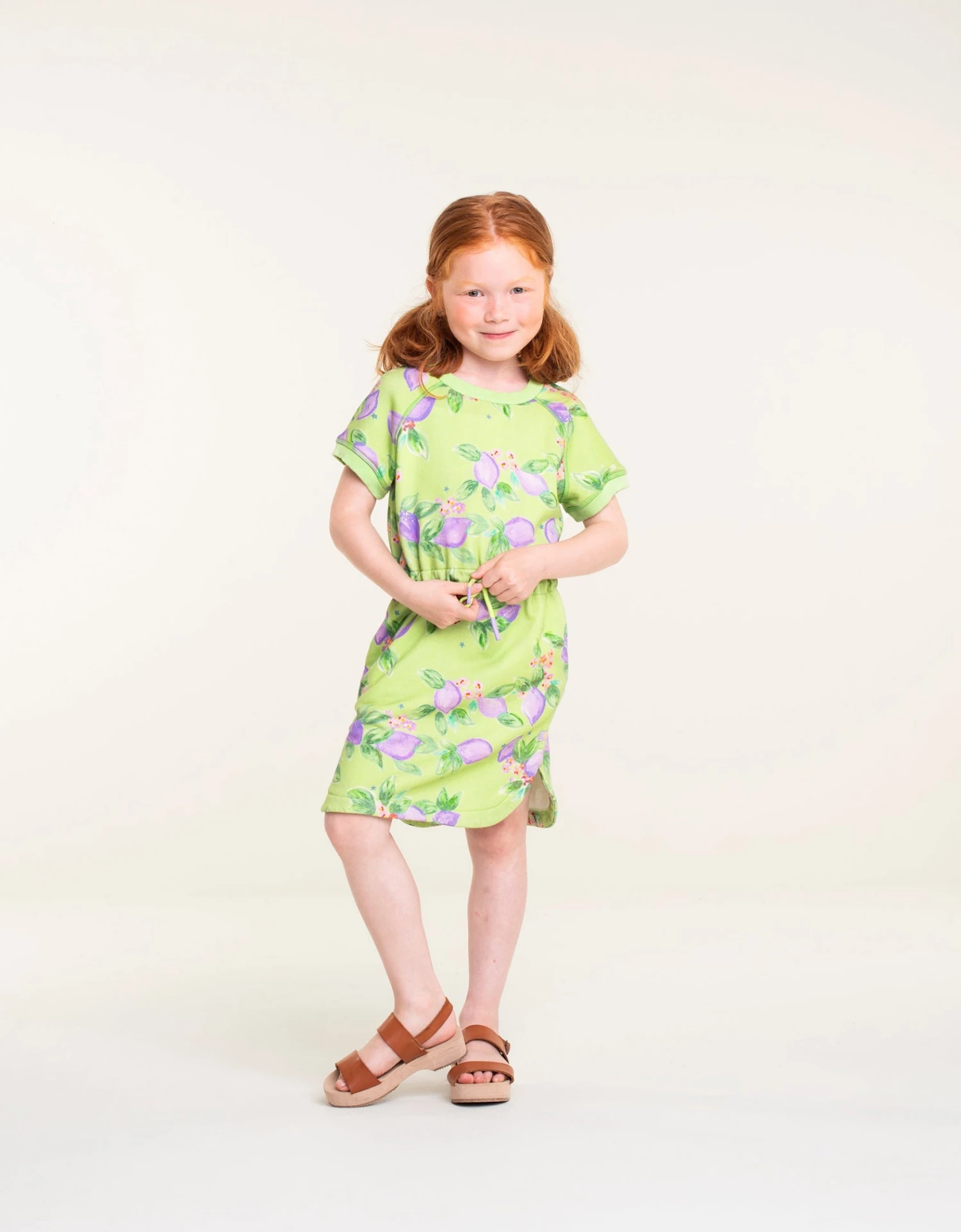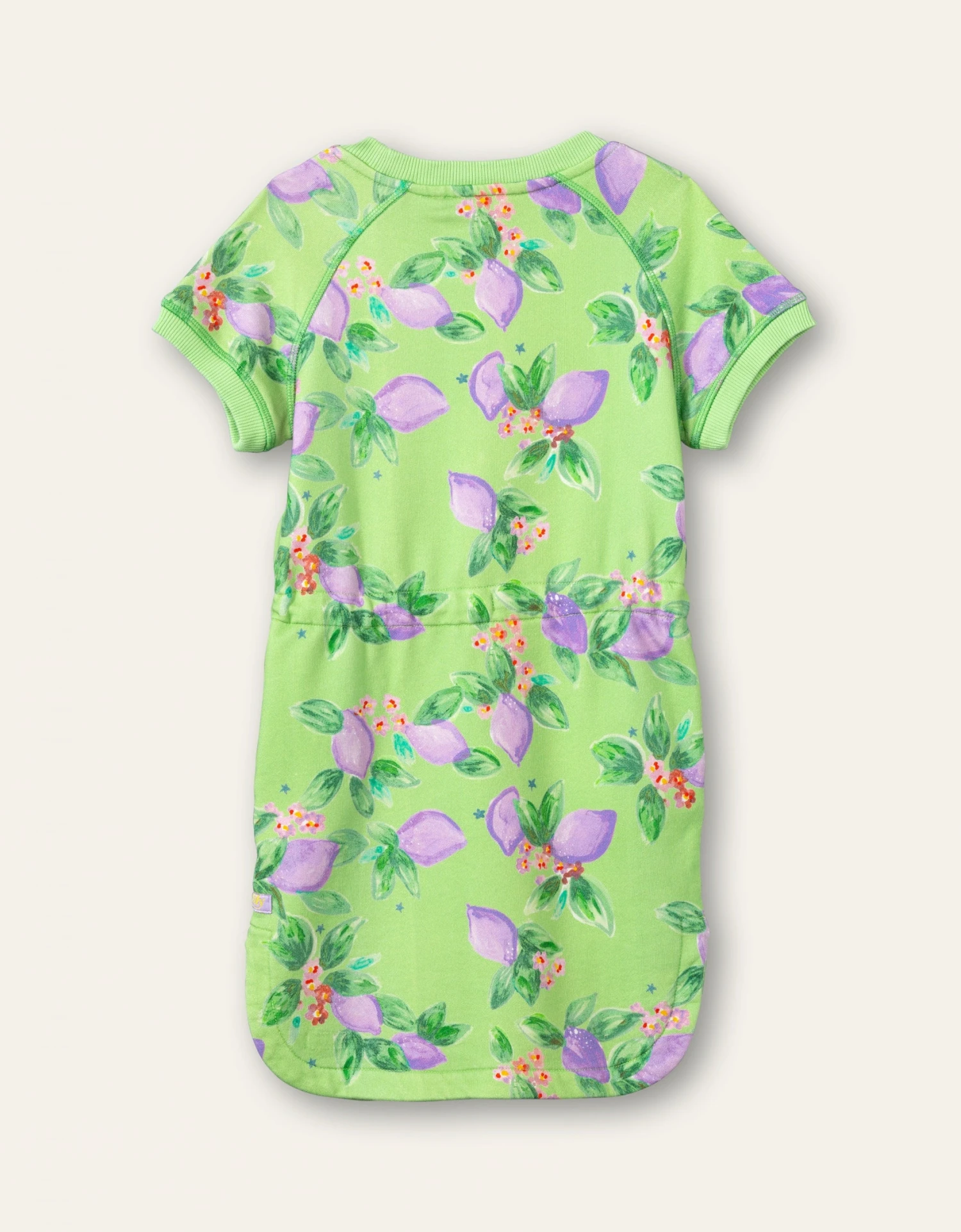 Paars en groen, groen en paars, we krijgen er geen genoeg van! De combinatie van fijne kleuren en speelse tekenigen met citroenen, blaadjes en bloemetjes maken dit sweatjurkje superzomers met een sportief randje. – Relaxed fit – Drawstring in taille – 100% organisch katoen – Gemaakt in Portugal