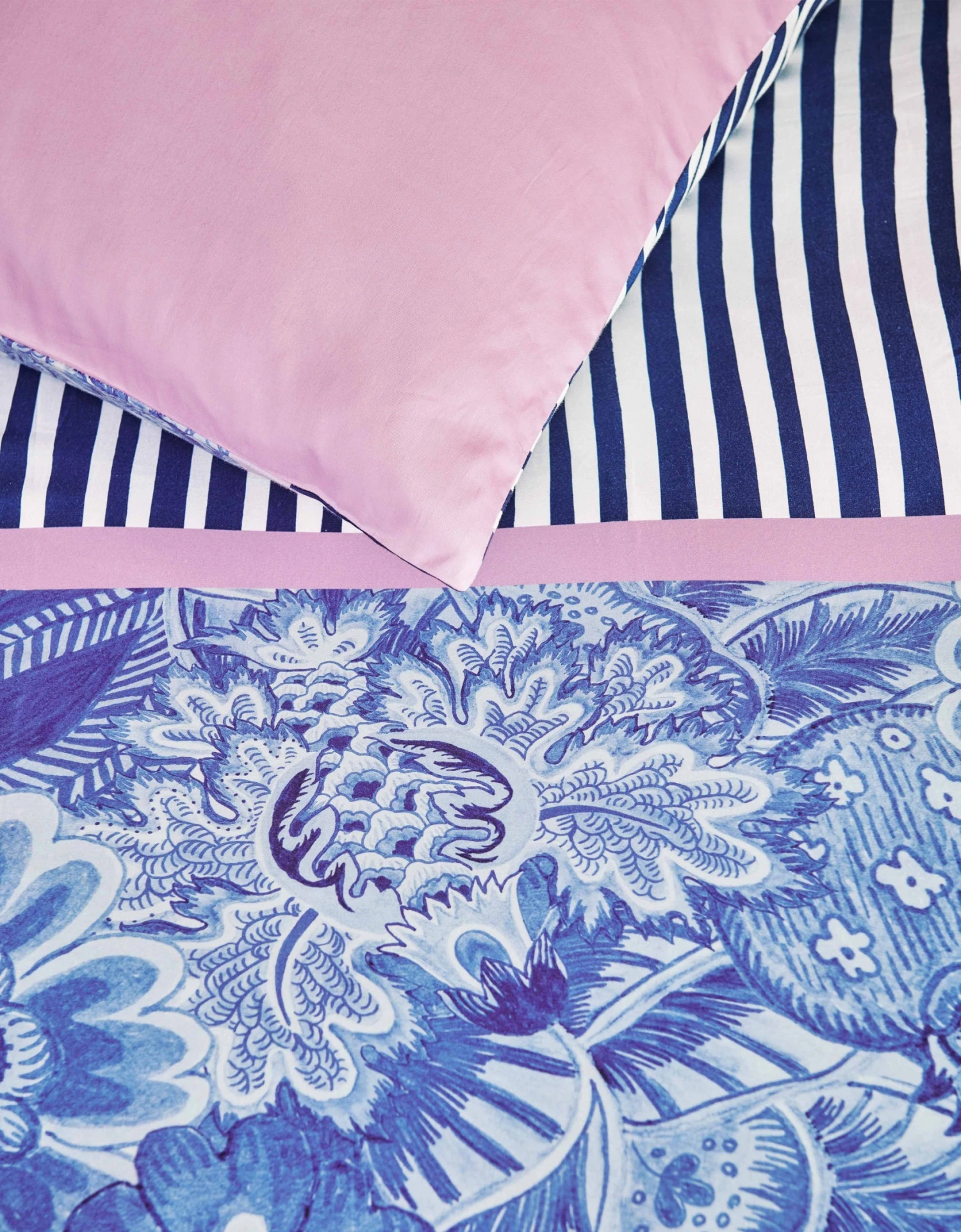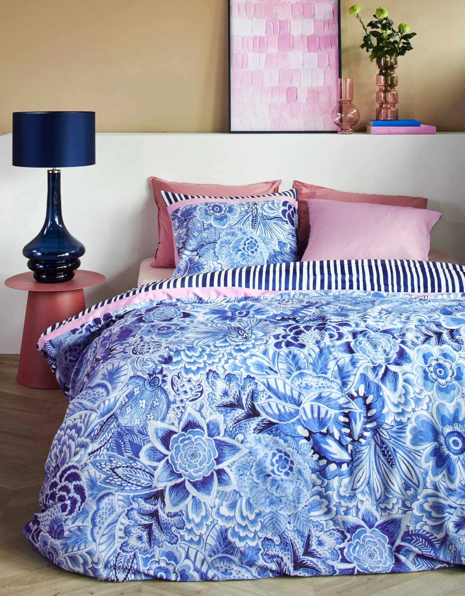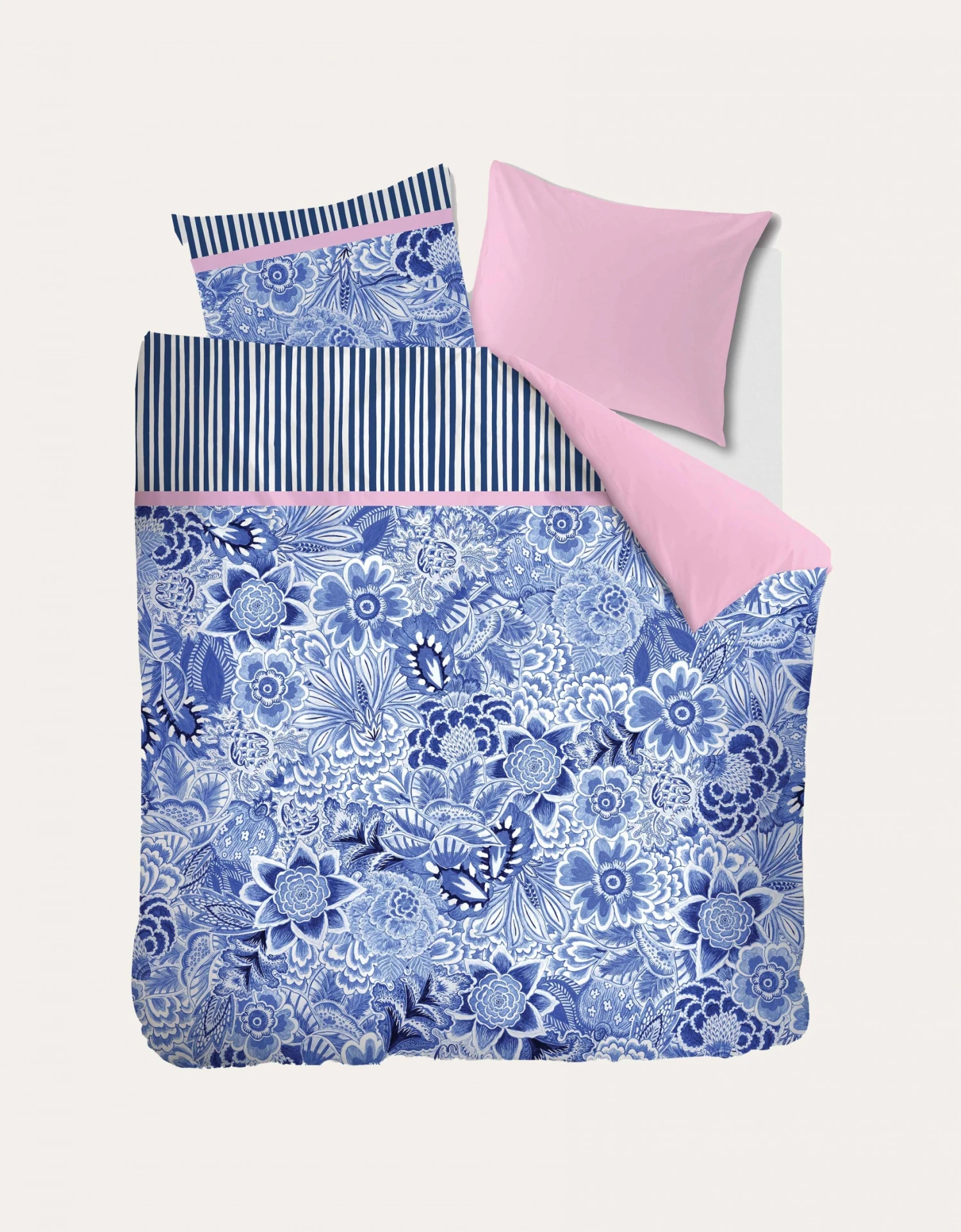 Het dekbedovertrek Florence is een prachtige toevoeging aan een moderne, trendy slaapkamer. Het ontwerp is geïnspireerd op oude sits-stoffen en bestaat uit handgeschilderde bloemen en bladeren in prachtige blauwtinten. De aquarelbloemen zorgen voor een zachte uitstraling, terwijl de combinatie met frisse strepen aan de bovenzijde een speels accent geeft. Het dessin is fantasievol en speels, perfect voor een gezellige sfeer in de slaapkamer. De achterkant van het overtrek is effen roze. Het dekbedovertrek zal zeker een eyecatcher zijn in de slaapkamer.