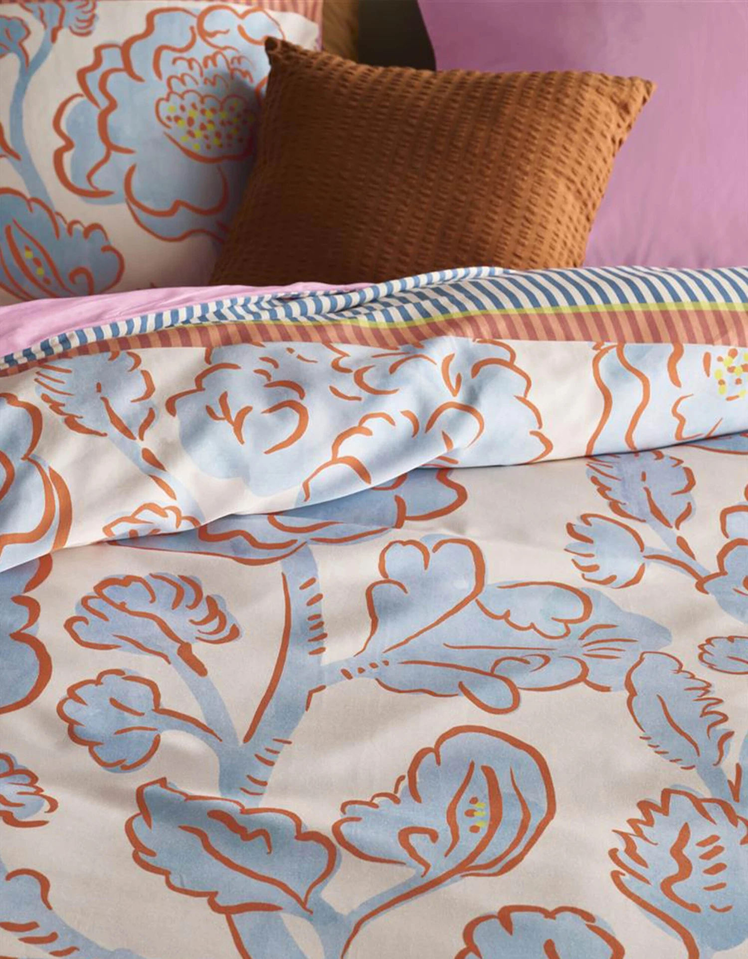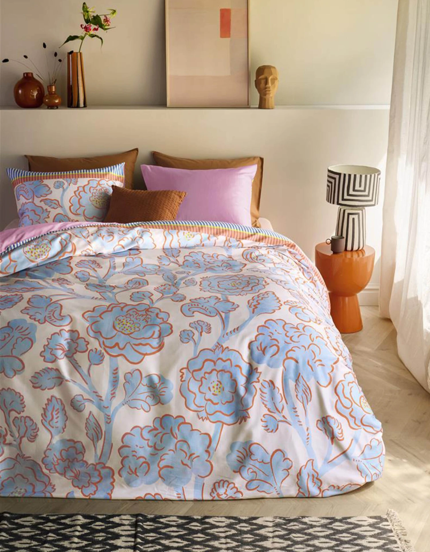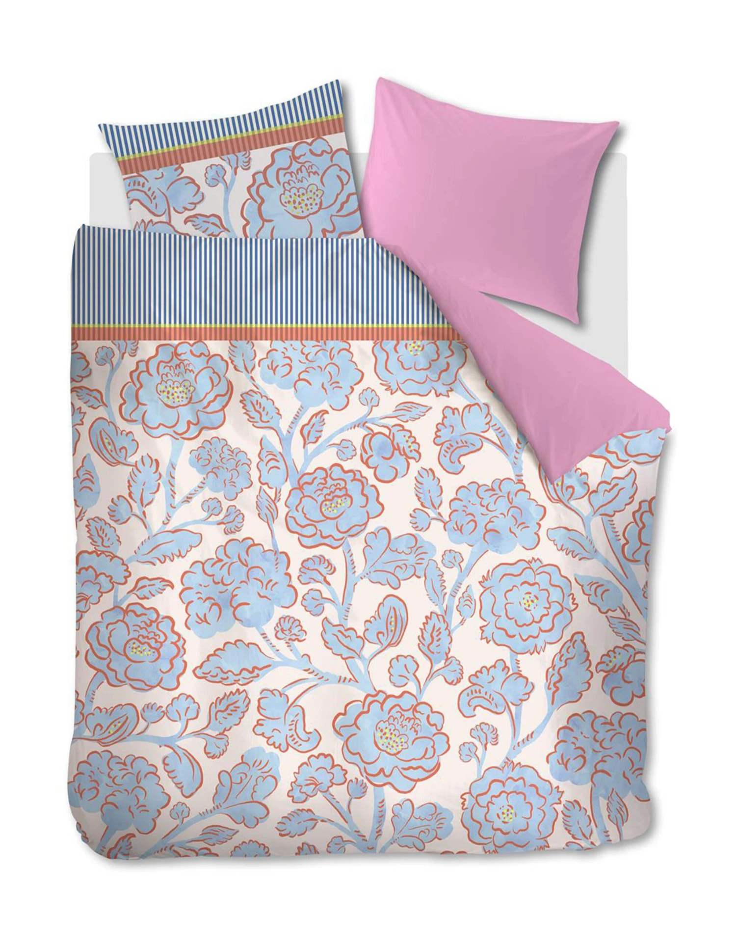 Dekbedovertrek Jazmin van Oilily brengt een speelse twist naar je slaapkamer met een verrassende mix van bloemen en strepen! Het dessin schittert met handgeschilderde bloemen en bladeren in frisse blauwtinten, terwijl de bovenkant van het overtrek en de kussenslopen worden versierd met vrolijke strepen. Draai het dekbedovertrek om en ontdek een effen roze kleur aan de andere kant.