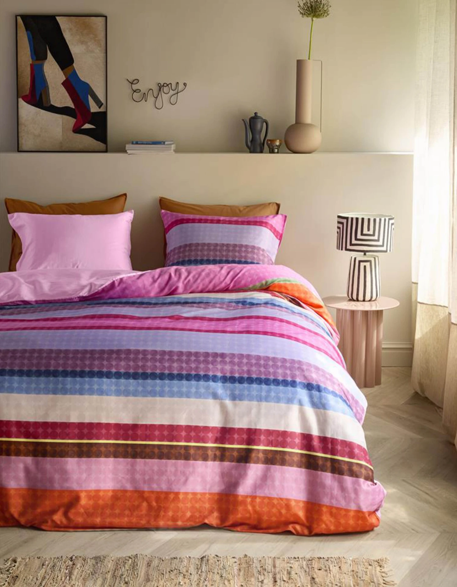 De grote, stevige strepen op dit dessin worden aangevuld met een vrolijk detail – talloze stippen die het geheel een speelse textuur geven. In combinatie met contrastrijke kleuren maak je met het Maddison dekbedovertrek van Oilily een stijlvol statement in je slaapkamer. De achterzijde van het overtrek heeft een effen roze kleur.