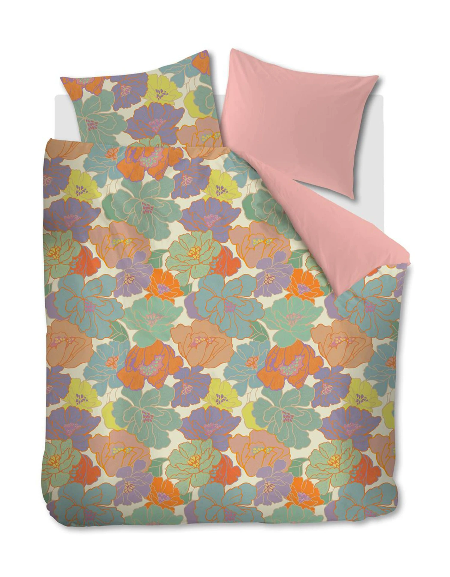 Met zijn felle kleuren is dekbedovertrek Peggy van Oilily een feestje om onder te slapen. De grafische bloemen vallen speels over elkaar heen, een kijkje dichterbij onthult de fijne streepjesdetails in de bloemblaadjes. De effen roze achterzijde maakt het geheel helemaal af. Een ware eye-catcher!