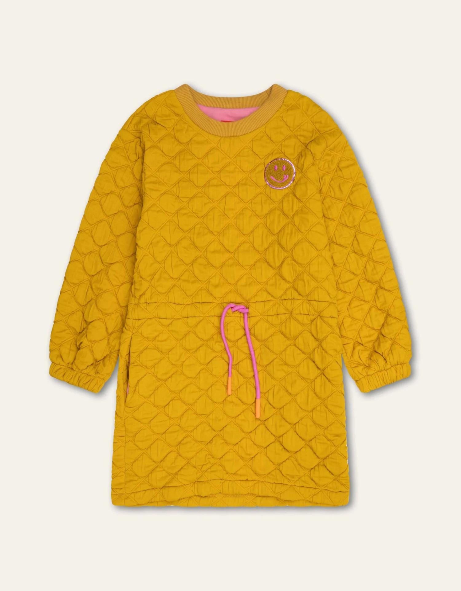 Het dubbel knitted katoen met patroon aan de buitenkant geeft een 3D bubbel effect aan dit gezellige jurkje. Aan de binnenkant is het jurkje helemaal glad.