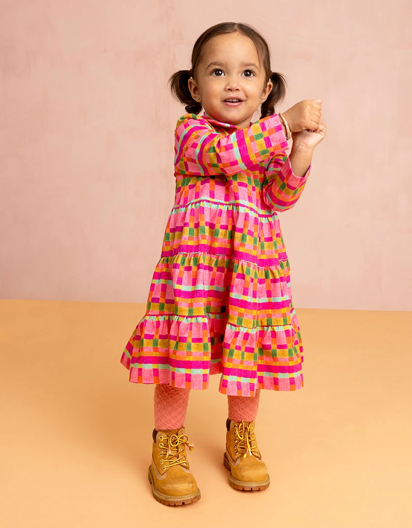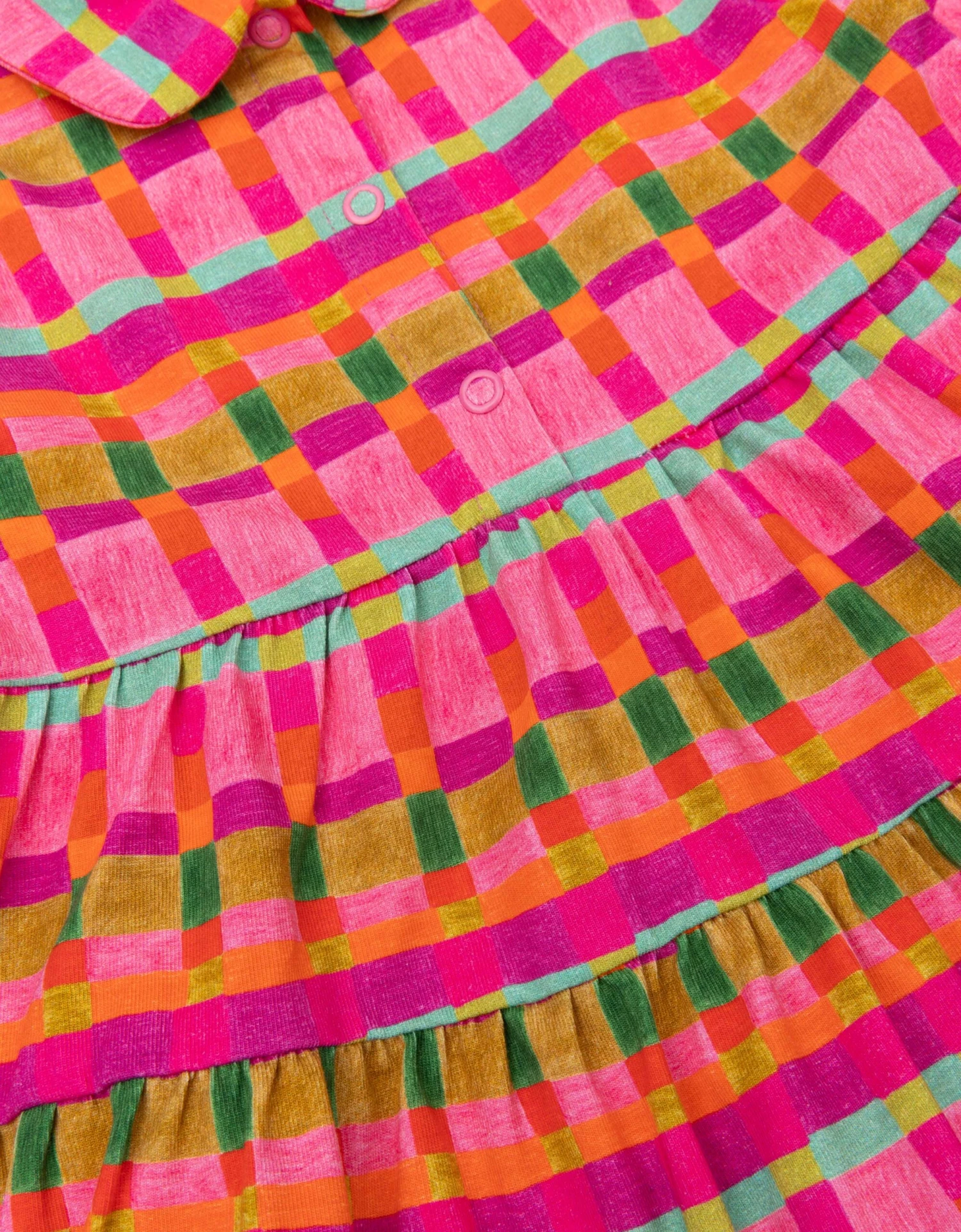 Digitaal tekenden we deze vrolijke ruit die we Crayon Check hebben genoemd. Het past goed bij dit speelse jurkje met mooie plooien.