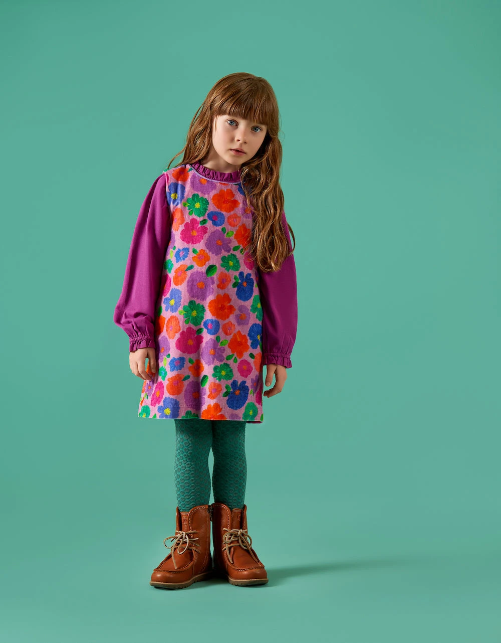 Dit jurkje is heel bijzonder. Het dessin Mush Flowers maakten we door plastic zakjes met water en lucht te vullen, ze in de verf te dopen en ermee te stempelen tot er een bloempatroon ontstond. Het staat beeldig op deze velours jurk met satijnen voering en kleine pailletten langs de hals.