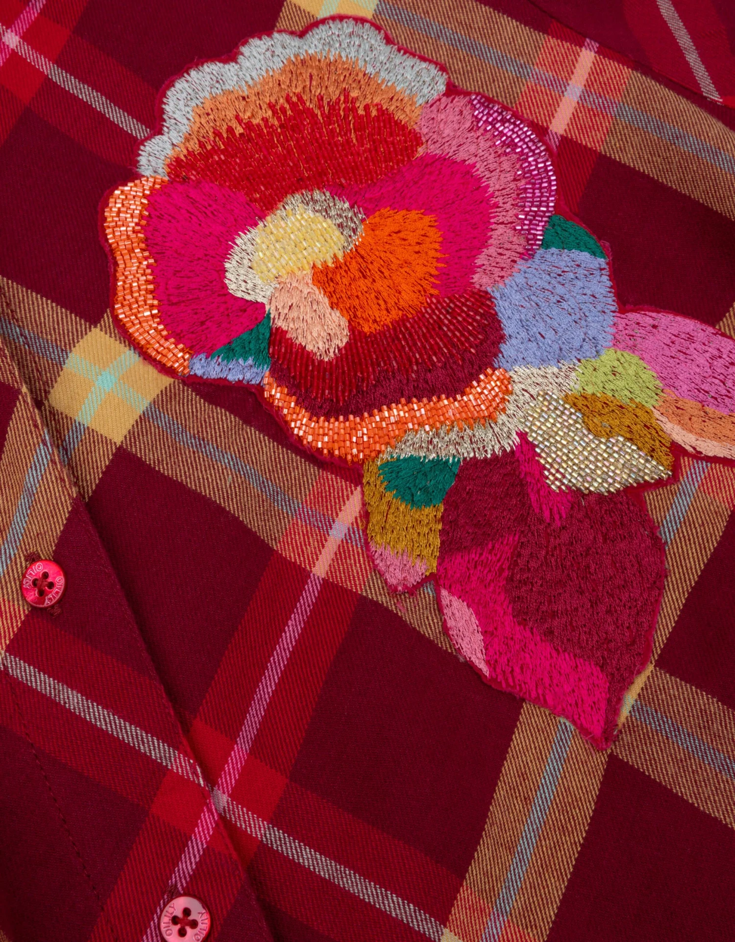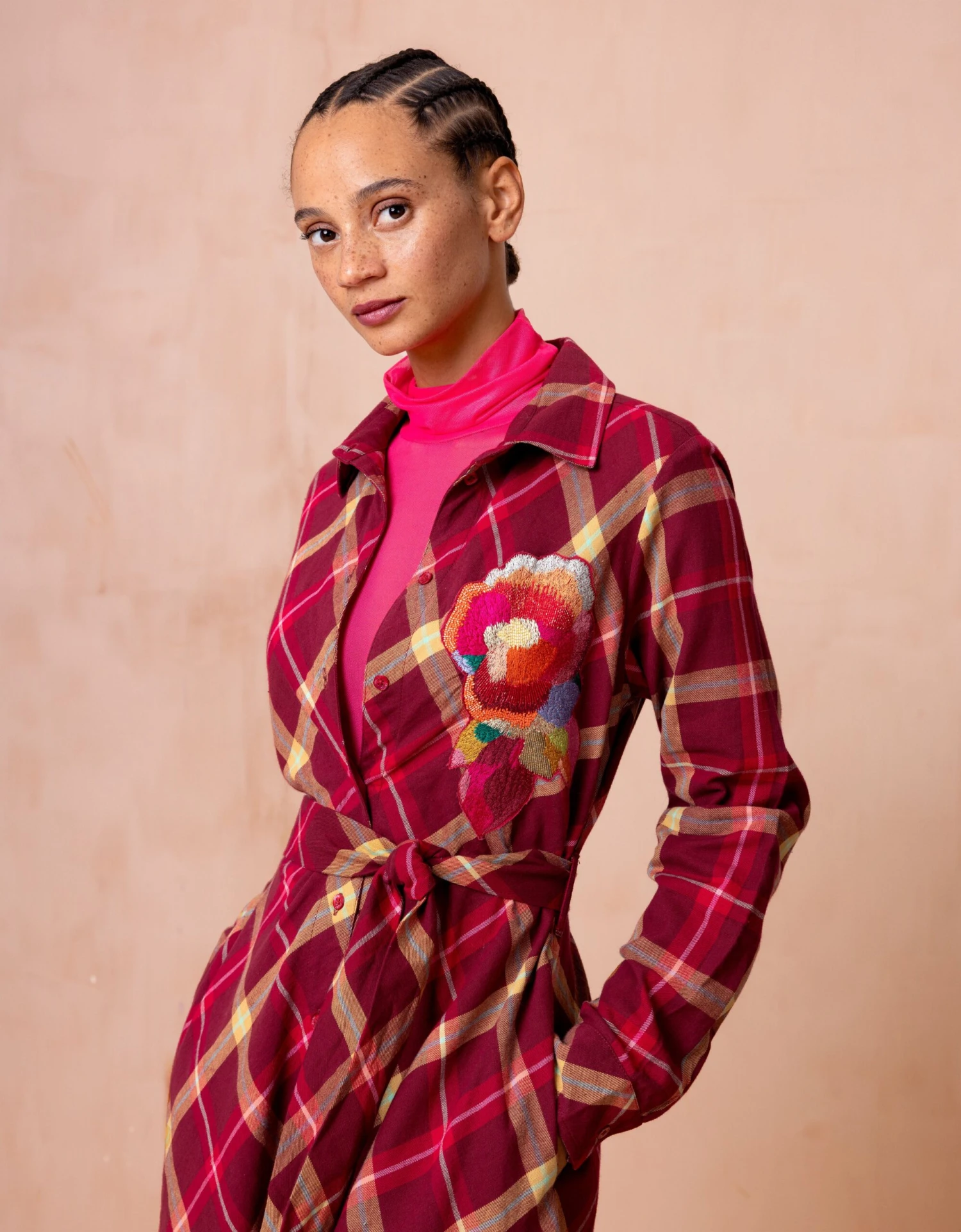 Cotton midi-dress met matching ceintuur in stoere ruit. Het prachtige floral kleuraccent is deels met de hand geborduurd en straalt door de toevoeging van subtiele pailletten. Uiteraard heeft deze jurk zakken in de zij.