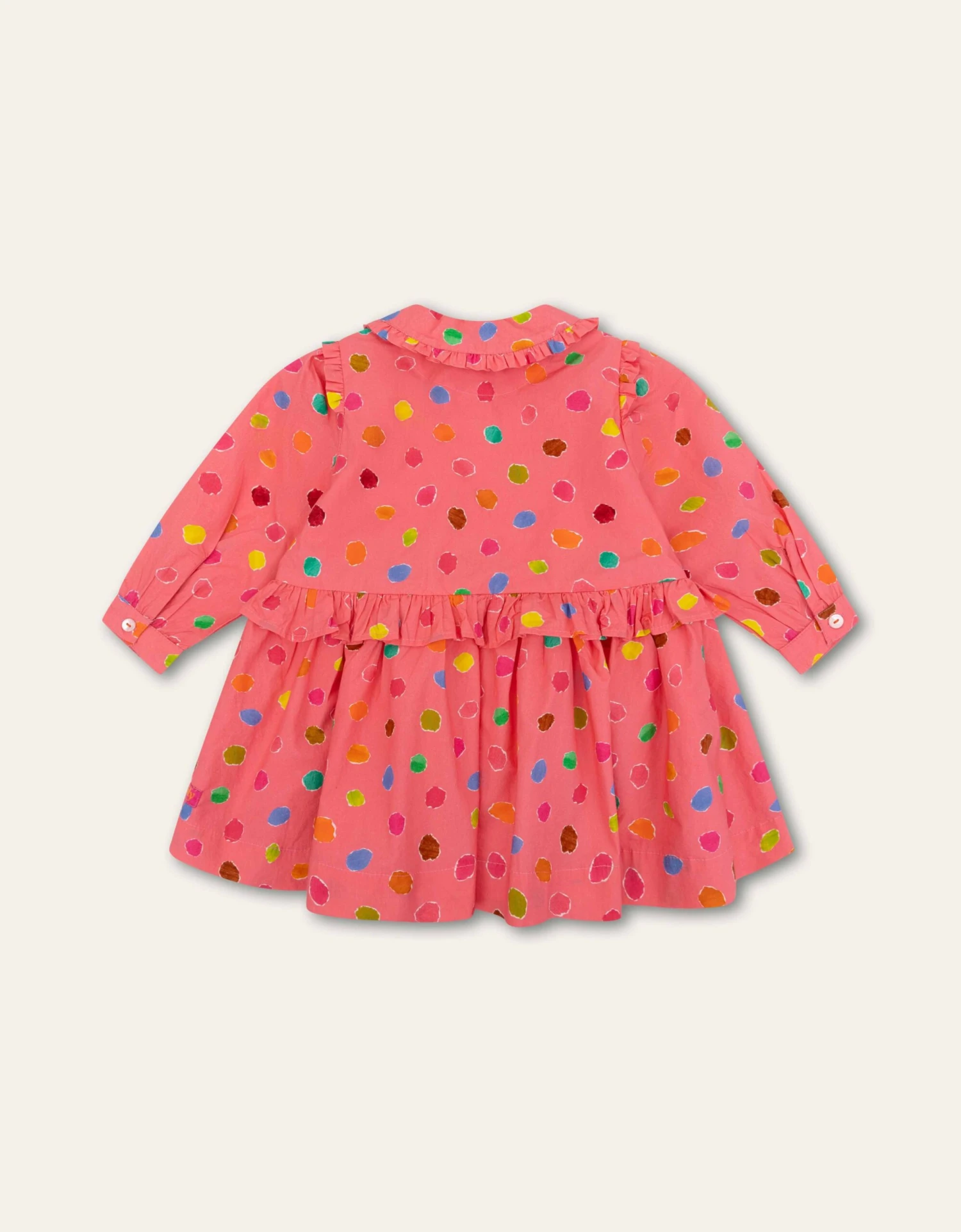 Dit wafelkatoenen jurkje straalt door de vrolijkheid van print Nessy Dots. Dit dessin ontstond door stukjes gekleurd papier te scheuren als eitjes van ons Monster Nessie.