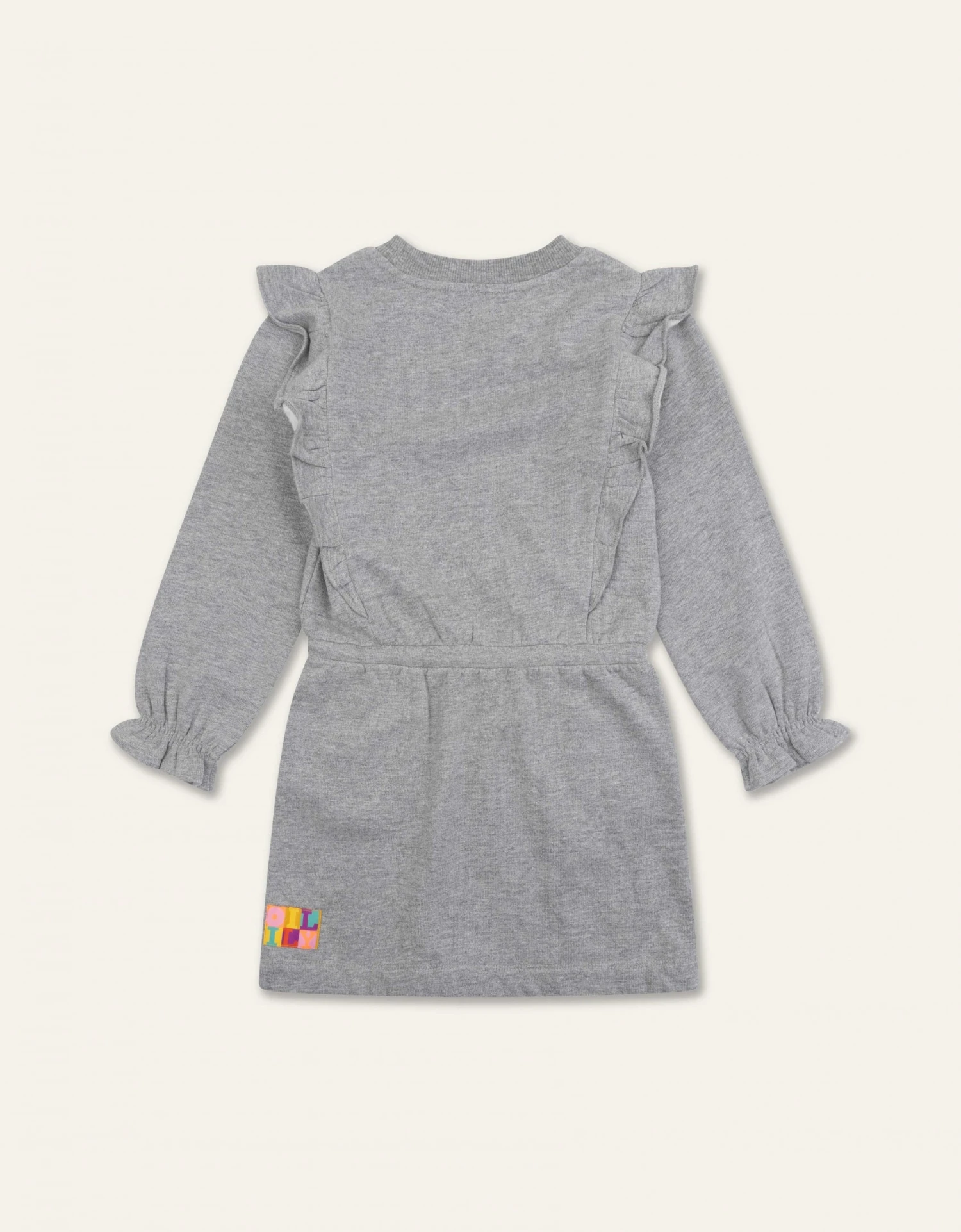 Sweater dress in sportieve grijze kleur met genoeg kleurrijke details voor veel vrolijkheid. De jurk heeft ruches langs de gehele voorkant tot de taille en bij de manchetten. Op je buik een vrolijke, gestikte logo badge en om je middel roze logo koords met rubberen tips.