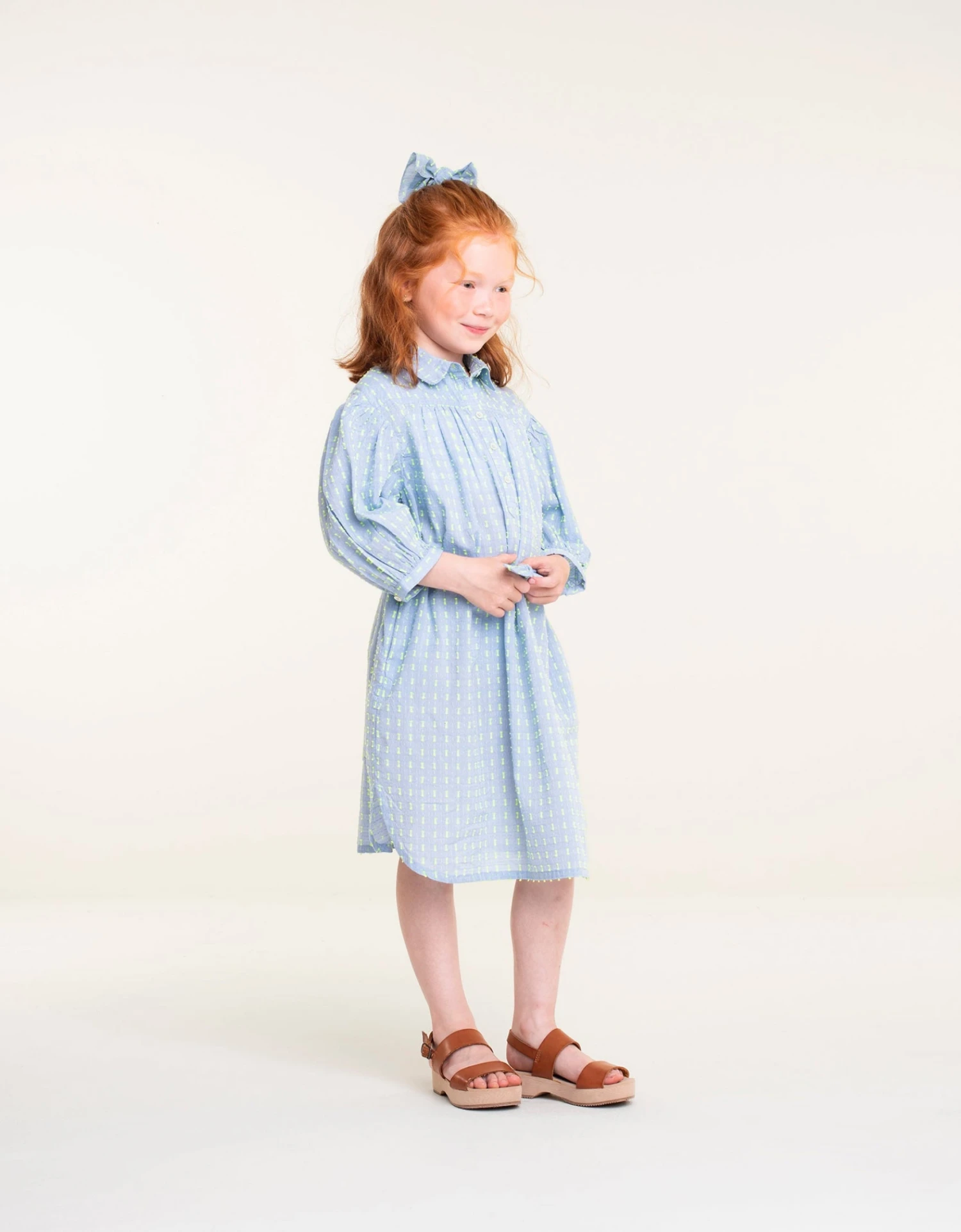 Midi-jurk van 100% katoen in een speelse combi van ijsblauw en neongroen. Op de mouwen zie je gedetailleerde stikselpatronen in heerlijk groen dat mooi past bij de knoopjes en de vrolijke stippen. Met knoopsluiting en bijpassende ceintuur. – Extra relaxed fit – Midi-jurk – 100% katoen
