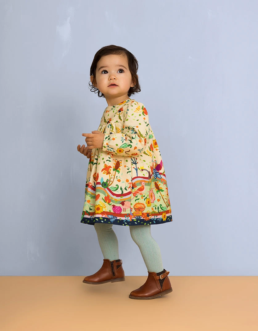 Lekker stevig, stug katoen is gebruikt zodat deze jurk haar mooie vorm houdt, hoeveel rondjes je ook draait. Gemaakt met de vrolijke print Animal Garden Flowers.