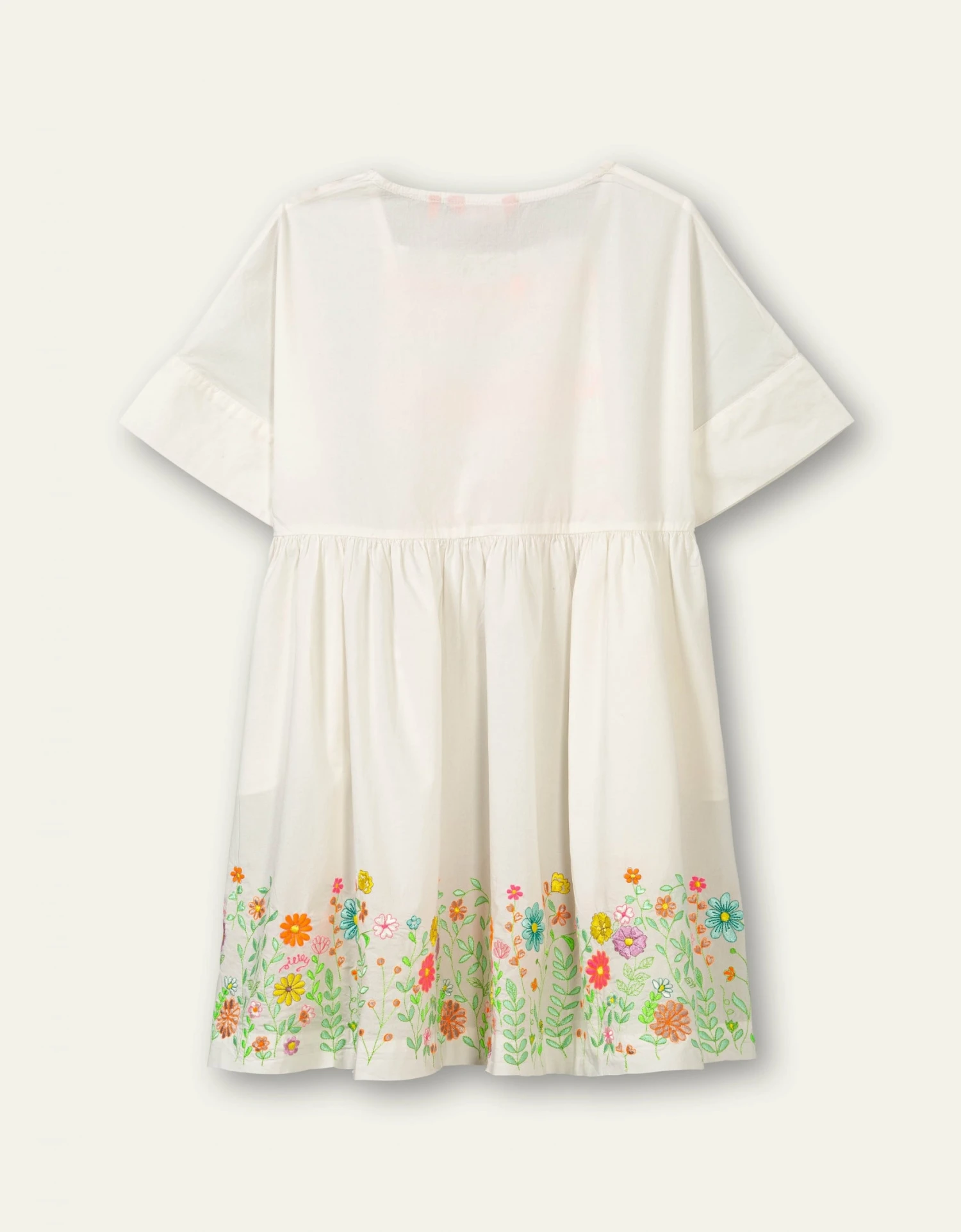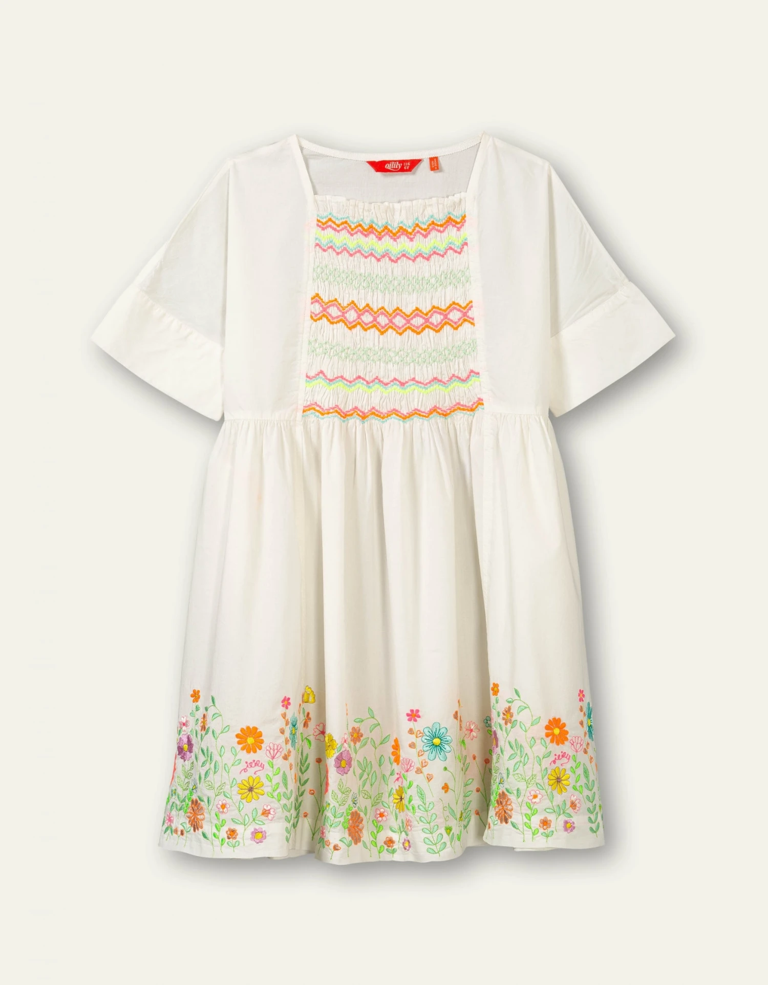 Een lenteprinses, een zomerkoningin of feest-feetje; wie je ook wilt zijn, in dit jurkje ben je het. Het smockwerk met fluo-garen is handwerk en vormt een mooi contrast met het witte jurkje. Onderaan hebben we een veld vol bloemen geborduurd. – 100% Katoen – Relaxed fit
