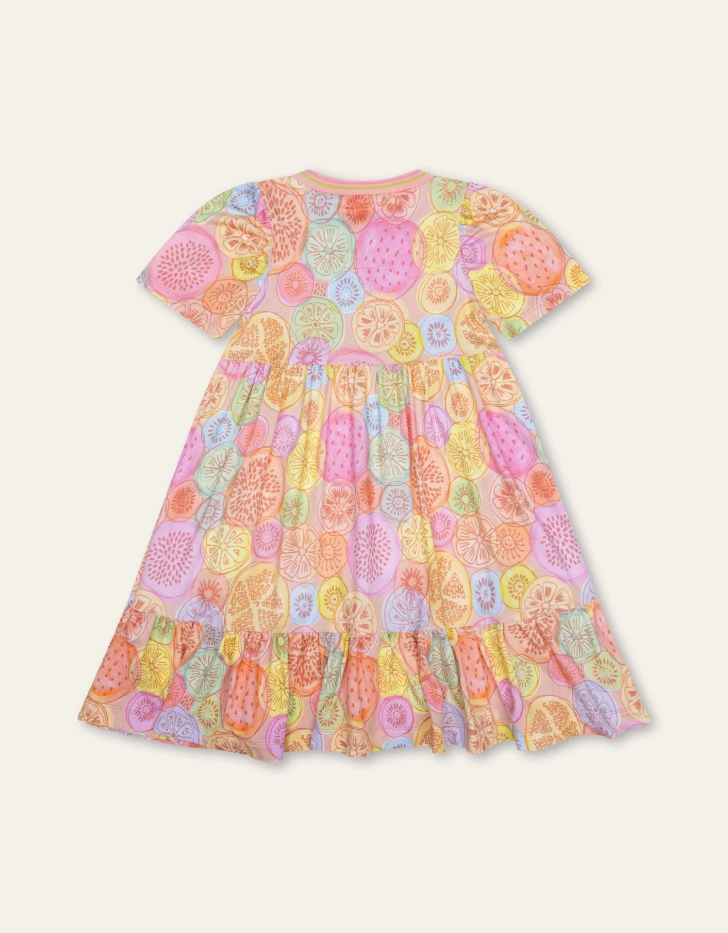 Fruit is altijd lekker maar misschien nog wel meer als de zon schijnt. Dessin Tutti Fruity laat allerlei heerlijk gesneden fruit zien in al hun rijke kleuren. Sappig en gezellig op dit vrolijke jurkje.