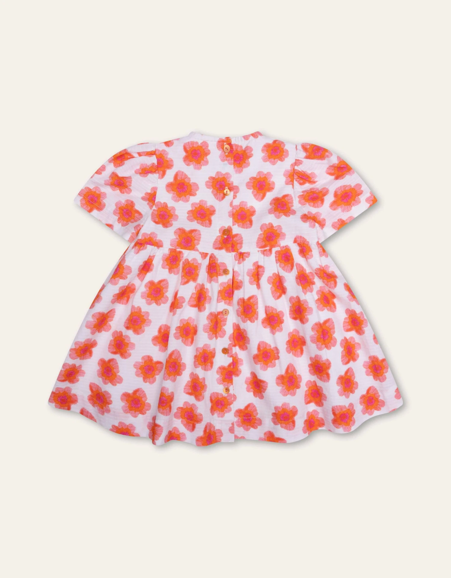 De bloemen van dessin Butterfly Flowers zijn met de hand—streepje voor streepje—getekend. Op dit geweven katoenen jurkje staat het heel dromerig en luchtig.