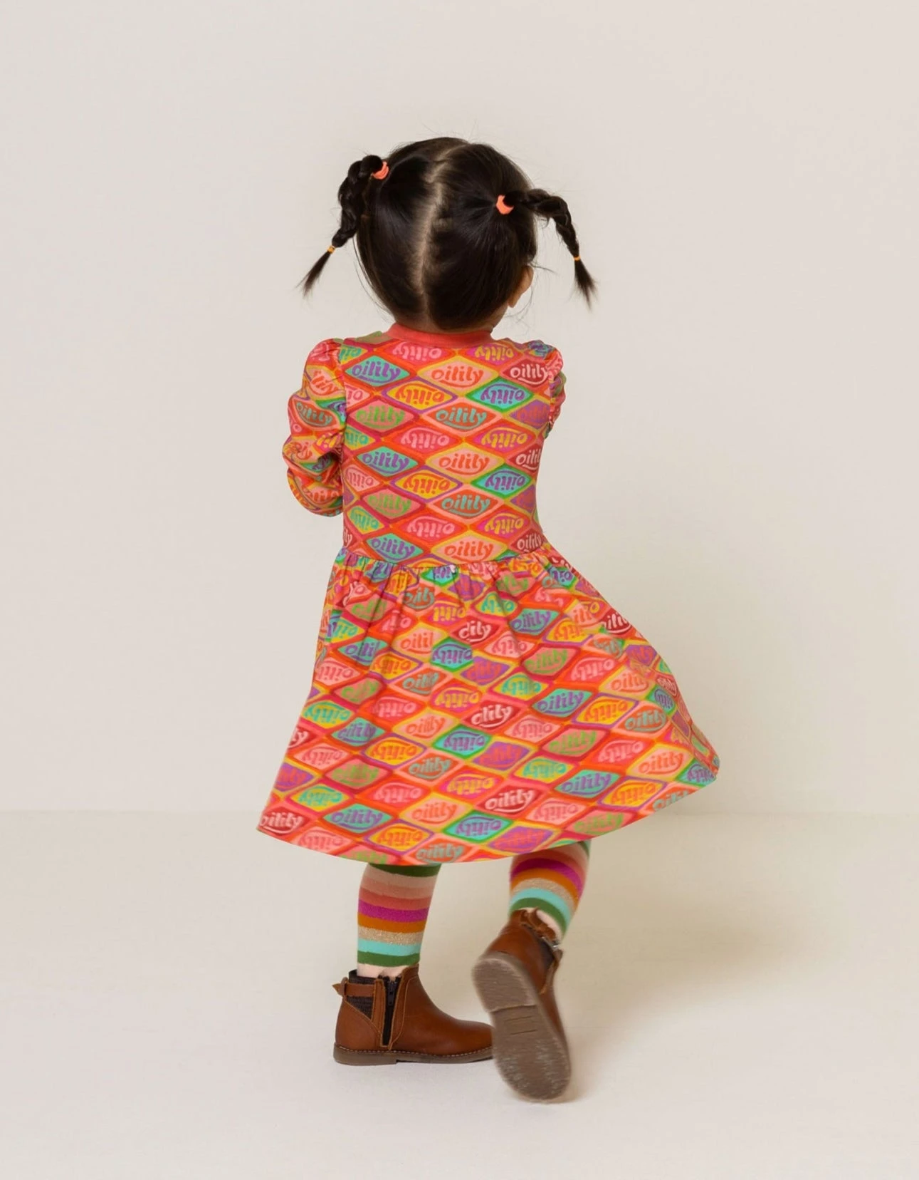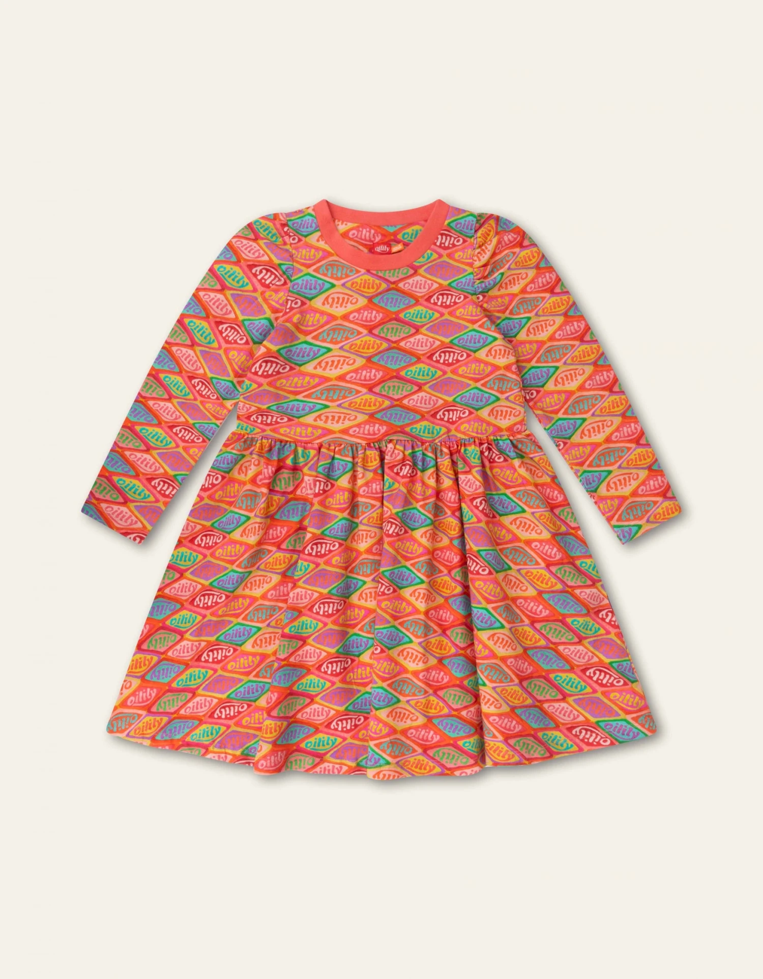 Hoeveel kleuren ken jij al? We hebben ze allemaal gebruikt om ons logo over te trekken en een gezellige print te maken voor deze jurk. De pofmouwen, plooitjes in de rok en crewneck maken het nog vrolijker. – Organisch katoen met stretch – Regular fit – Gemaakt in Portugal