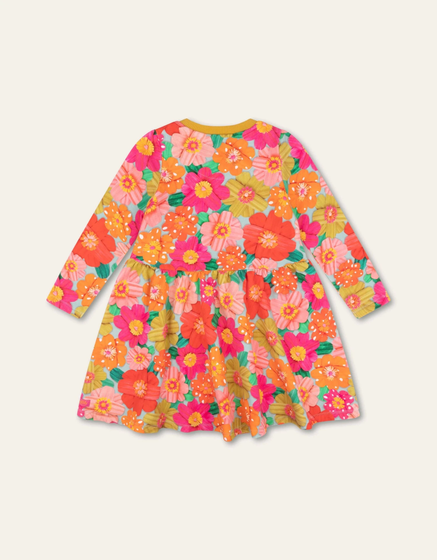 Fit en flare jurkje met de gezellige bloemen van ons Cardboard Flowers dessin. De kleuren en vormen vragen om een extra rondje zwieren.