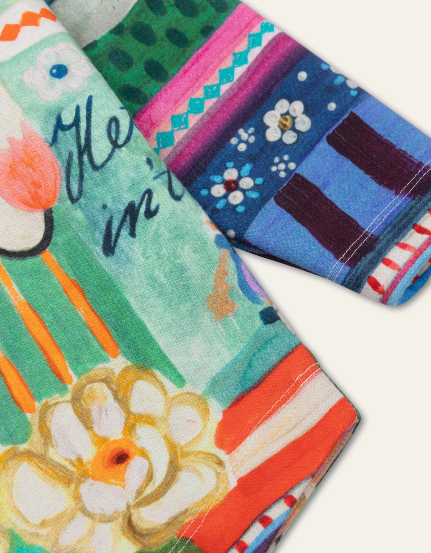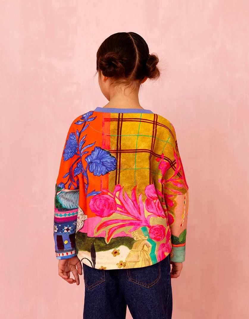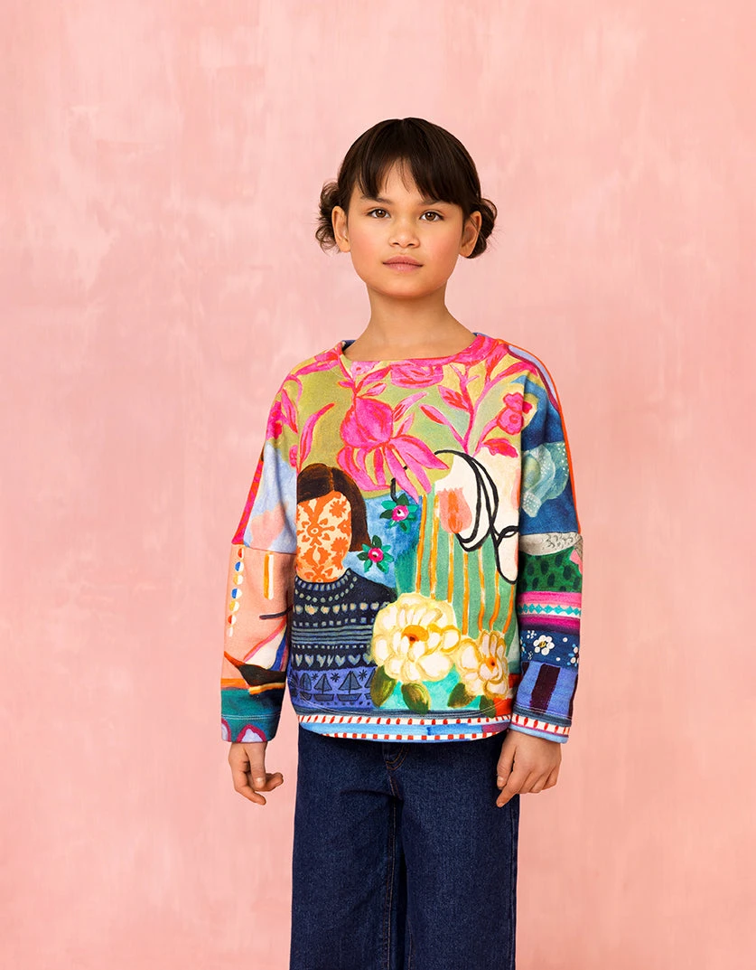 Bewonder de handgeschilderde vormen van de print Tissle Cheese met boten, bloemenweiden en meer, geïnspireerd door Schotland en Schokland. De onderkant van deze zachte trui is rond.