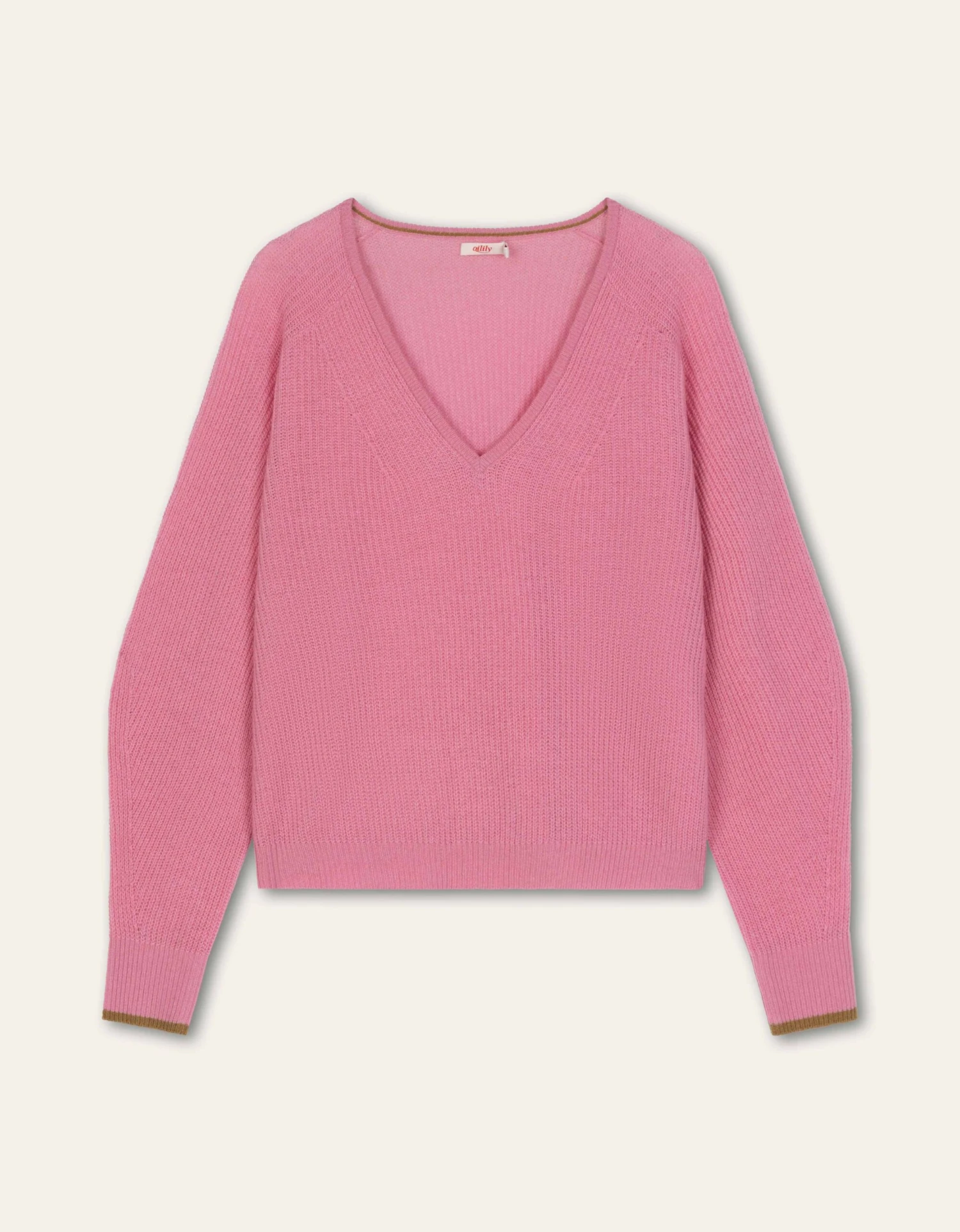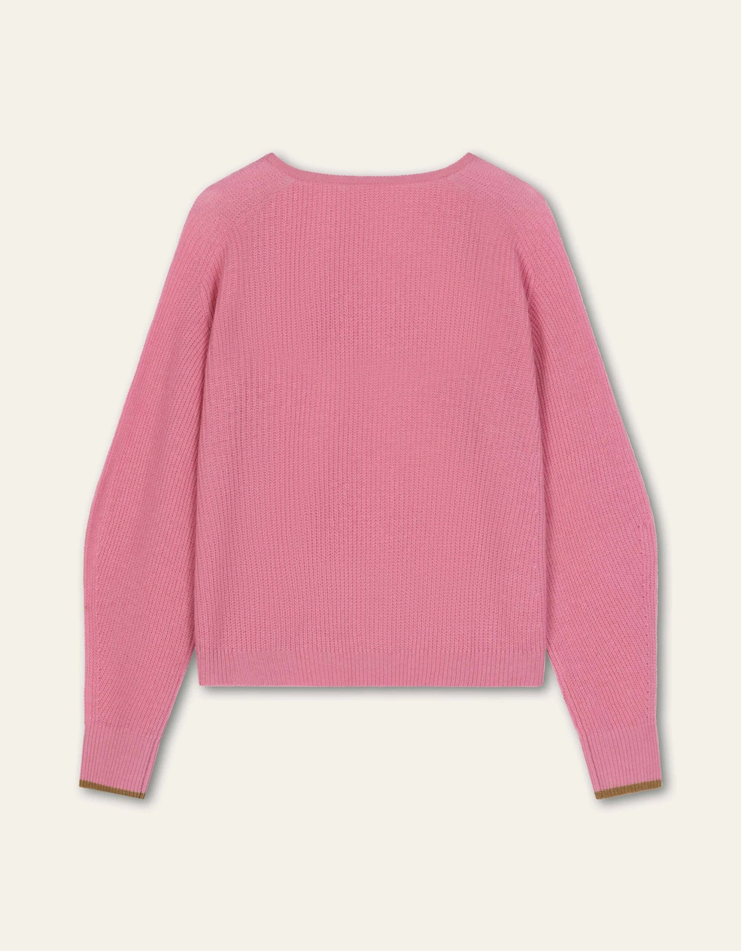 Losvallende trui met ruime V-hals en gemaakt van wol met kasjmier met leuke contraststreep bij de mouwen. Deze trui is warm, maar toch heel licht om te dragen en dat maakt het een perfect transseasonal item.