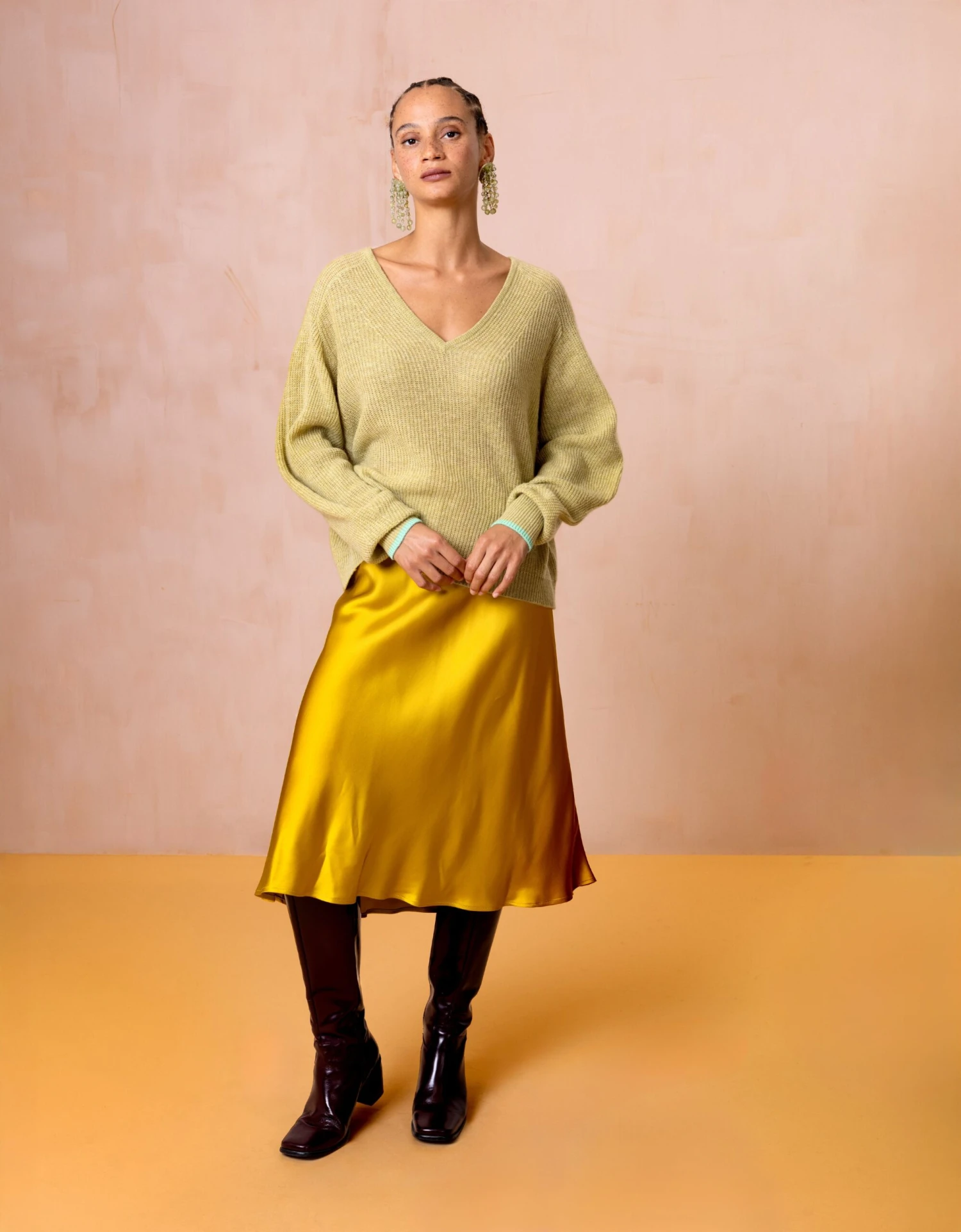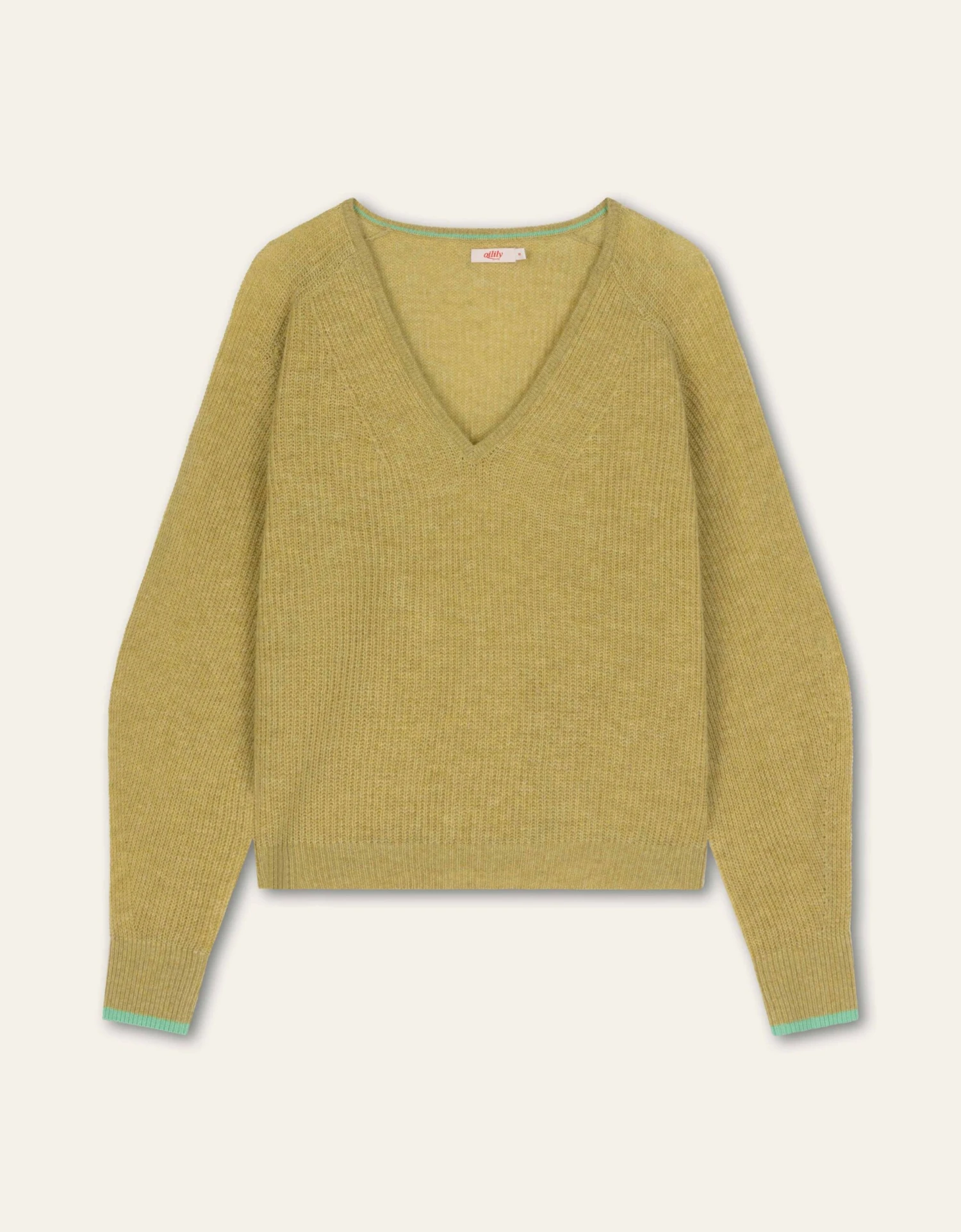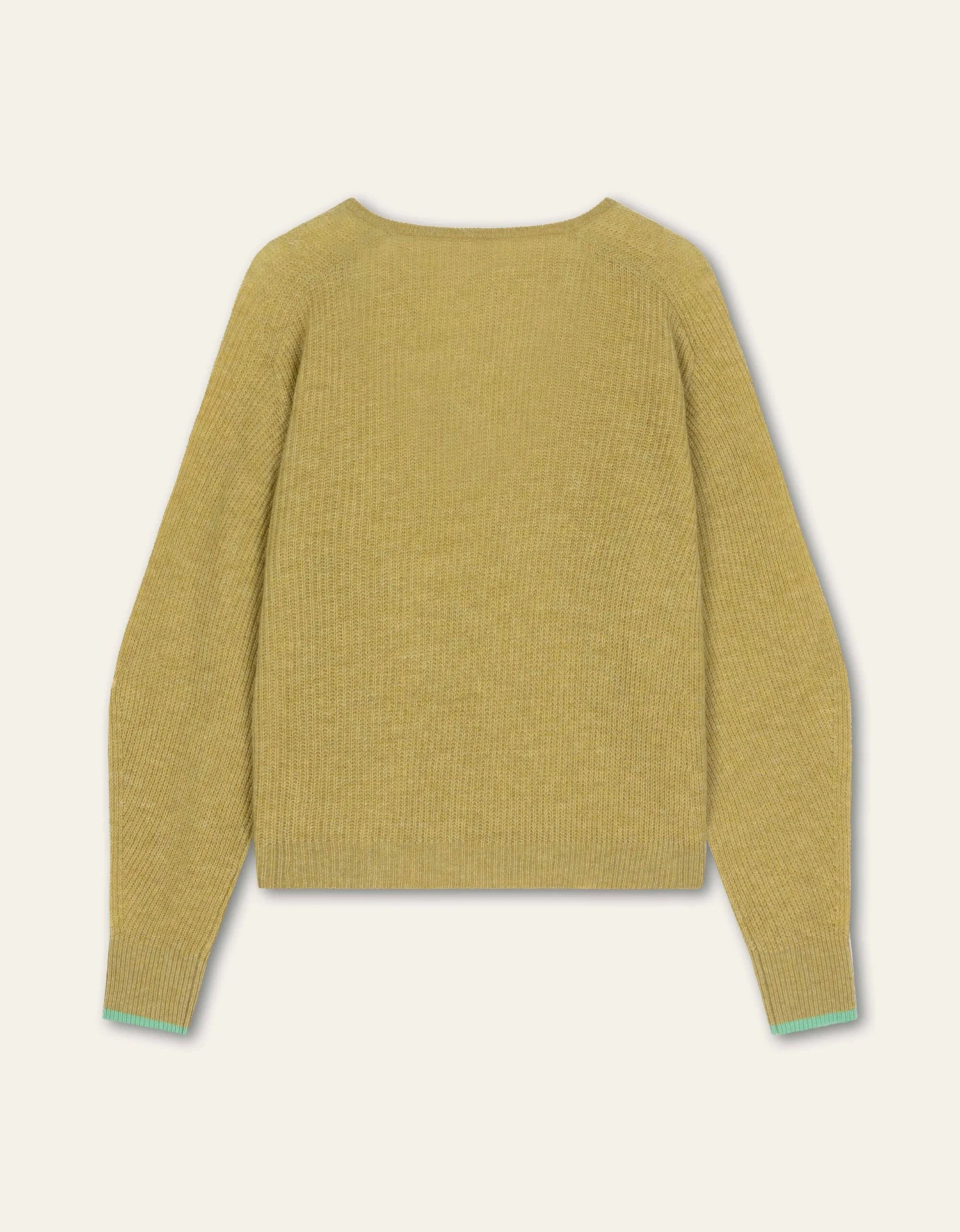 Losvallende trui met ruime V-hals en gemaakt van wol met kasjmier met leuke contraststreep bij de mouwen. Deze trui is warm, maar toch heel licht om te dragen en dat maakt het een perfect transseasonal item.