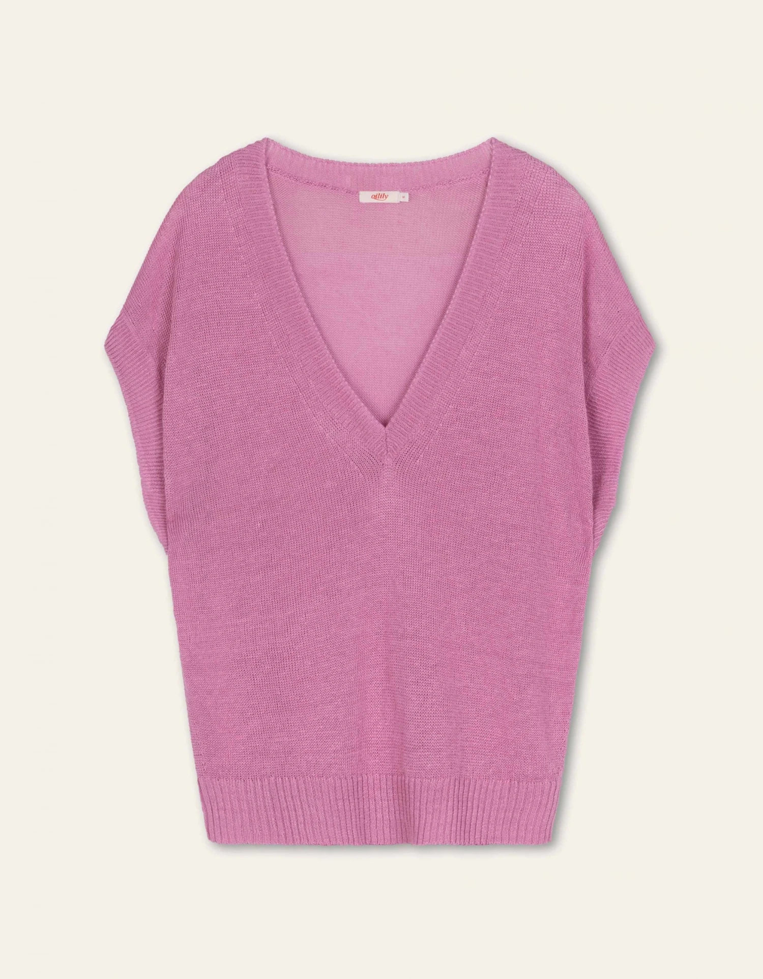 Gemaakt van 100% linnen garen waardoor deze top een natuurlijk reliëf heeft met structuur en lichte transparantie. De diepe V-hals geeft het nog een extra zomers gevoel.