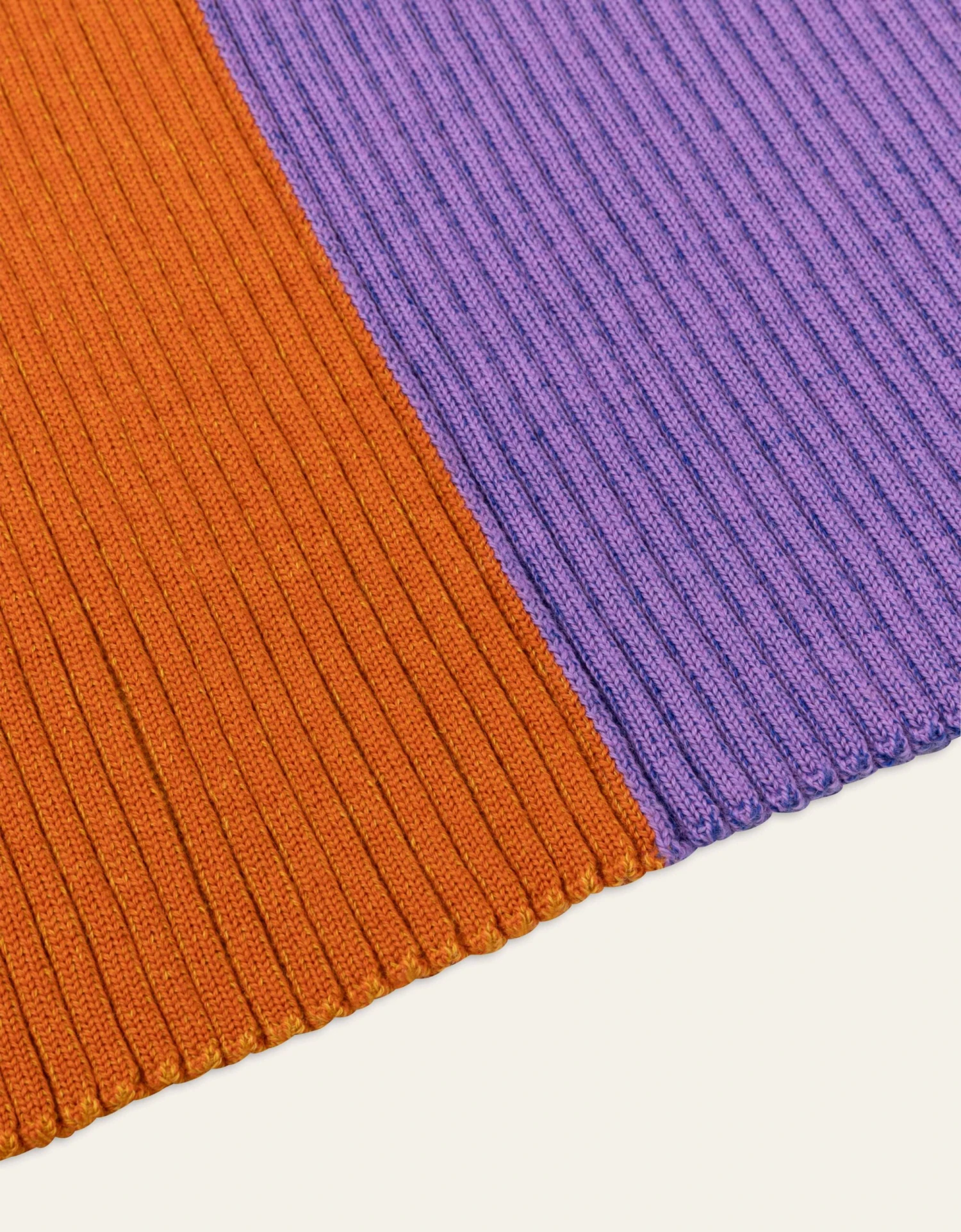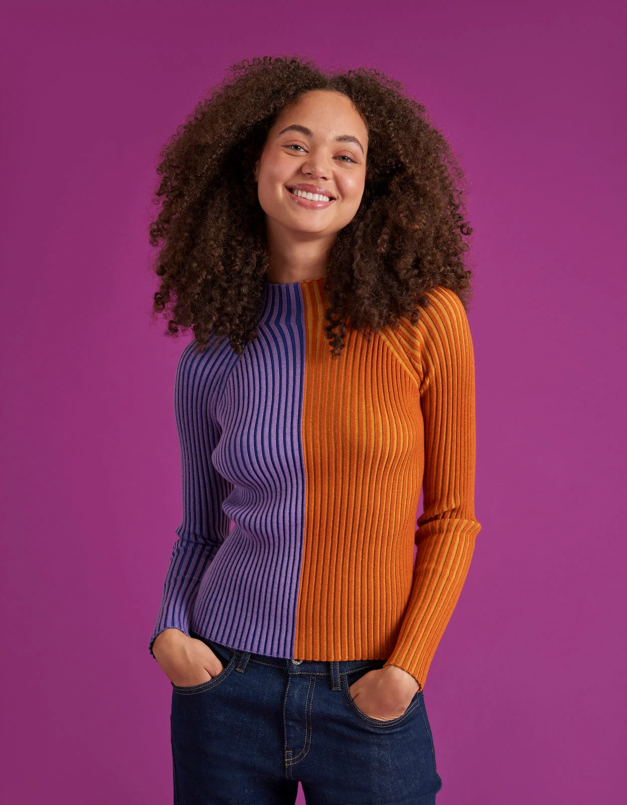 Voor een warme, fashionable look is deze body fitted top perfect. Intarsia gebreid (naadloos) met Italian yarn in twee kleuren die je soms door elkaar heen ziet terwijl het op het eerste oog alleen een speelse, horizontale colourblock lijkt. De schouders zijn in vorm gebreid, net als de turtle neck.