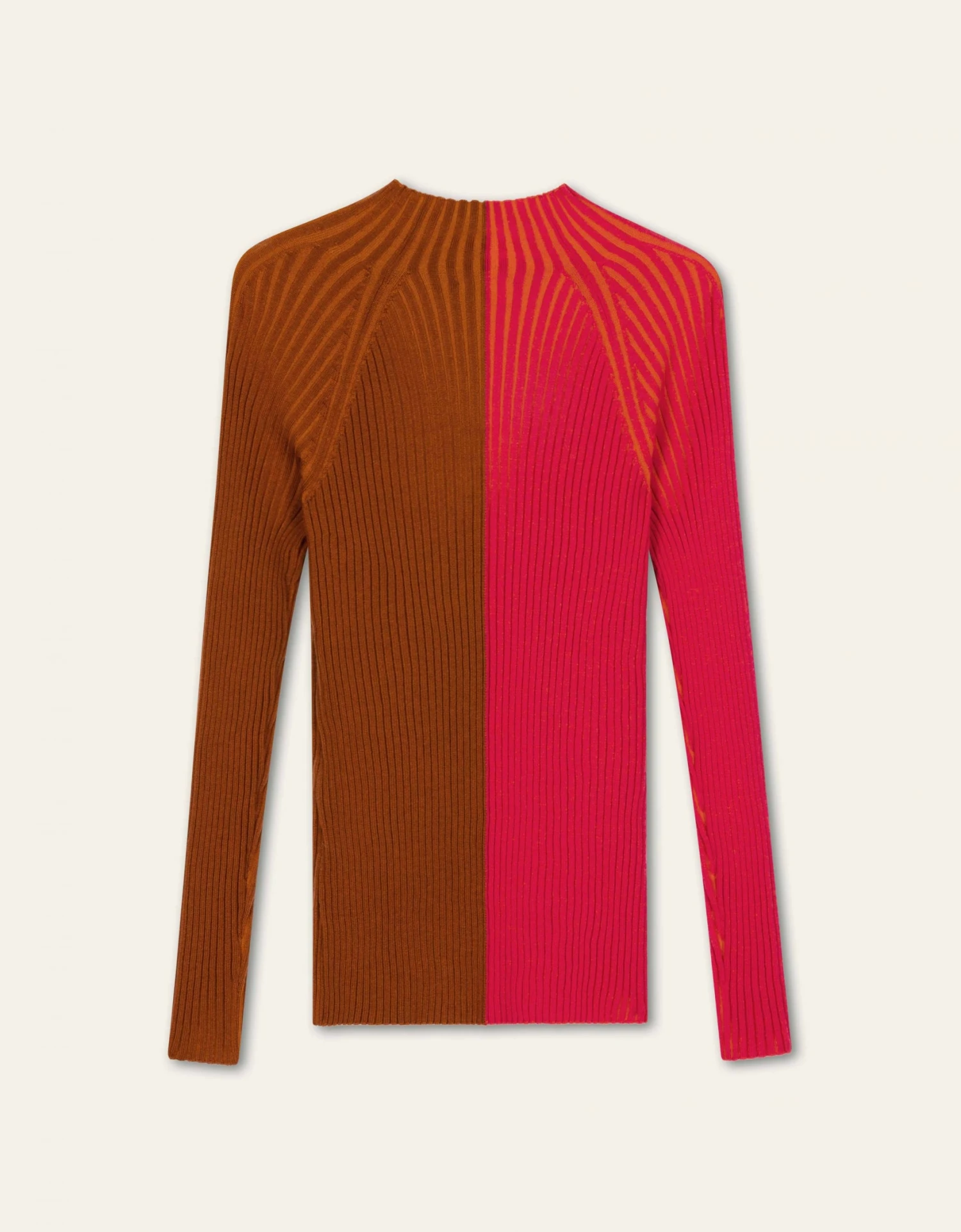 Voor een warme, fashionable look is deze body fitted top perfect. Intarsia gebreid (naadloos) met Italian yarn in twee kleuren die je soms door elkaar heen ziet terwijl het op het eerste oog alleen een speelse, horizontale colourblock lijkt. De schouders zijn in vorm gebreid, net als de turtle neck.