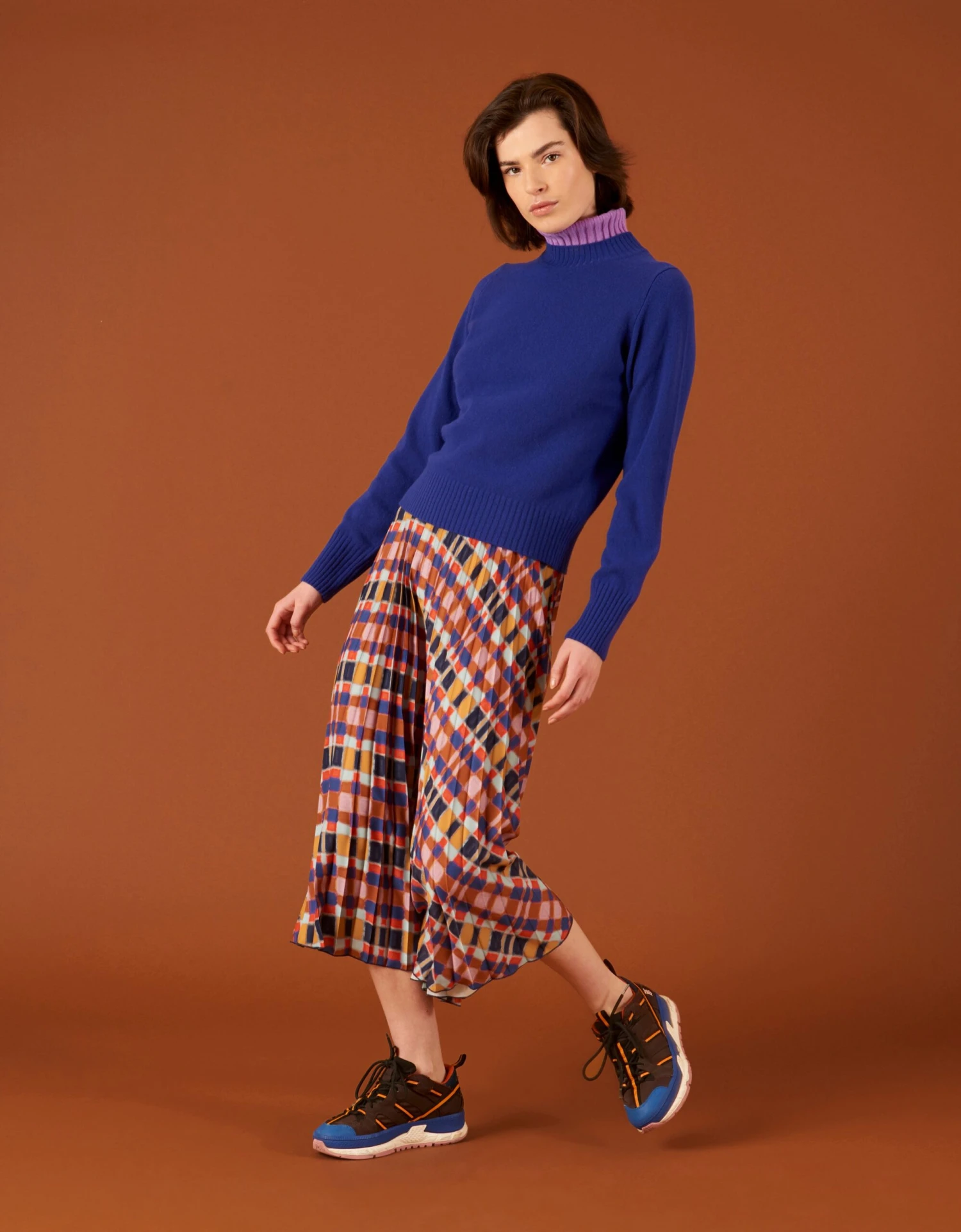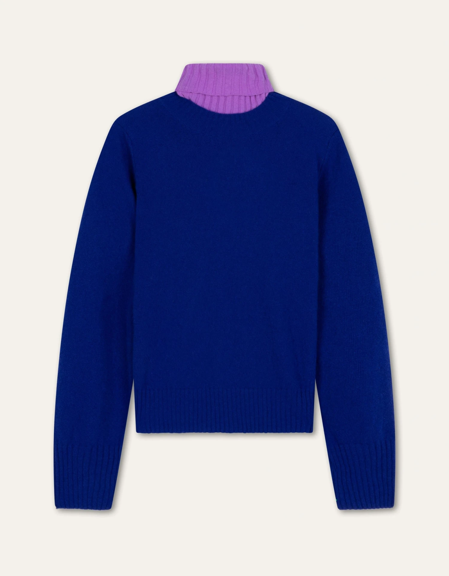 Voor deze fitted knitted pullover gebruikten we traceerbaar garen waarbij de wol terug te herleiden is naar de schapenboerderij. We hebben de col in een contrastkleur gebreid waardoor het lijkt alsof je twee lagen draagt. Door de slim fit kan je deze coltrui heerlijk met meerdere lagen combineren.
