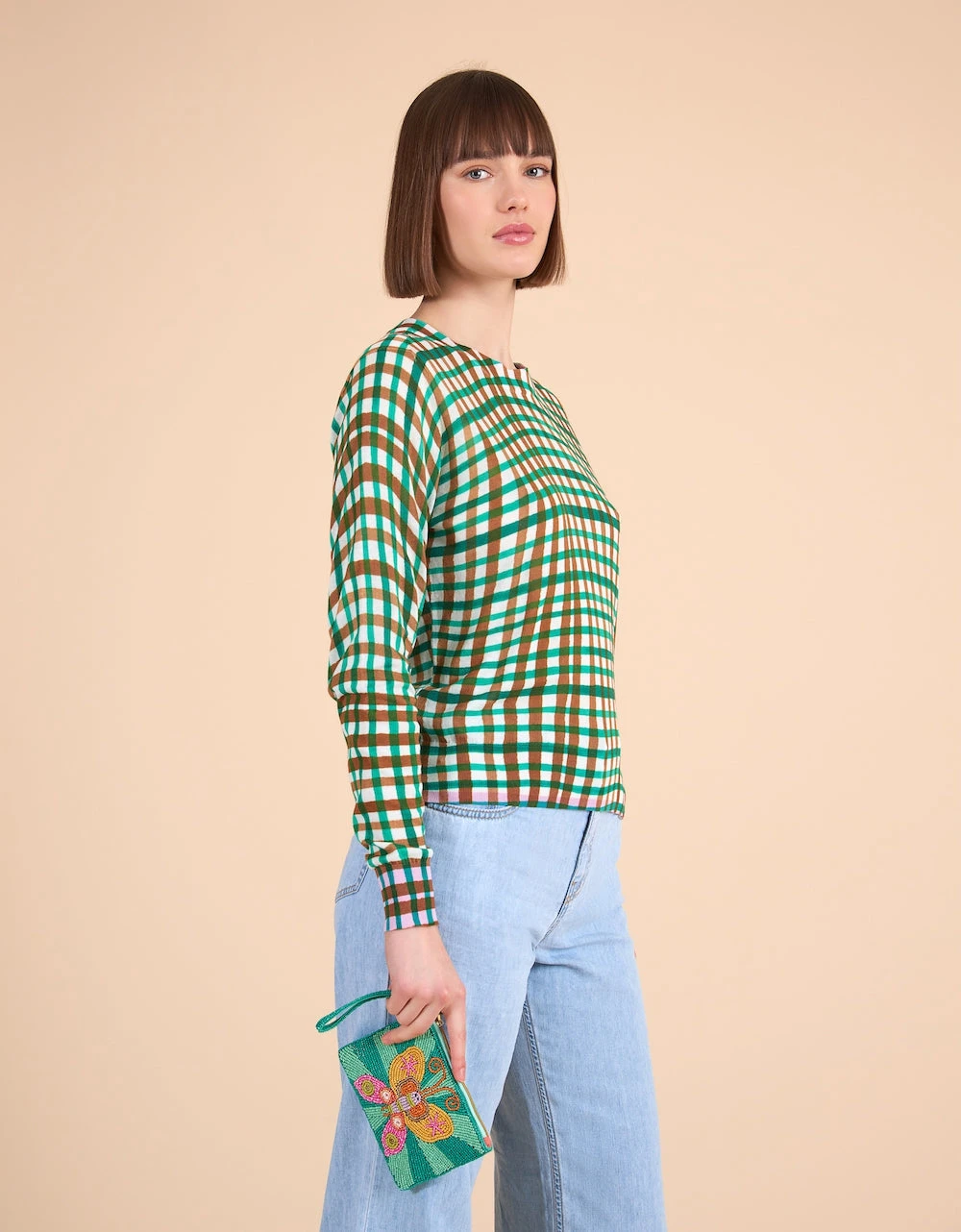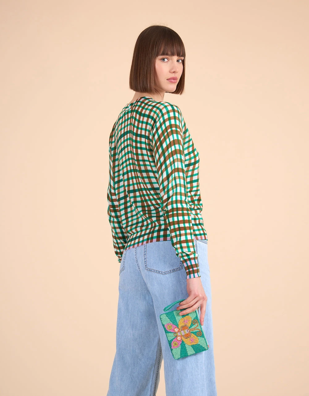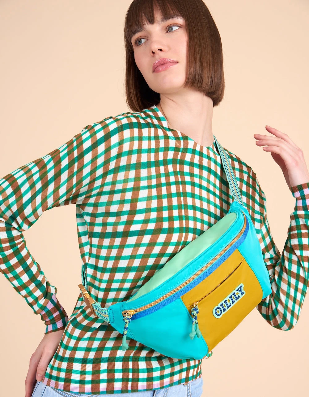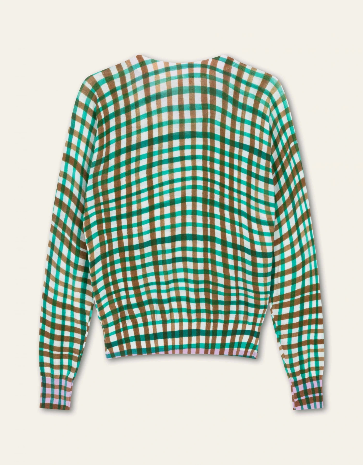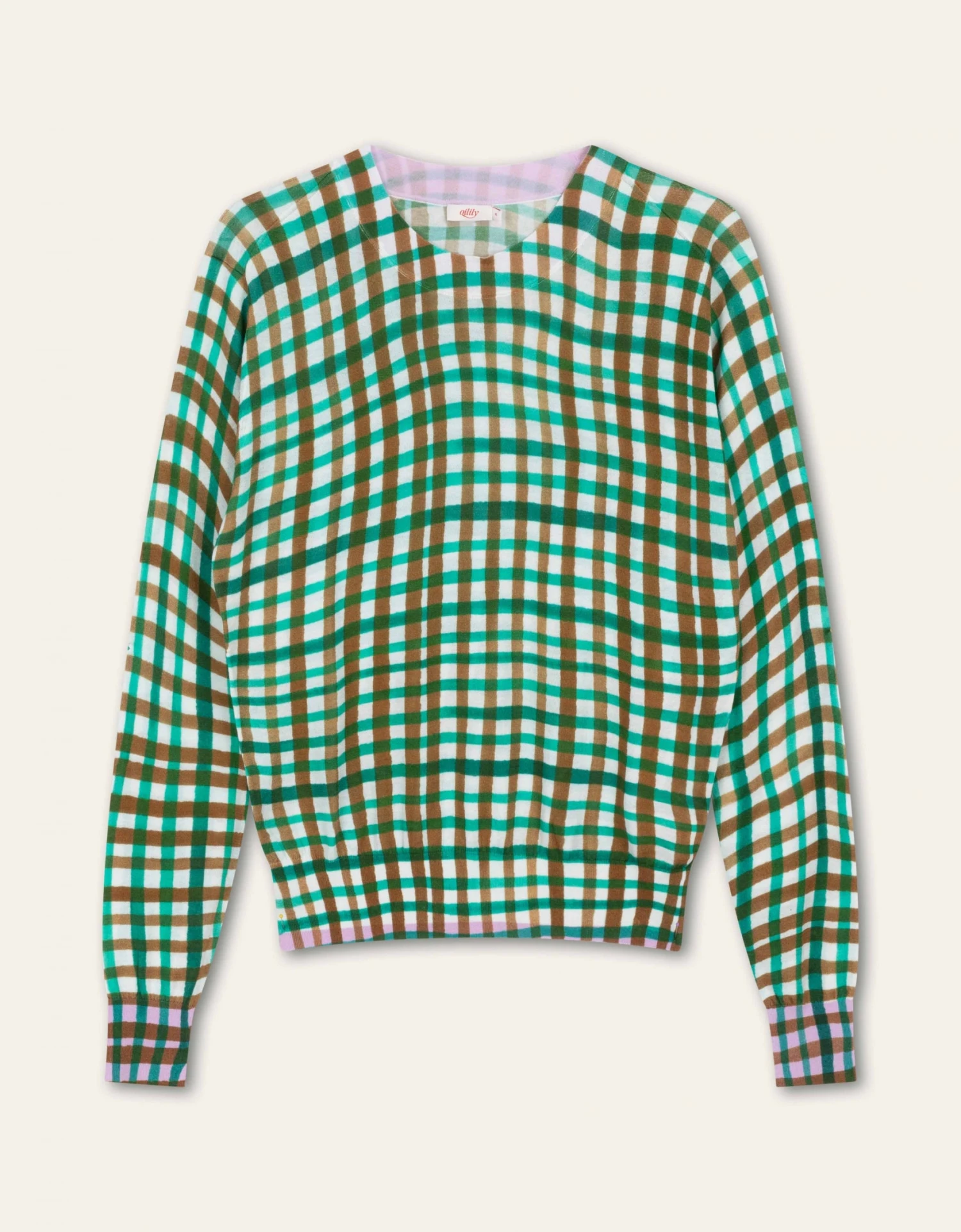 De ruitjes staan speels en voor extra lente vrolijkheid zie je aan de binnenkant van de hals, manchetten en zoom een felle contrast kleur.